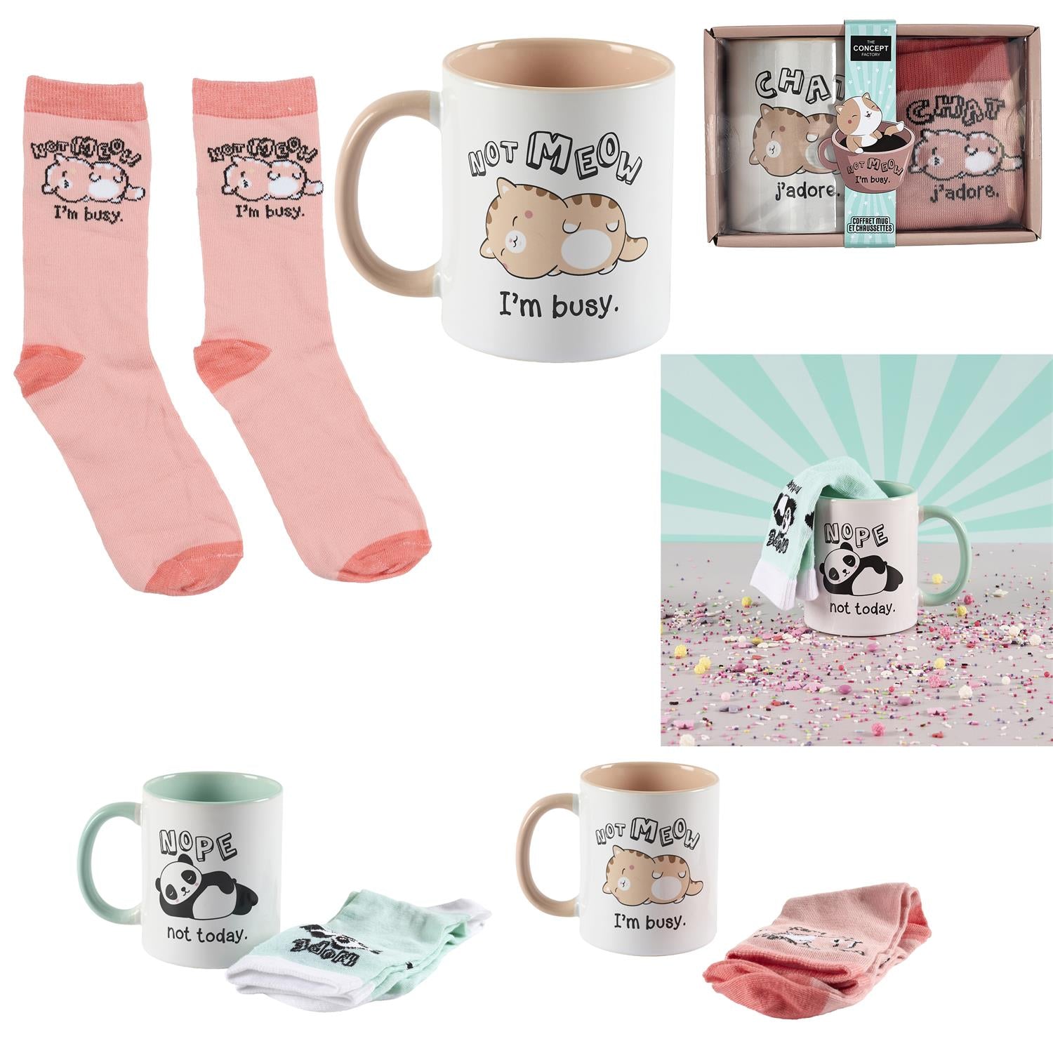 Balta krūze ar bēšīgu rokturi un iekšpusi, apdruka ar kaķīti un uzrakstu “Not Meow – I’m busy”. Komplektā rozā zeķes ar kaķīša apdruku.