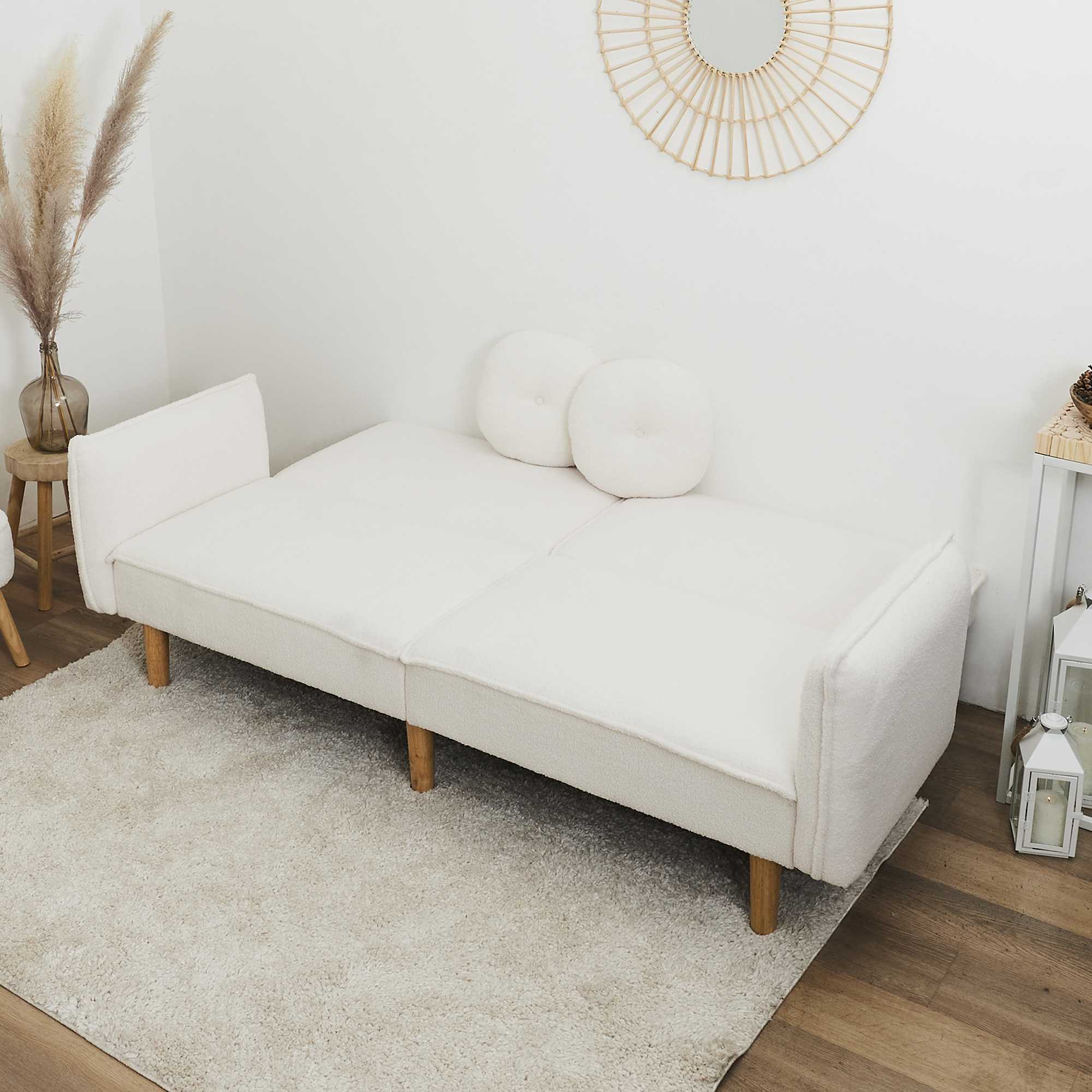Elegants, mīksts un funkcionāls dīvāns, kas lieliski iederas modernā, skandināvu vai minimālisma interjerā. Pateicoties bouclette audumam, tas izskatās īpaši mājīgi un rada siltu, estētisku atmosfēru. Dīvāns ir viegli pārveidojams par gultu, padarot to par ideālu risinājumu viesistabai, studijas tipa dzīvoklim vai viesu istabai.