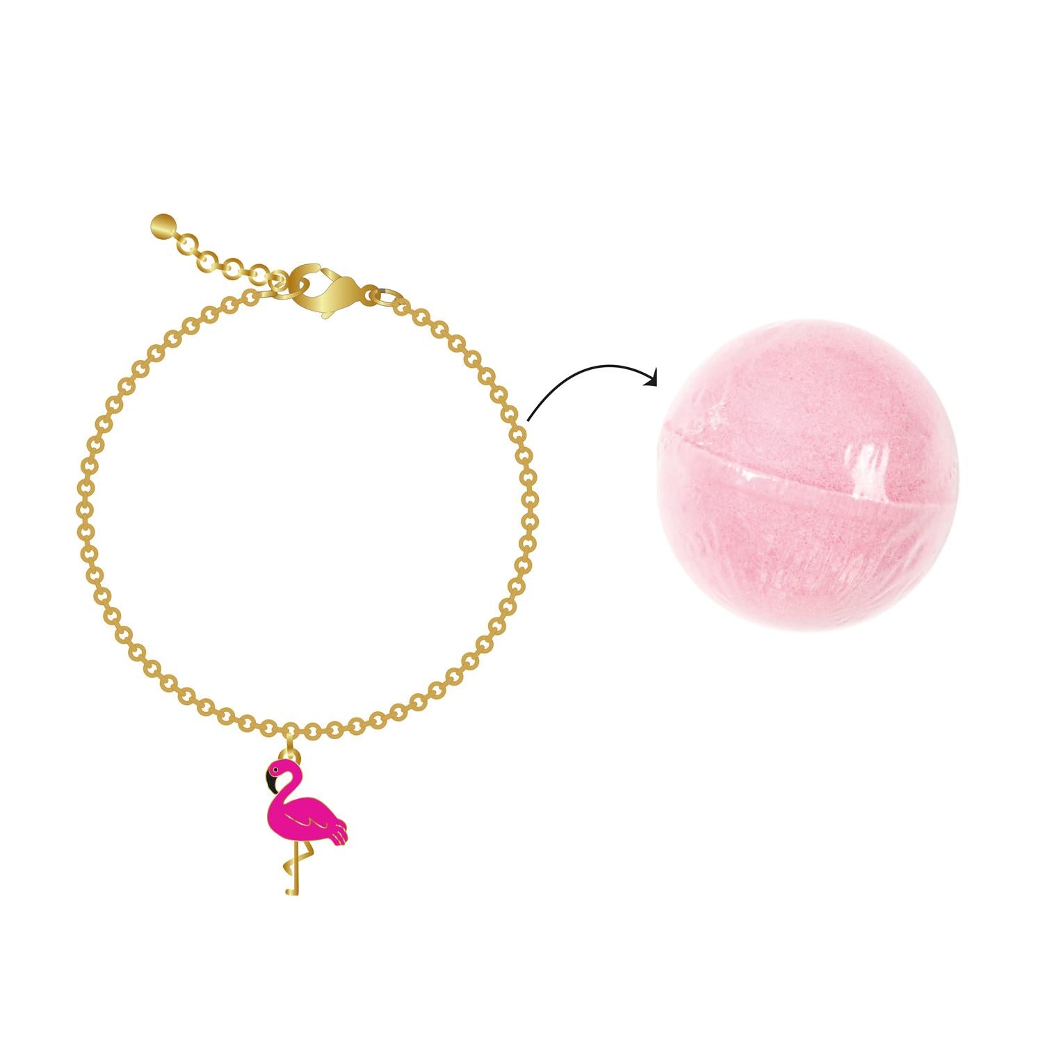 Vannas bumba lēnām izšķīst ūdenī, iekrāso to maigos pasteļtoņos un piepilda telpu ar saldu aromātu. Kad bumba izkūst, Tu atklāsi paslēpto rotaslietu – katrā bumbā atšķirīgs dizains: flamingo, ķepiņa, mākoņītis vai “bubble tea”.