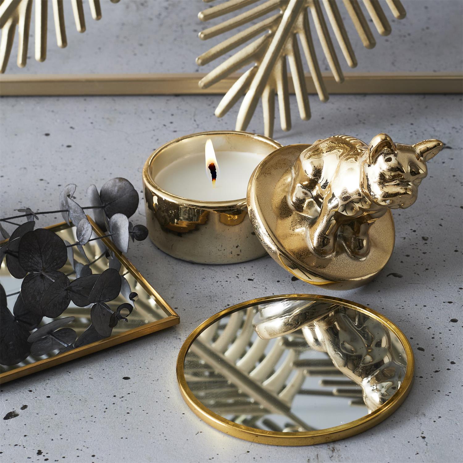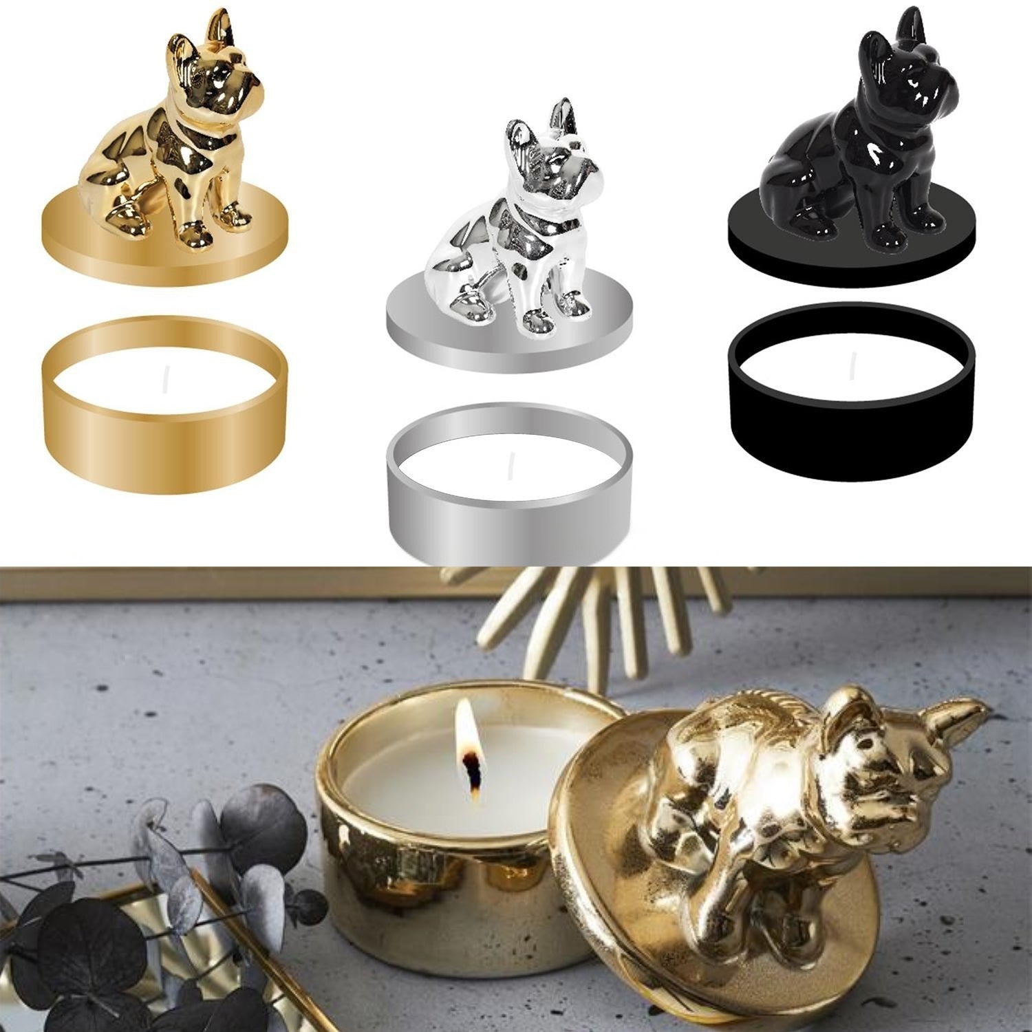 Sveces vāciņš veidots kā spīdīga buldoga skulptūra, kas kalpo arī kā dekoratīvs elements pēc sveces izdegšanas.