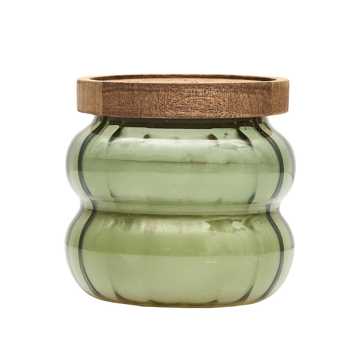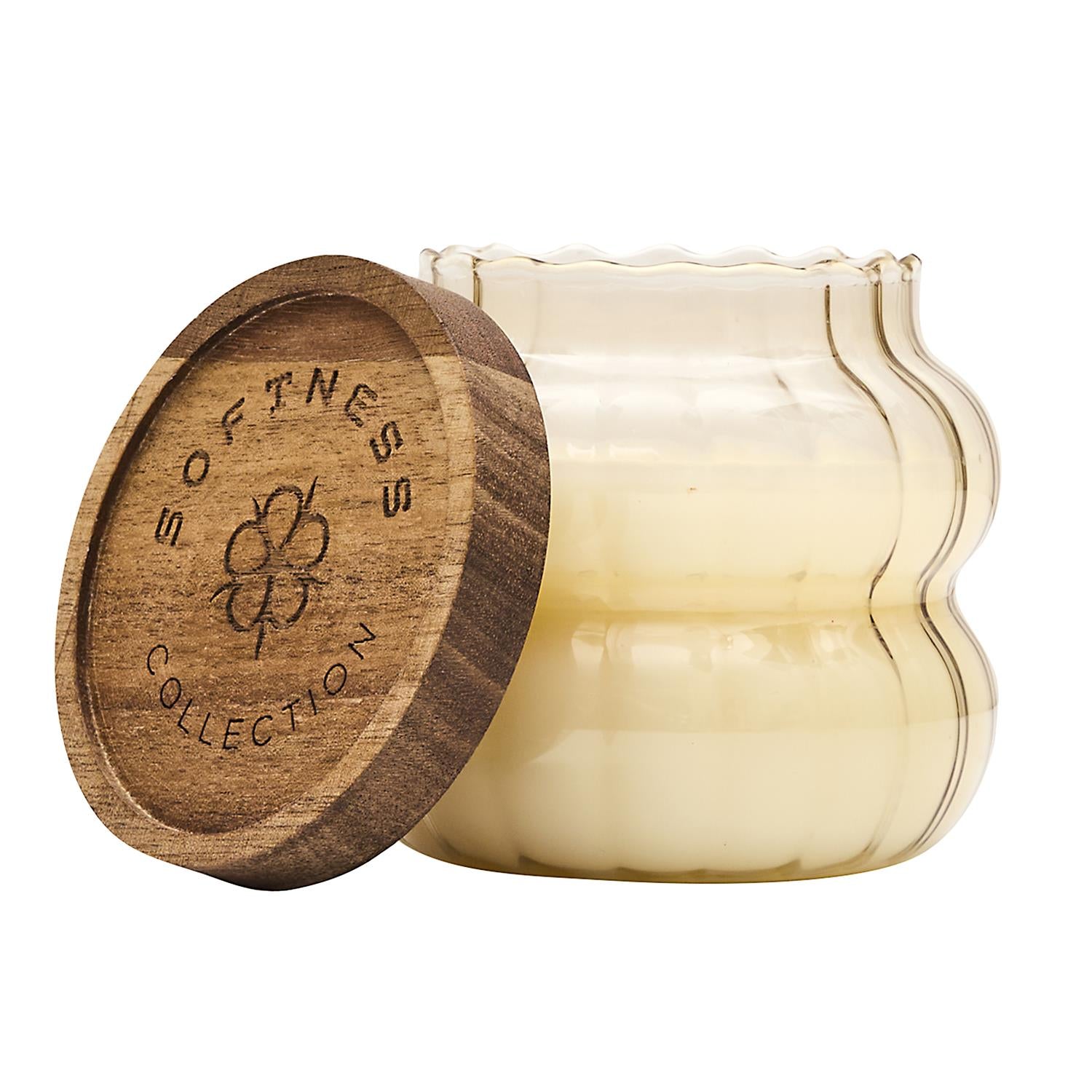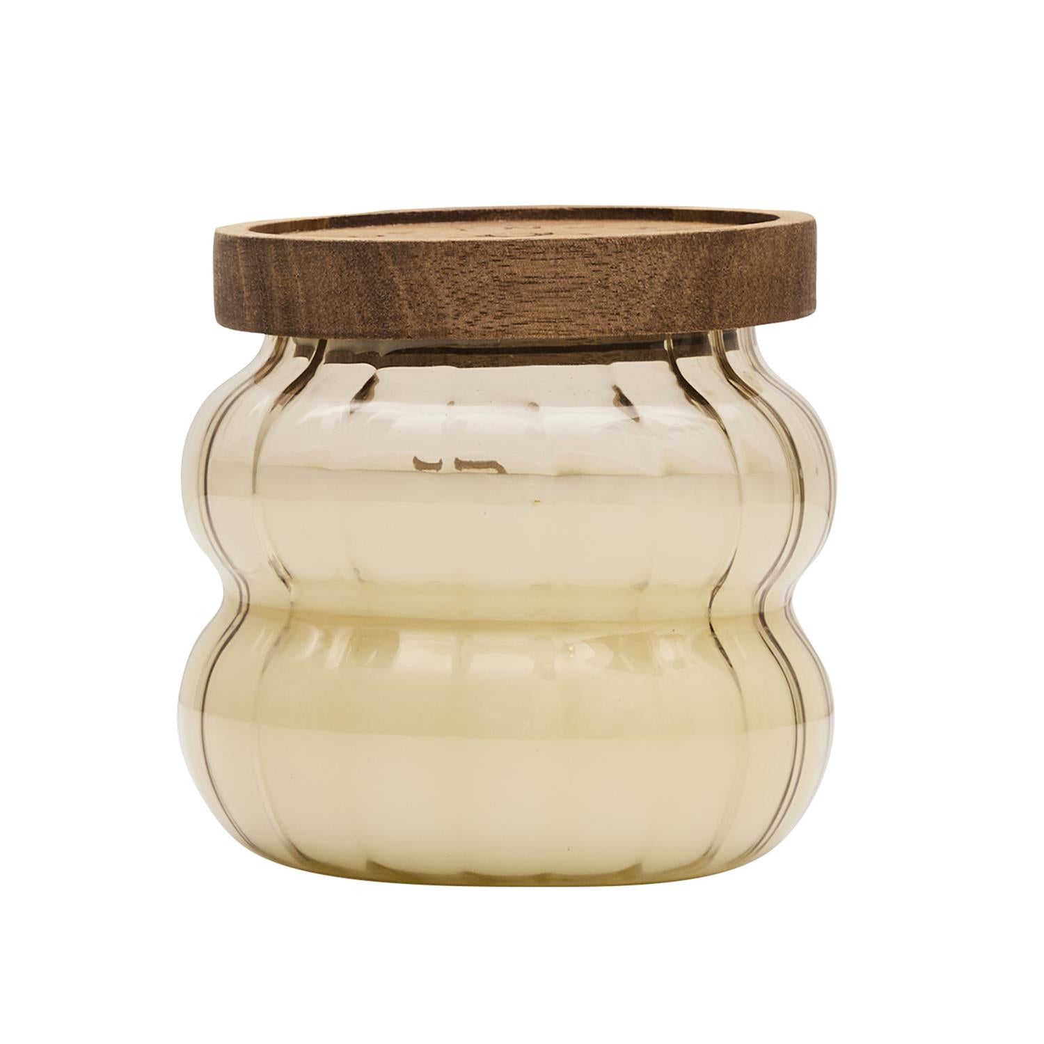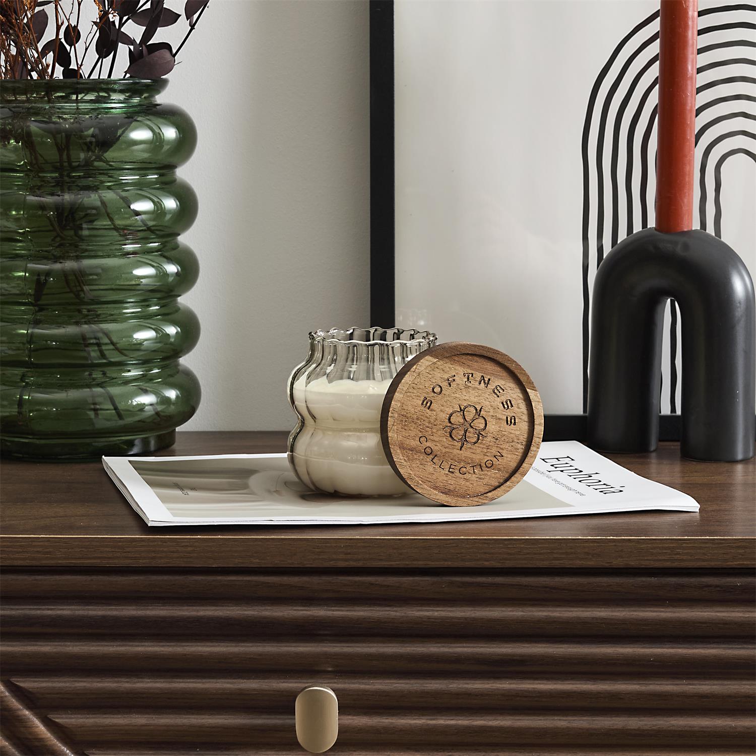 Eleganta dizaina aromātiskā svece rievotā stikla traukā ar dabīga koka vāciņu. Stilīgs akcents interjeram un mājīga noskaņas radīšanai ikdienā vai dāvanai.
