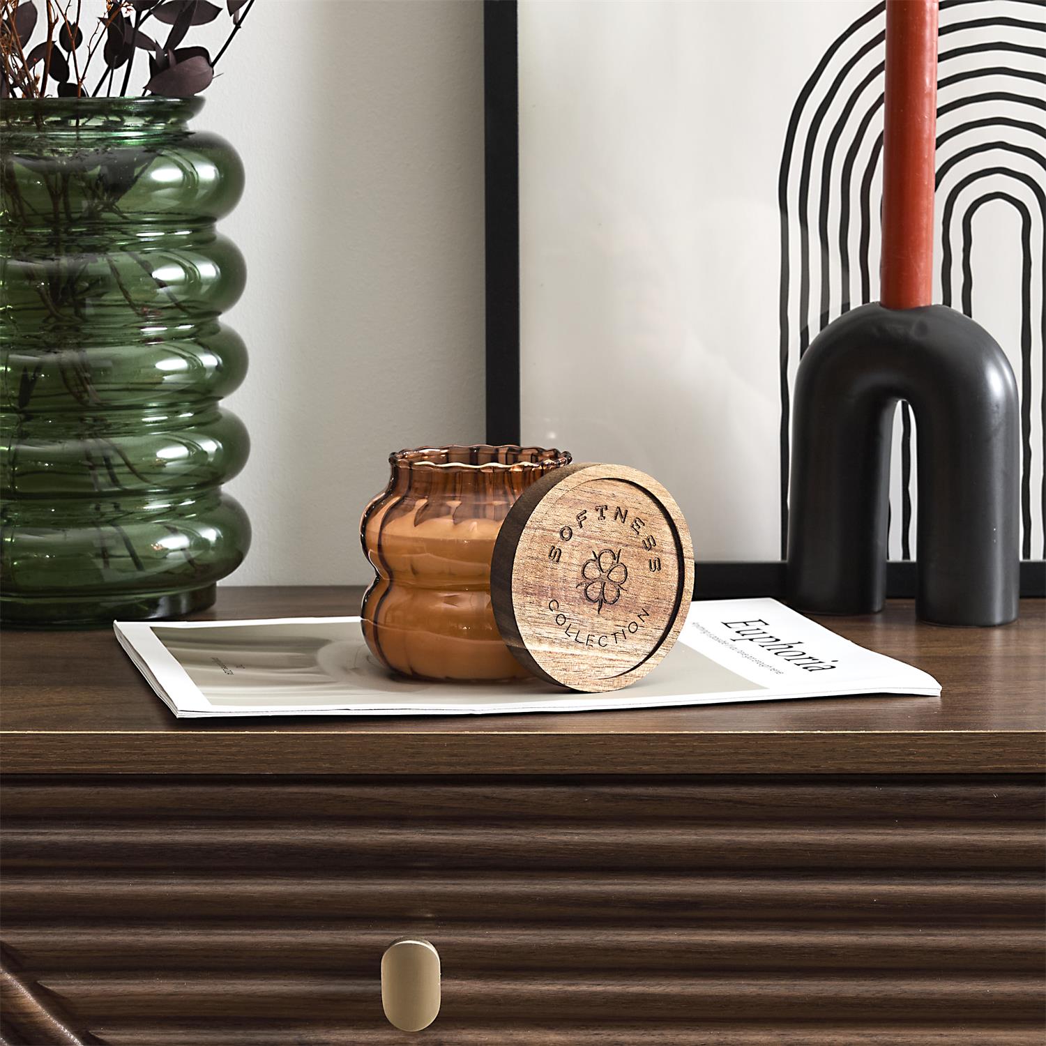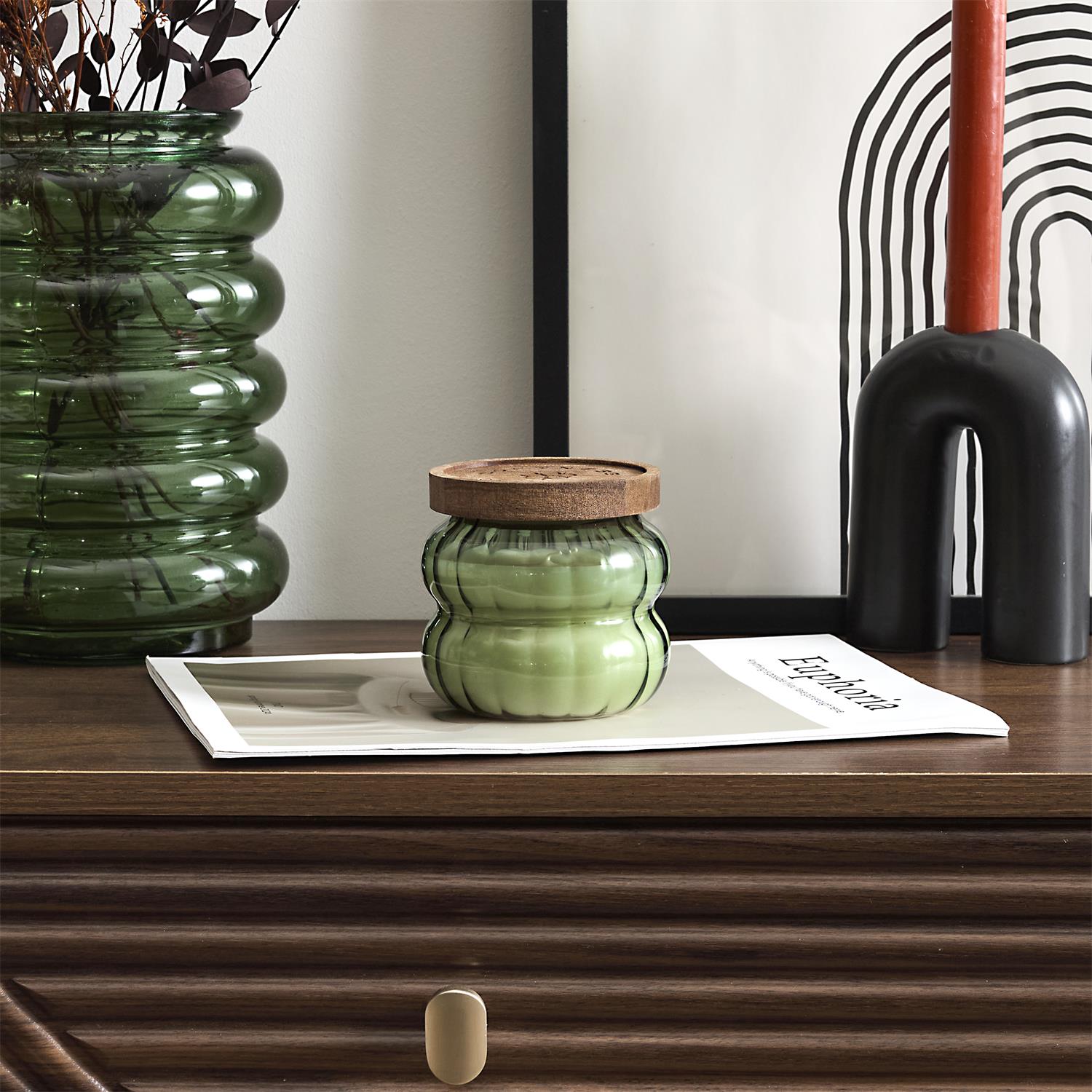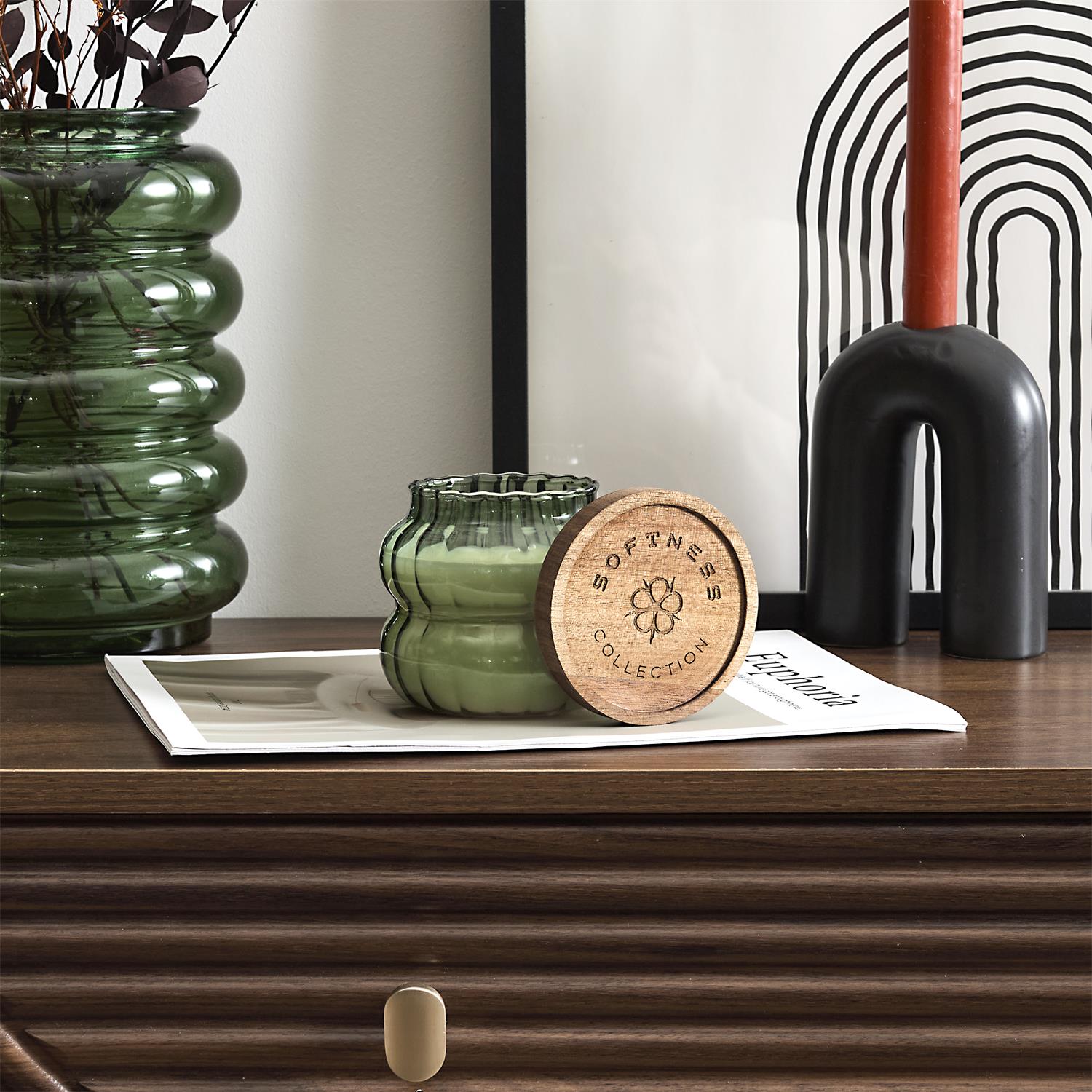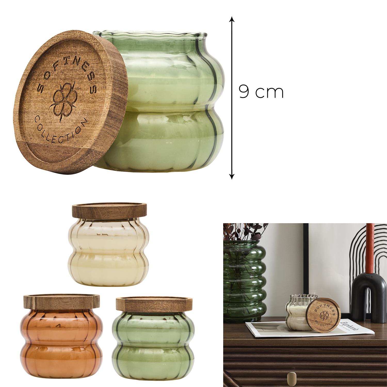 Eleganta dizaina aromātiskā svece rievotā stikla traukā ar dabīga koka vāciņu. Stilīgs akcents interjeram un mājīga noskaņas radīšanai ikdienā vai dāvanai.