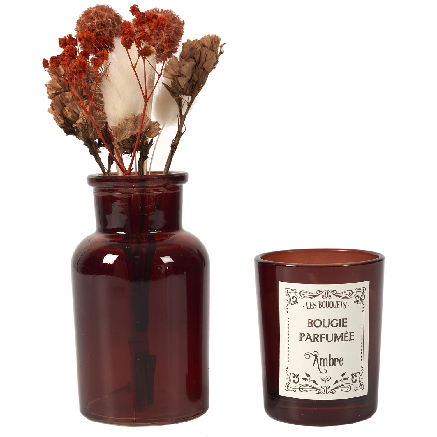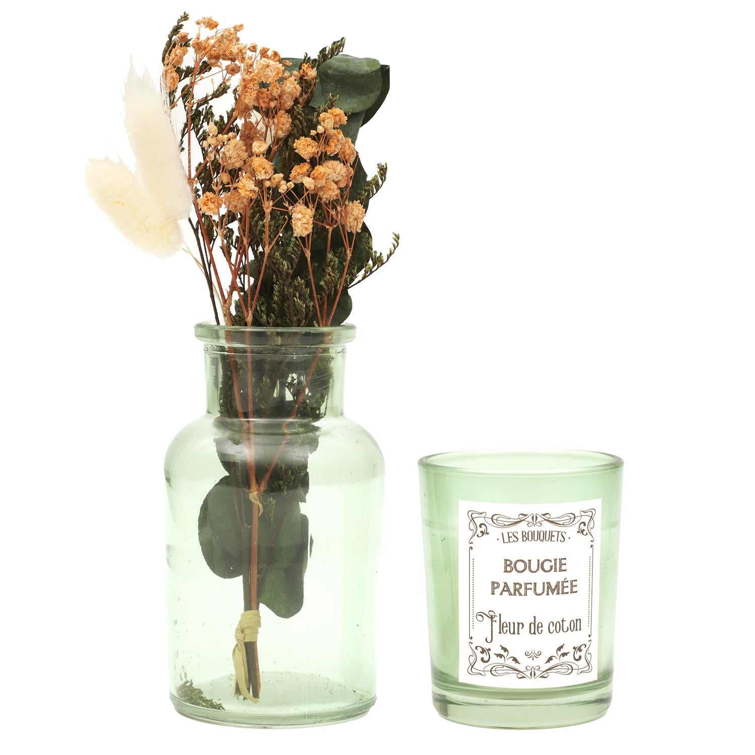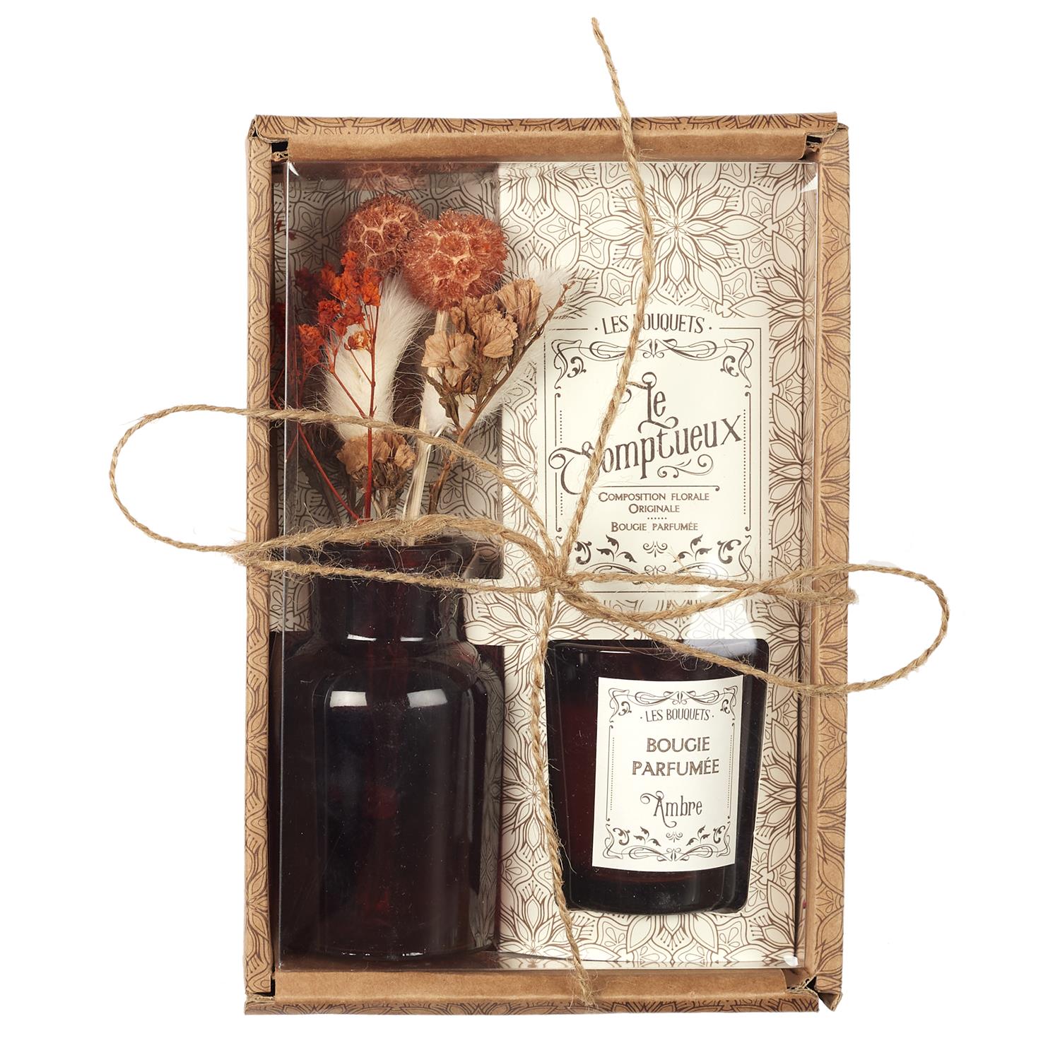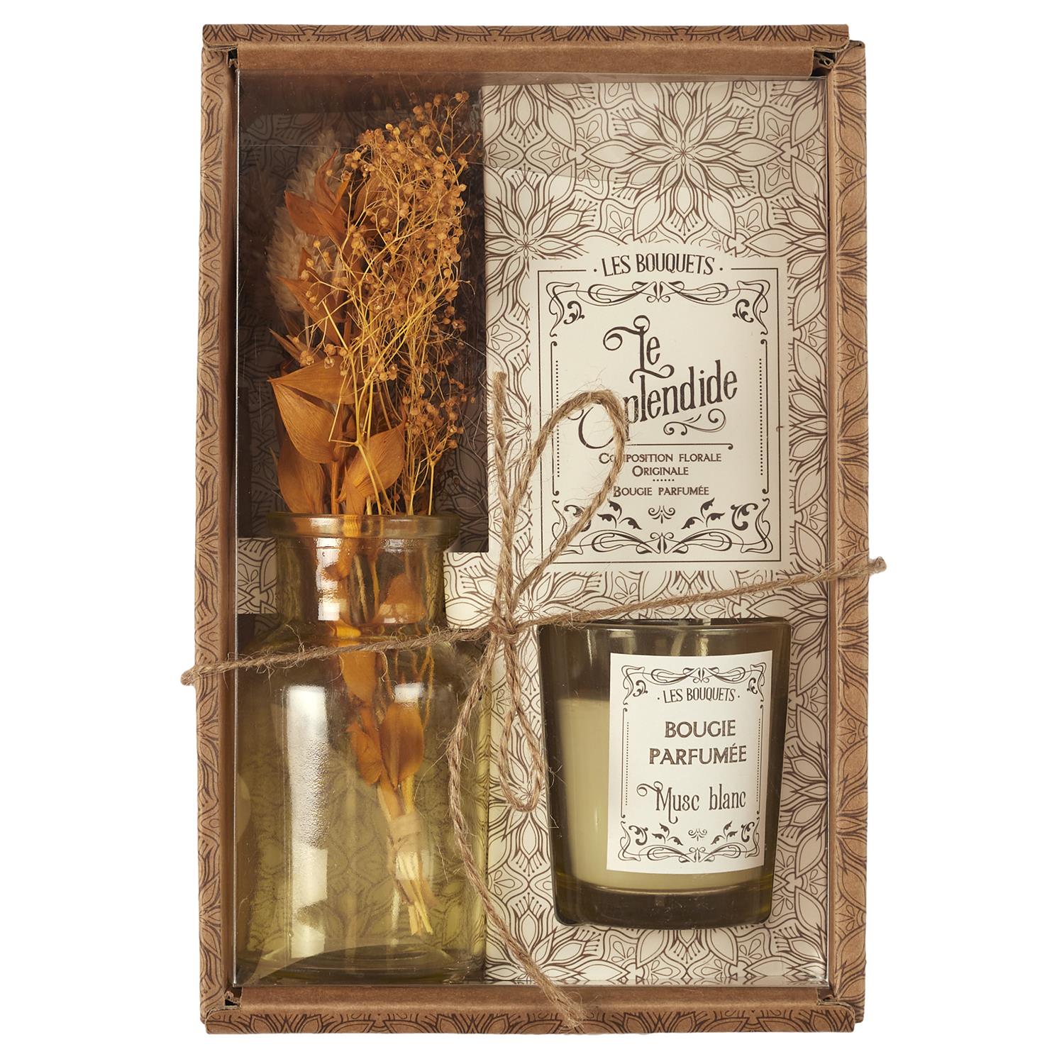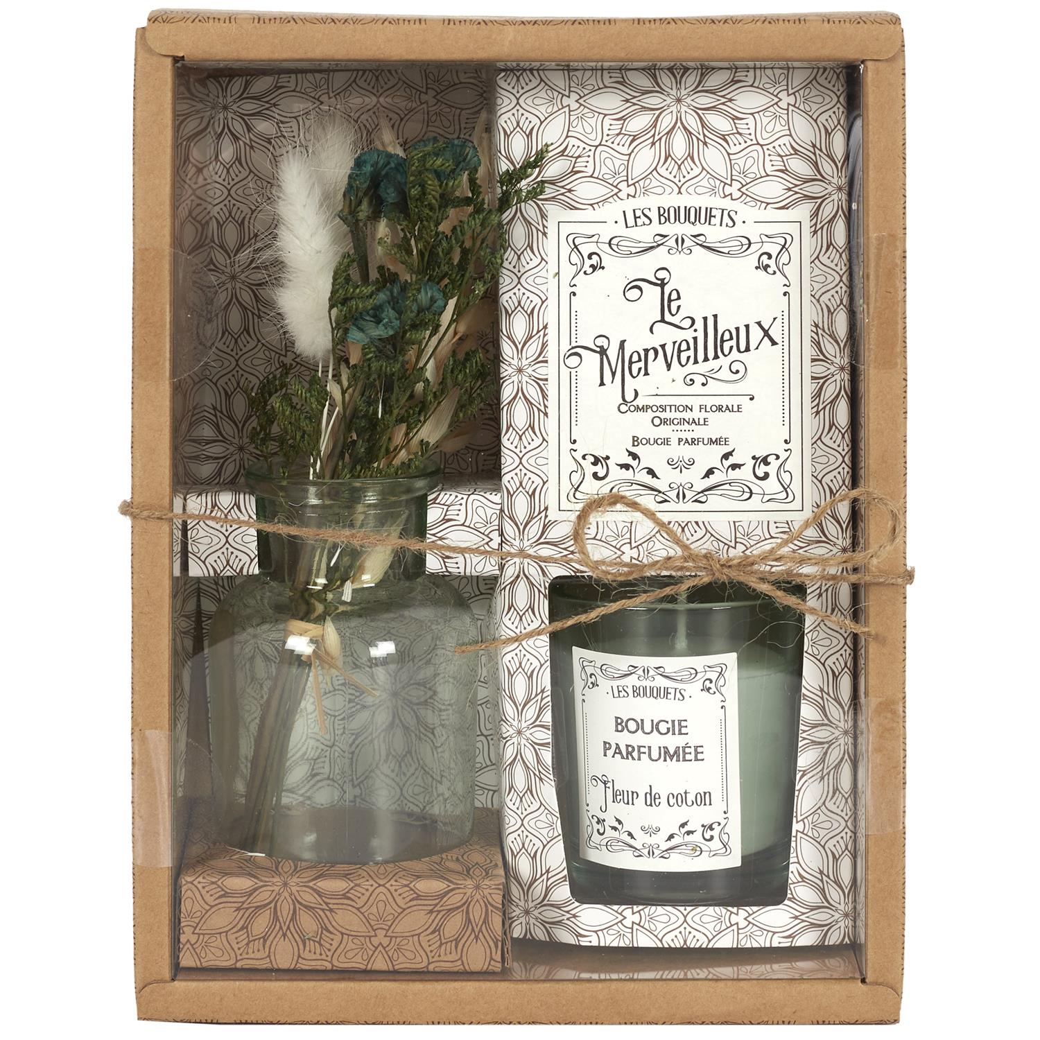 Dekoratīvi dāvanu komplekti, kuros iekļauta stikla vāzīte ar žāvētiem ziediem un smaržīga svece stikla trauciņā. Komplekti pieejami vairākās krāsu un aromātu variācijās: