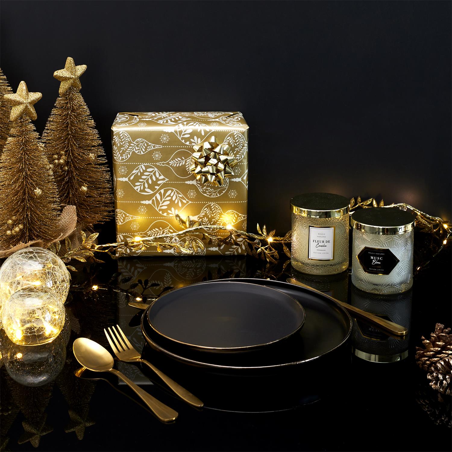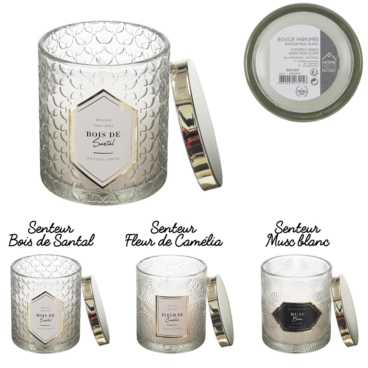 Izsmalcināta aromātiskā svece grezni dekorētā stikla traukā ar zelta toņa vāciņu. Smalkais stikla raksts un elegantā etiķete piešķir svecēm luksusa noskaņu, padarot tās par izteiksmīgu interjera akcentu un augstvērtīgu dāvanu.