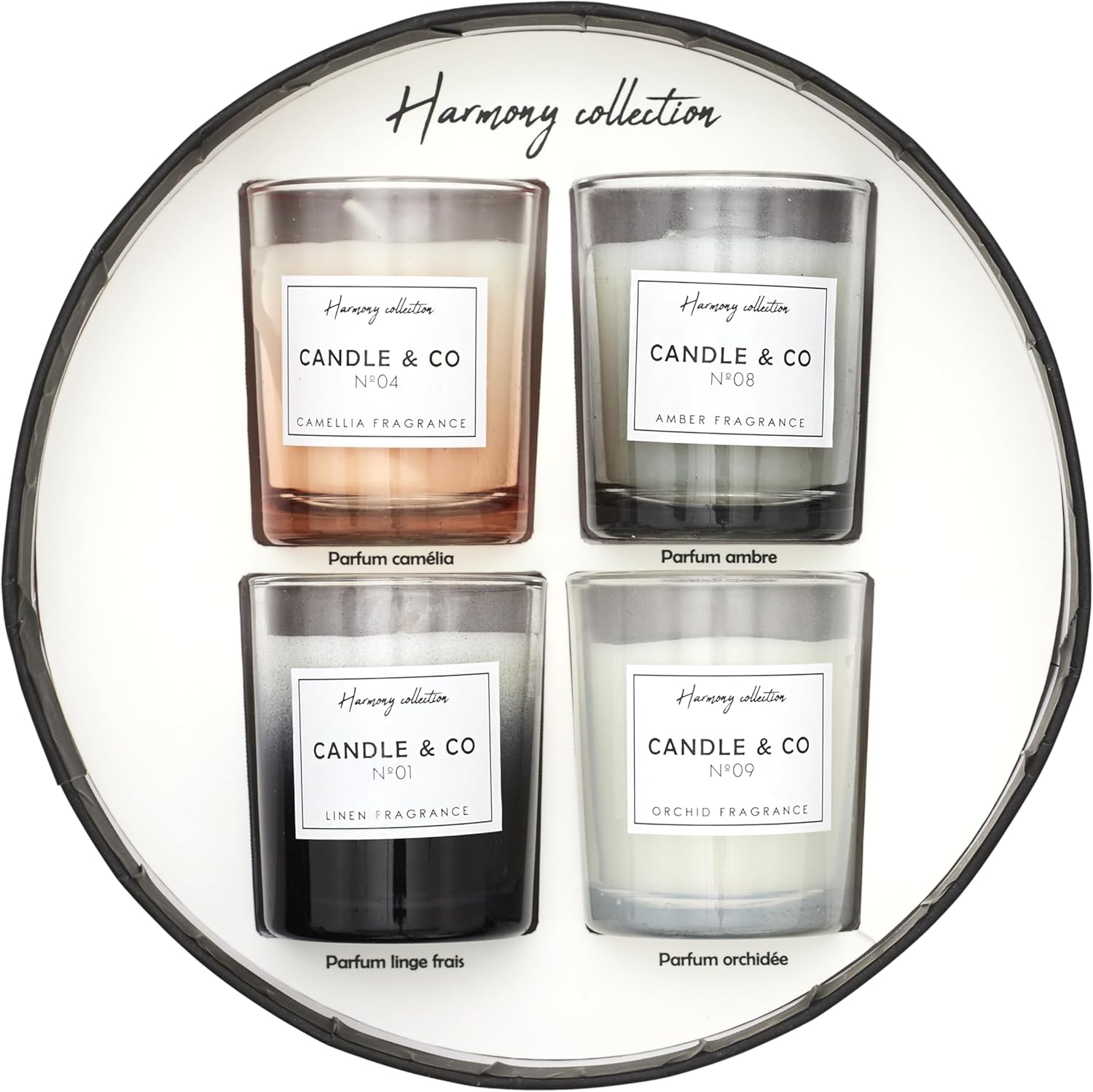 Izsmalcināts aromātisko sveču komplekts, kas apvieno elegantu dizainu un harmoniski saskaņotus aromātus. Komplektā ietilpst 4 aromātiskās sveces stikla traukos, iepakotas stilīgā, dekoratīvā kastītē – ideāli piemērots dāvanai vai mājīgas atmosfēras radīšanai mājās.