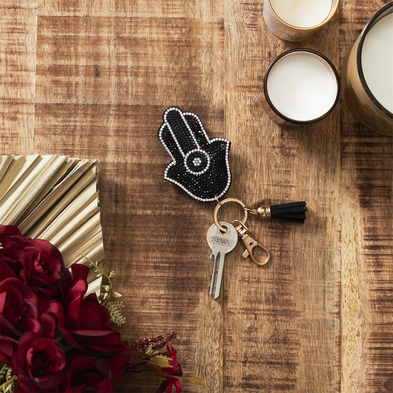 Elegants un simbolisks atslēgu piekariņš Hamsas rokas formā, rotāts ar mirdzošiem kristāliem. Hamsa tradicionāli simbolizē aizsardzību, veiksmi un pozitīvu enerģiju, padarot šo aksesuāru ne tikai stilīgu, bet arī ar nozīmi.