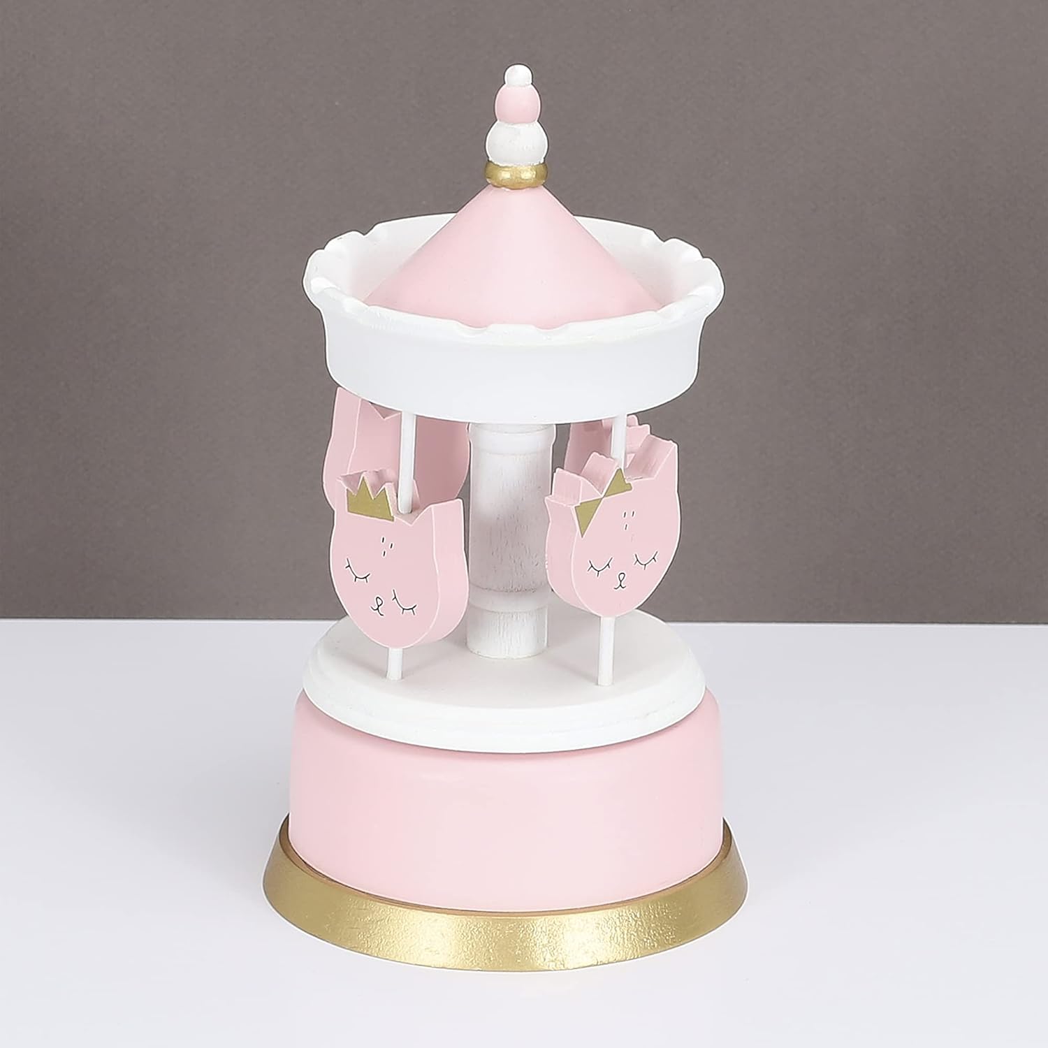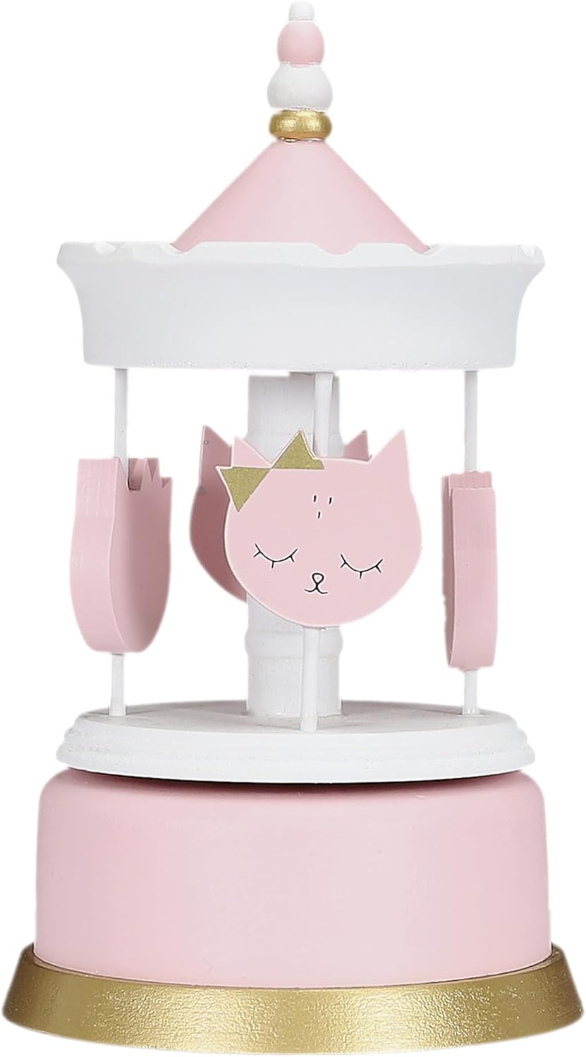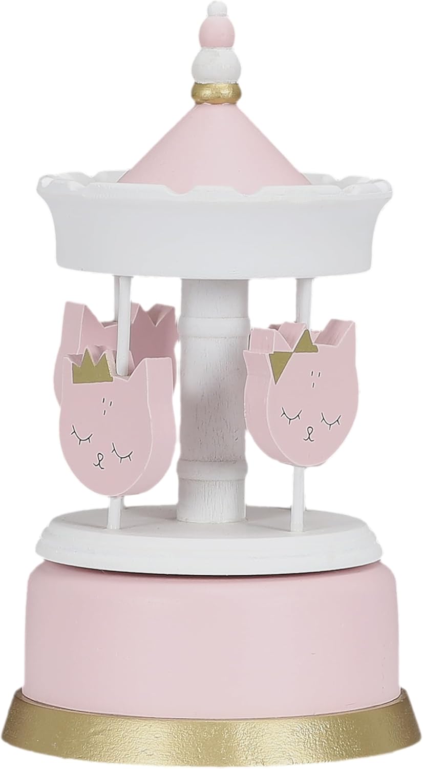 Šis maigi rozā koka karuselis ar jaukām kaķīšu figūriņām ir brīnišķīga dekorācija bērnistabai un mīļa dāvana mazajiem. Rokām veidotās detaļas, zeltītie akcenti un maigas krāsas piešķir karuselim pasakainu noskaņu. Pagriežot augšdaļu, tas lēnām griežas un atskaņo nomierinošu melodiju.