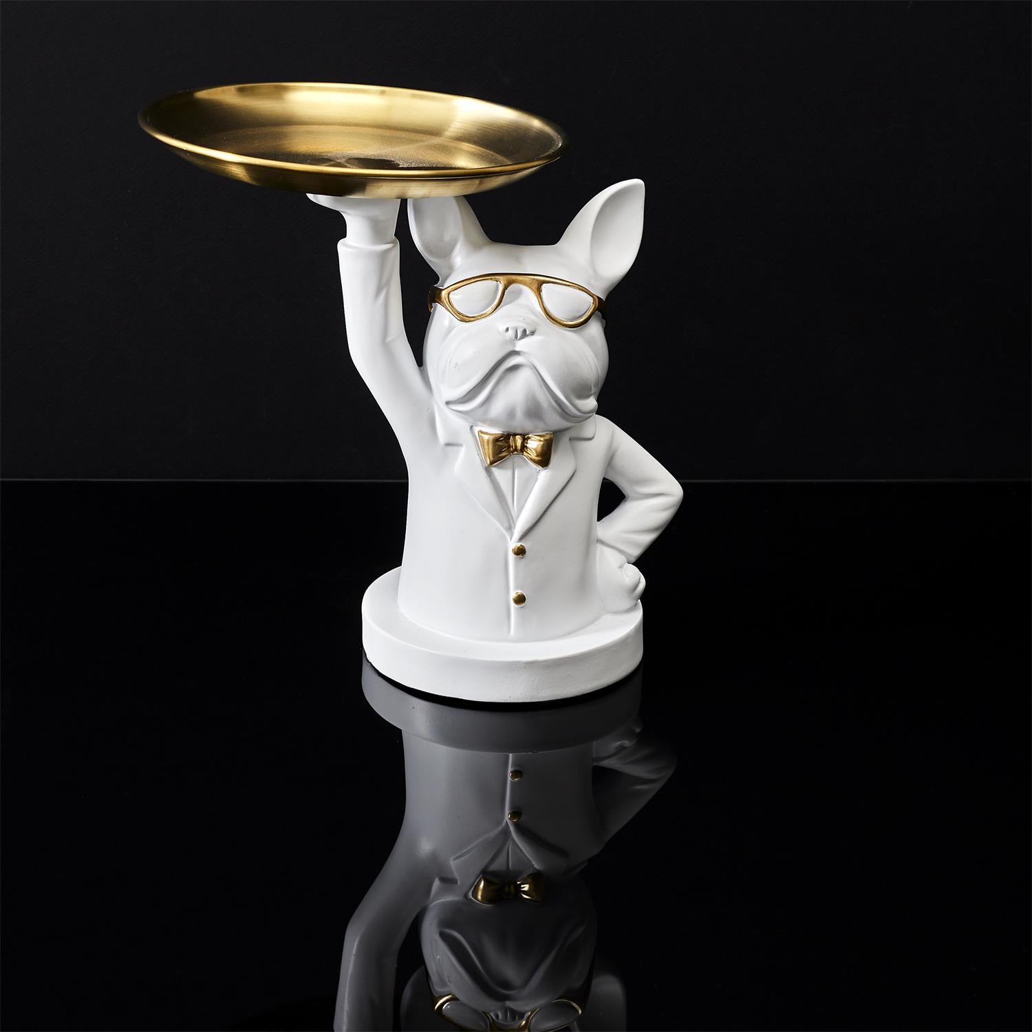 Greznas estētikas un humora apvienojums – keramikas buldoga figūra ar paceltu roku un zelta toņa paplāti. Matēti baltā krāsa kontrastā ar zelta brillēm, tauriņu un pogām piešķir dekoram luksusa noskaņu un padara to par pamanāmu interjera akcentu.