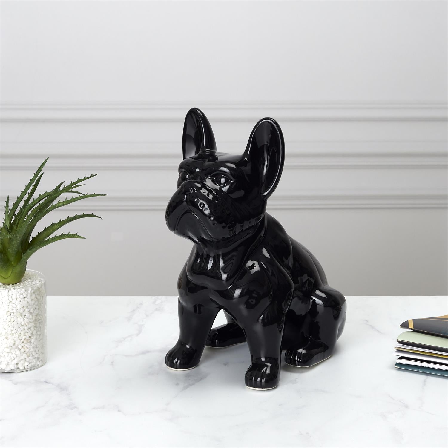 Stilīga un modernā keramika buldoga figūra melnā, spīdīgā apdarē. Elegants aksesuārs, kas piešķir telpai raksturu un kļūst par izteiksmīgu interjera akcentu. Universālais dizains lieliski iederas gan modernā, gan industriālā vai glam stila mājoklī.