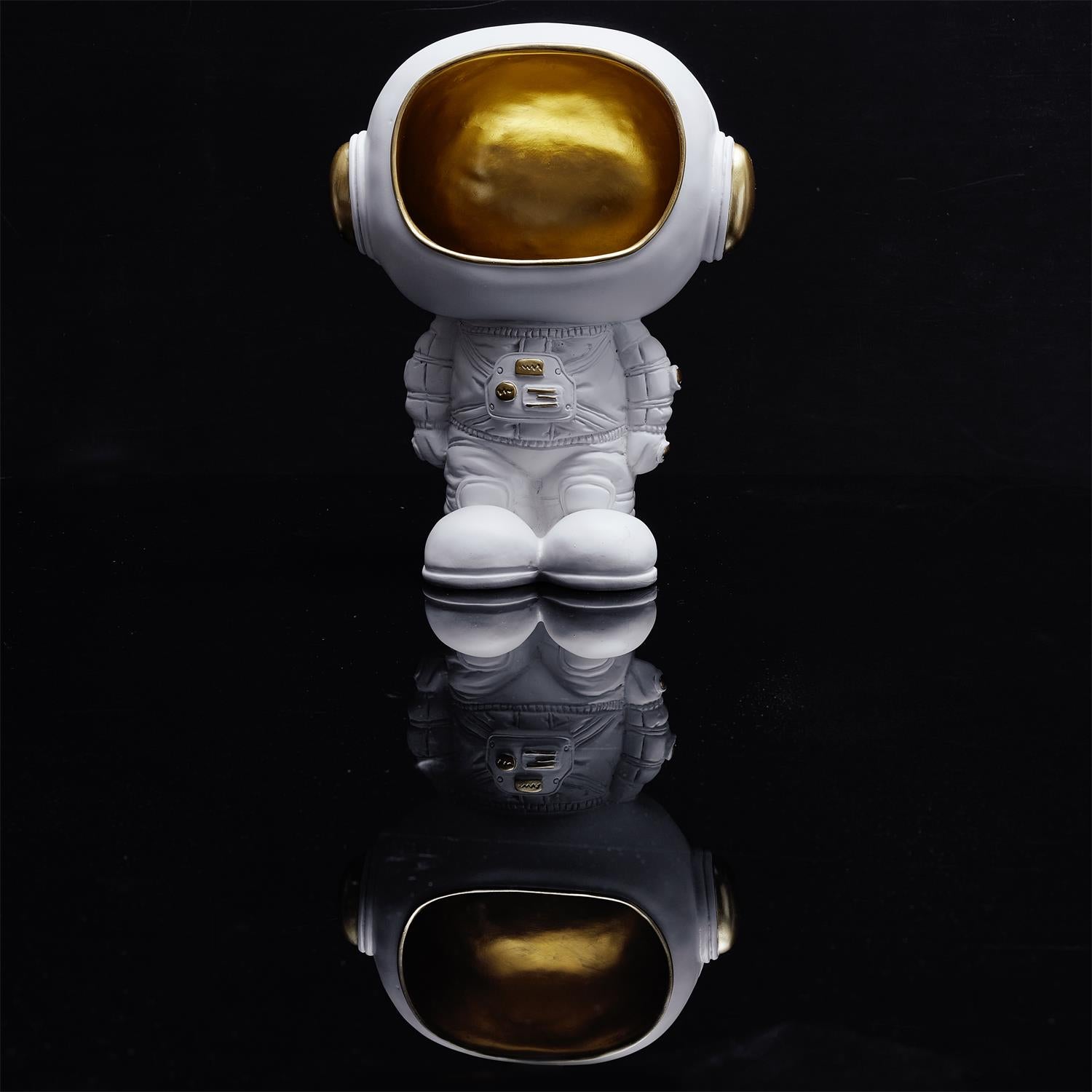 Moderns un stilīgs dekoratīvs astronauts, kas apvieno dizainu ar praktisku funkcionalitāti. Balta figūra ar izteiksmīgu zelta krāsas ķiveres iekšpusi un detaļām rada izsmalcinātu, mūsdienīgu akcentu interjerā. Atvērtā ķivere kalpo kā uzglabāšanas nodalījums nelieliem priekšmetiem.
