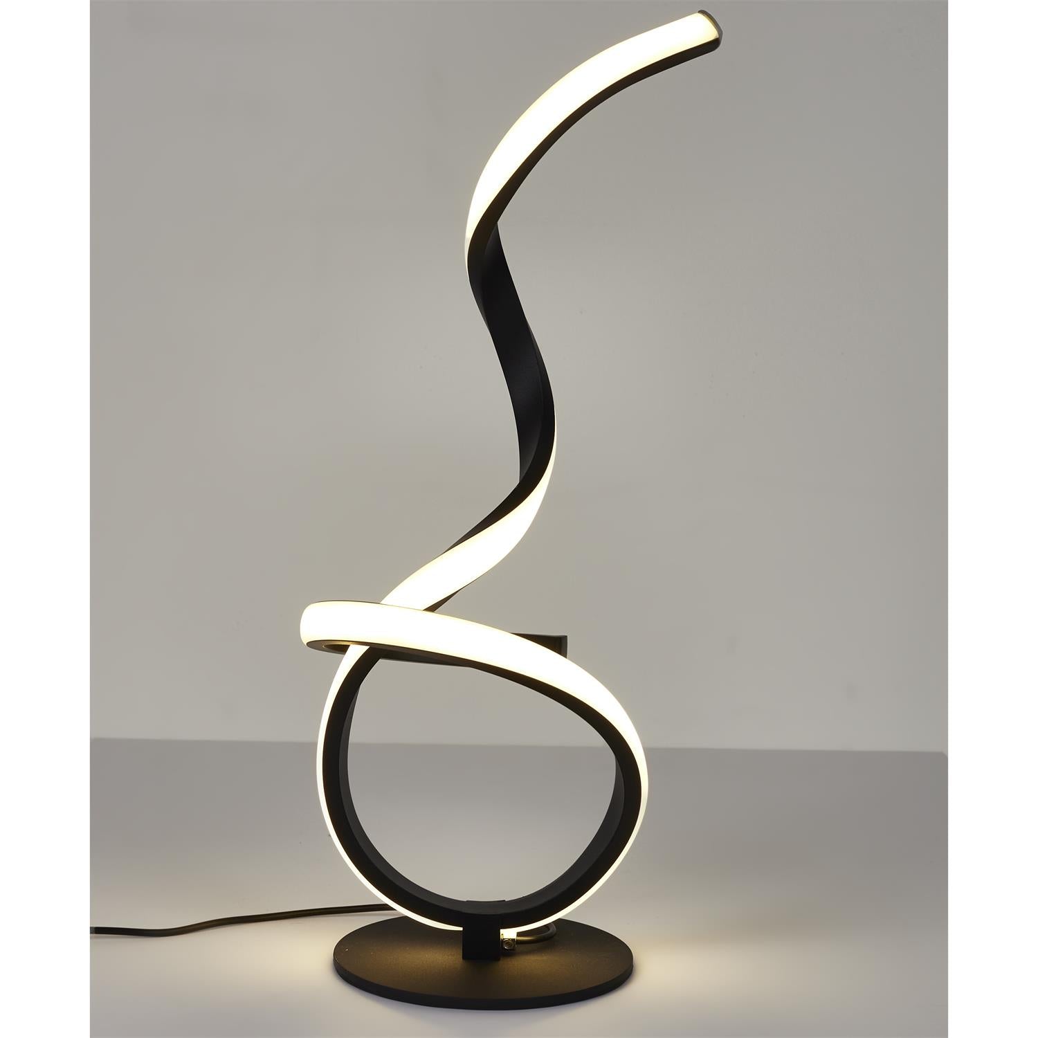 Piešķir savam interjeram modernu akcentu ar šo stilīgo LED galda lampu spirāles formā. Tās unikālais dizains apvieno melnu pamatni ar maigi izliektu LED gaismas joslu, radot elegantu un mājīgu apgaismojumu. Šī lampa ir ne tikai gaismas avots, bet arī dekoratīvs elements, kas izcili papildinās viesistabu, guļamistabu, biroju vai modernu darba zonu.
