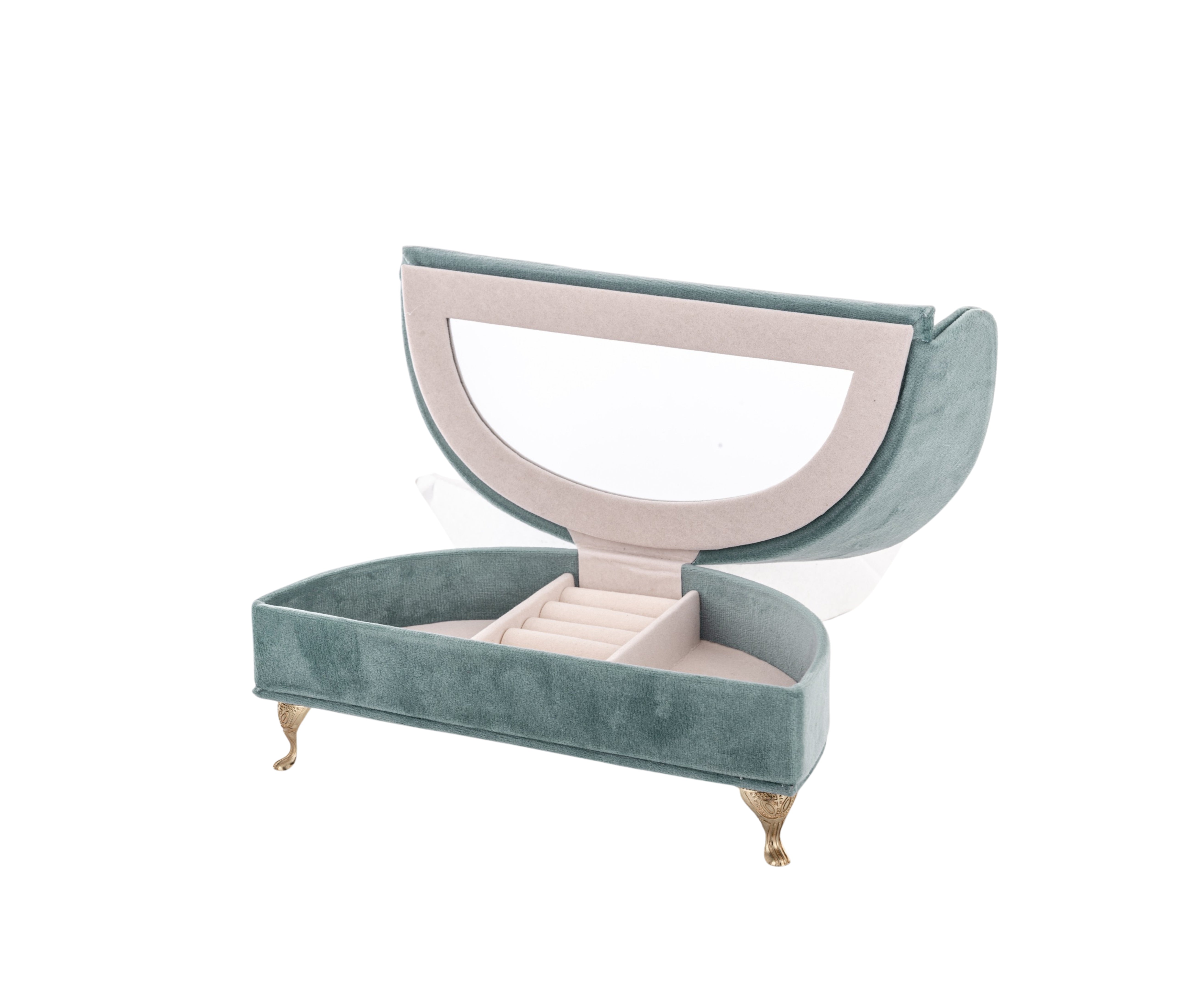 Dekoratīva samta rotaslietu lādīte–dīvāniņš ar zelta kājiņām