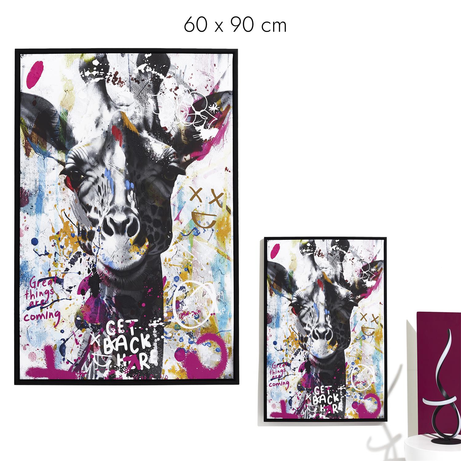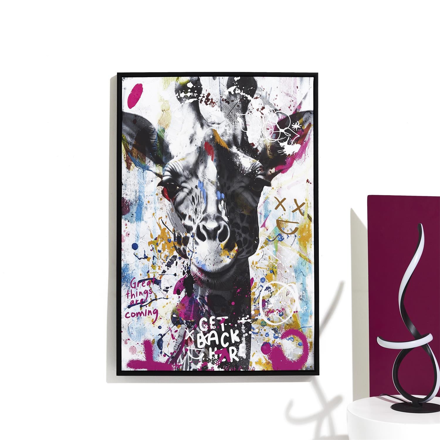 Mūsdienīga un drosmīga sienas glezna ar žirafes motīvu, veidota street art / pop art stilā. Darbs izpildīts kā krāsu nospiedums ar reljefu uz auduma, kas piešķir gleznai izteiktu tekstūru, dziļumu un unikālu vizuālo efektu.