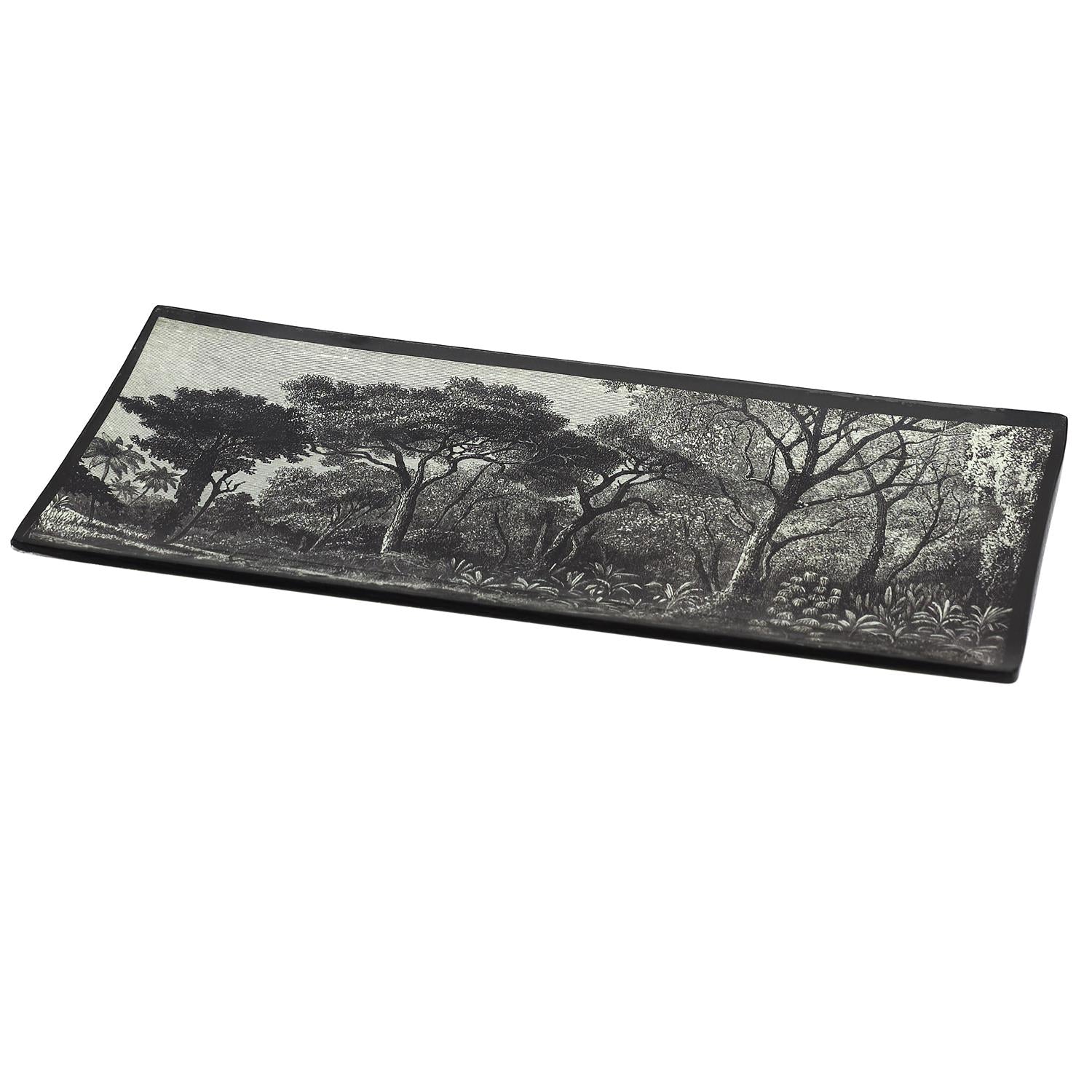 Stilīga un kvalitatīva taisnstūra formas stikla paplāte ar melnbaltu meža ainavas dizainu. Ideāli piemērota atslēgu, rotu, sīklietu vai sveču izvietošanai – skaists akcents konsoles galdiņam, koridoram, guļamistabai vai birojā.