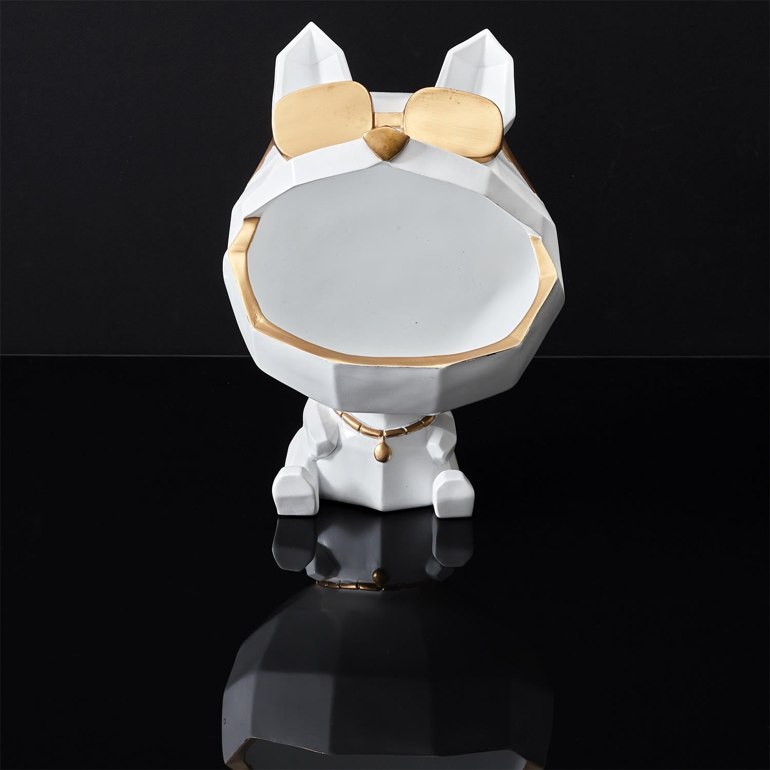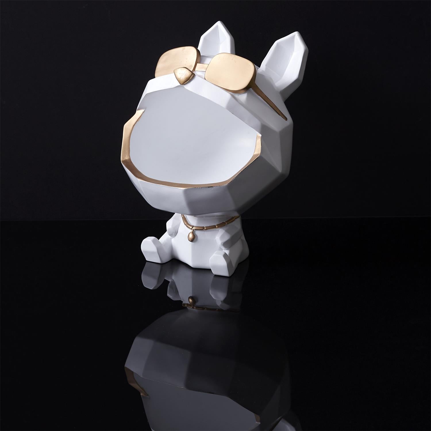 Moderns un stilīgs keramikas suņa dekors baltā krāsā ar elegantiem zelta akcentiem. Figūras iekšpusē ir ērts trauciņš sīklietām – atslēgām, rotām vai citiem nieciņiem. Suns ar zelta brillēm un apkaklīti piešķir interjeram greznu un rotaļīgu noskaņu, padarot šo dekoru par izteiksmīgu akcentu gan priekšnamā, gan viesistabā vai birojā.