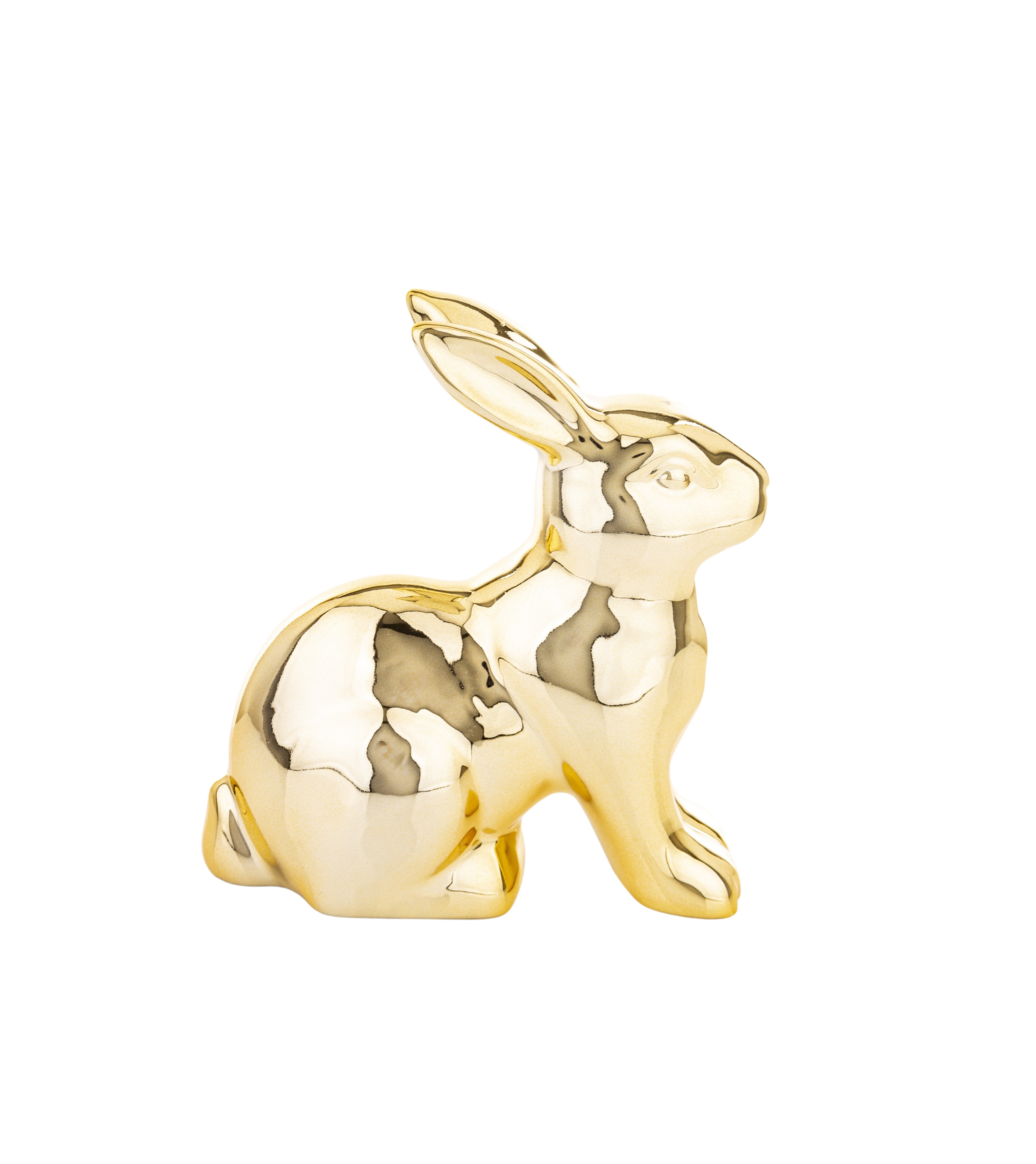 Izsmalcināta dekoratīva zaķa figūra zelta tonī, kas piešķir interjeram eleganci un svētku noskaņu. Spīdīgā metāliskā apdare rada luksusa efektu, padarot šo dekoru par izteiksmīgu akcentu gan Lieldienu laikā, gan kā stilīgu sezonālu interjera elementu.