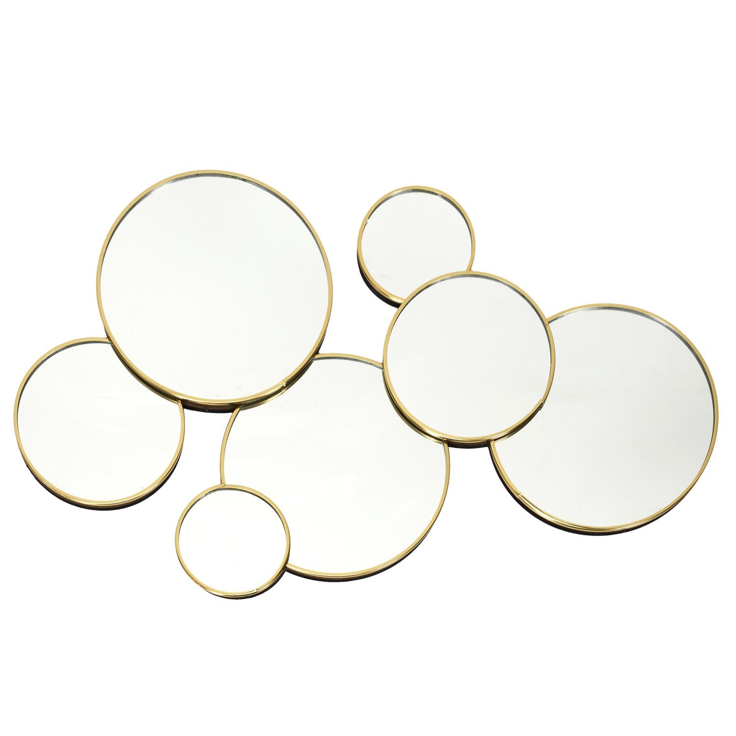 Moderns sienas spogulis no vairākām apaļām sekcijām, kas veido elegantu un dinamisku kompozīciju. Zeltītais rāmis piešķir interjeram greznību, bet dažāda izmēra spoguļu apvienojums rada telpai dziļumu, gaismu un unikālu vizuālo efektu.