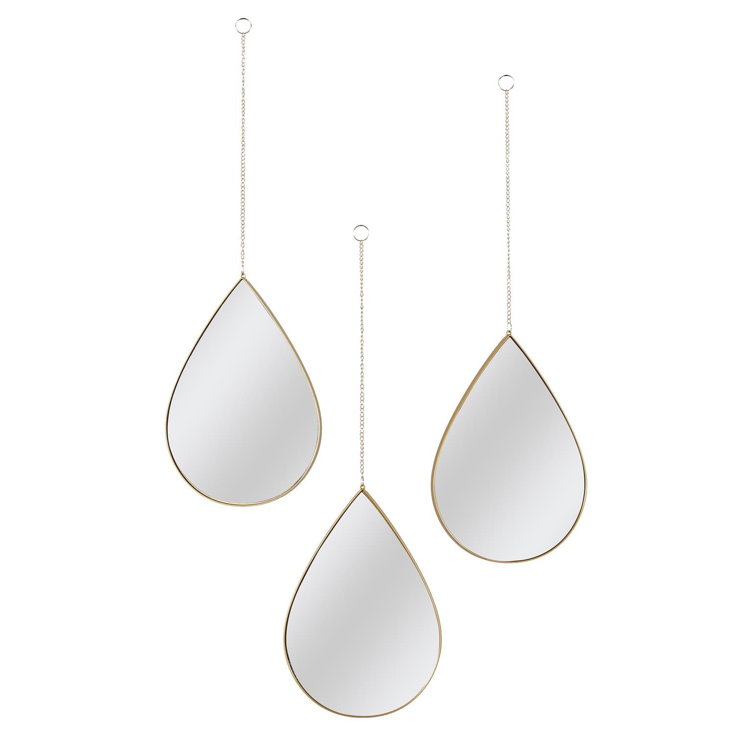 Elegants trīs dekoratīvo spoguļu komplekts piliena formā, kas piešķir interjeram vieglumu, gaismu un izsmalcinātu akcentu. Spoguļi ierāmēti smalkā zelta krāsas metāla rāmī un piekārti ar dekoratīvām ķēdītēm, radot modernu un vienlaikus maigu vizuālo efektu.