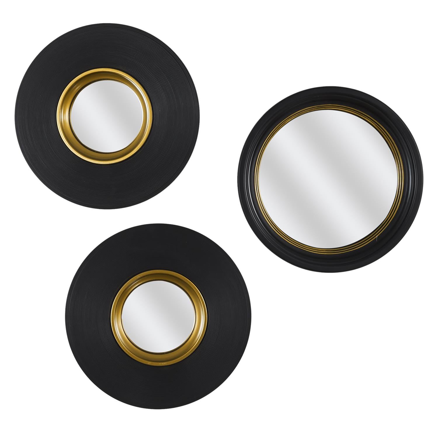 Izteiksmīgs trīs dekoratīvo konvekso spoguļu komplekts, kas apvieno klasisku apaļu formu ar modernu dizainu. Spoguļiem ir izliekta (konveksa) virsma, kas rada interesantu telpas atspulgu un vizuālu dziļumu. Kontrasts starp melnās krāsas rievoto rāmi un zelta akcentu piešķir greznu, dizainisku noskaņu.