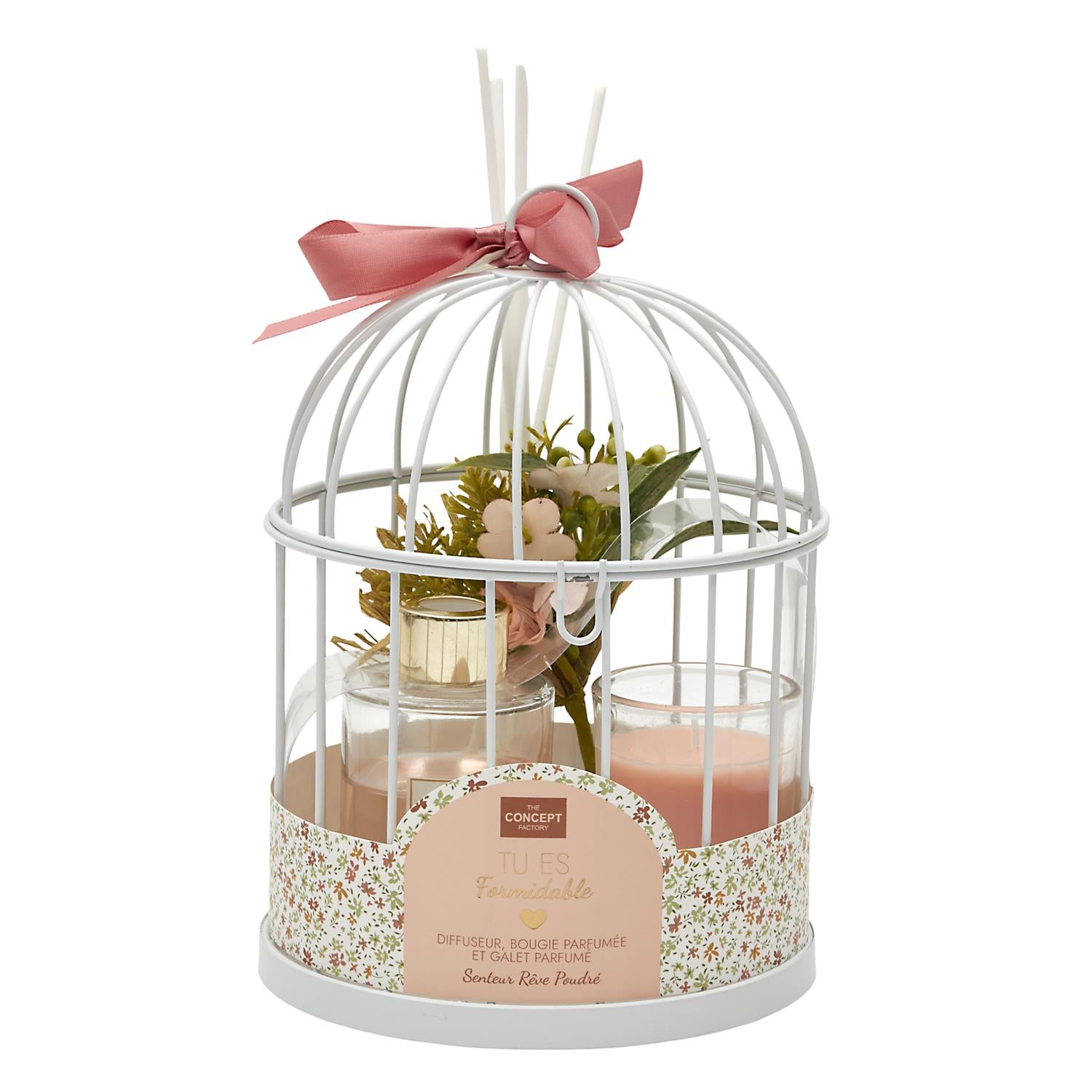 Elegants un romantisks komplekts, kas apvieno aromātisko difuzoru, sveci un dekoratīvus ziedus smalkā metāla būrītī ar lentīti. Ideāla dāvana sieviešu svētkiem, Māmiņdienai vai kā izsmalcināts interjera akcents.