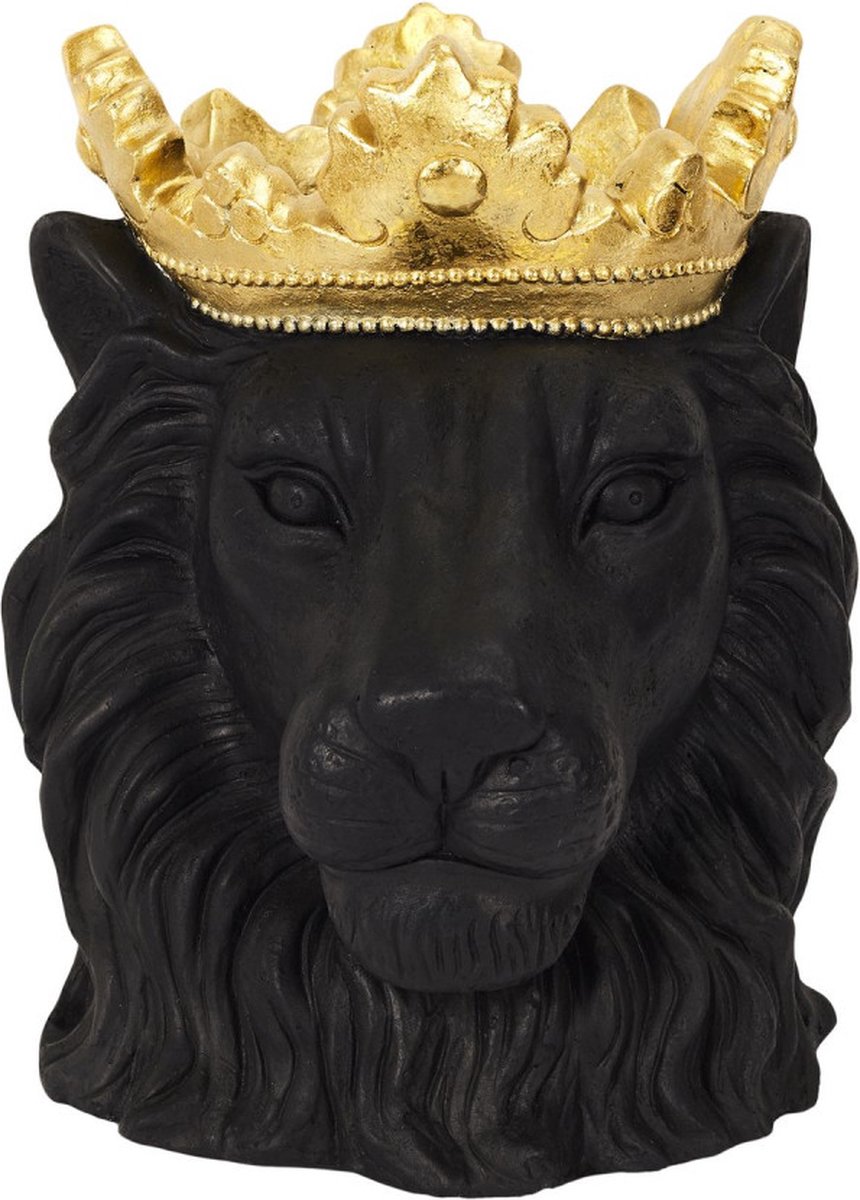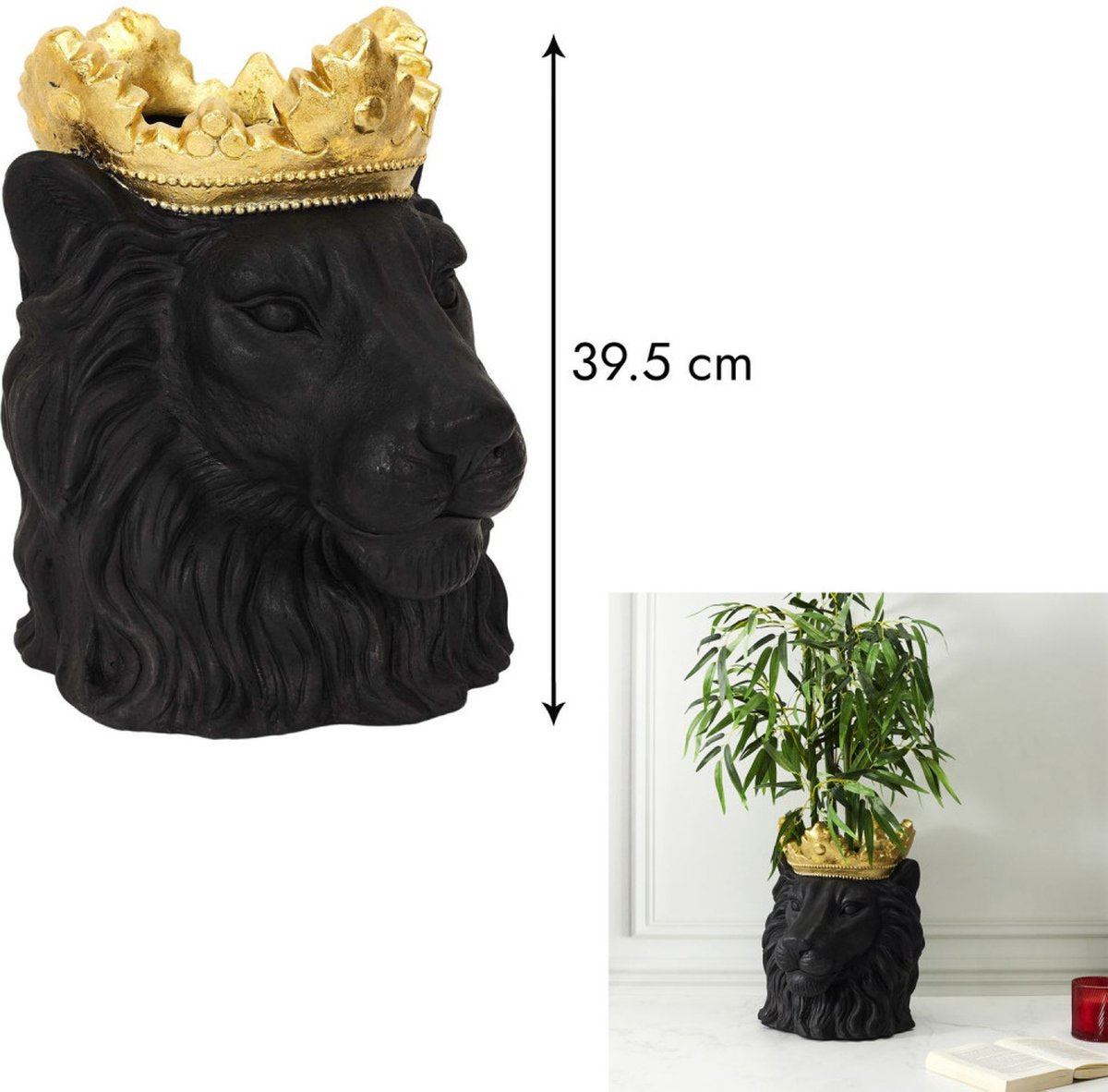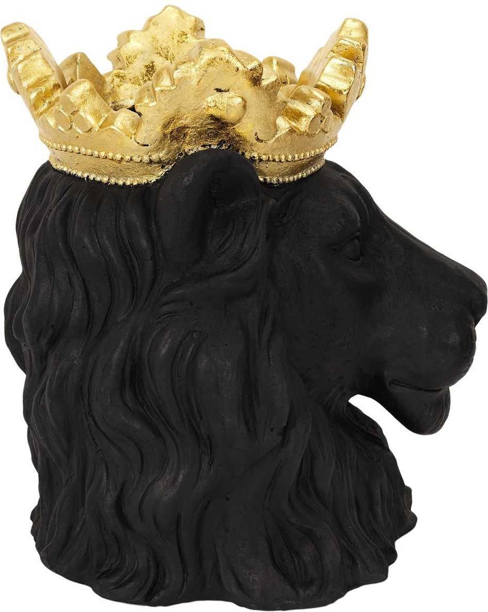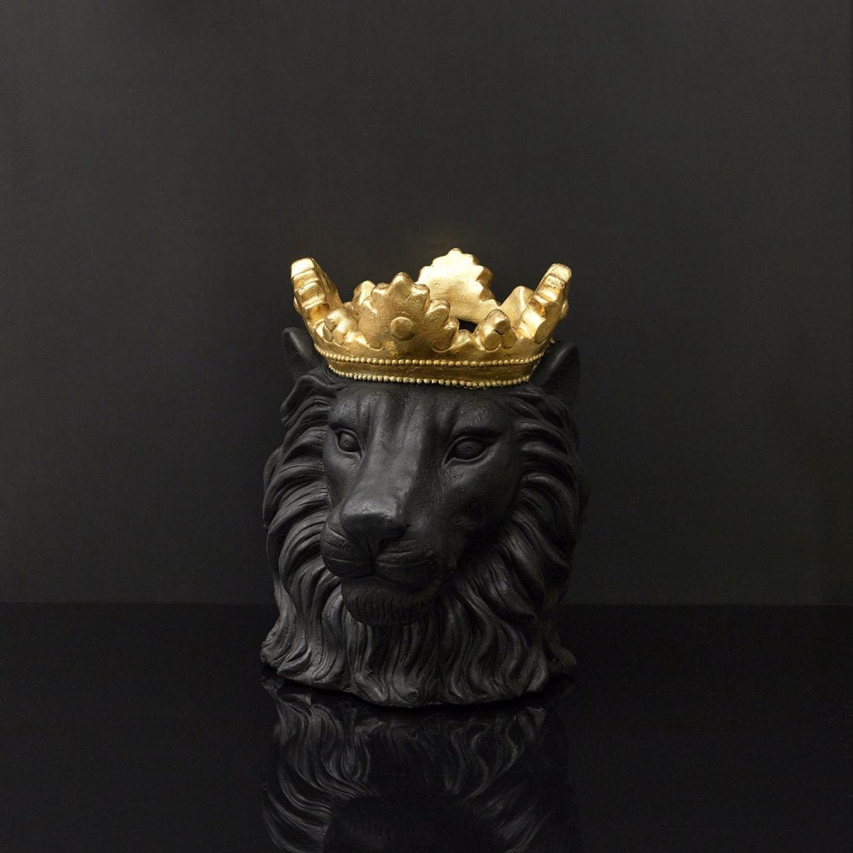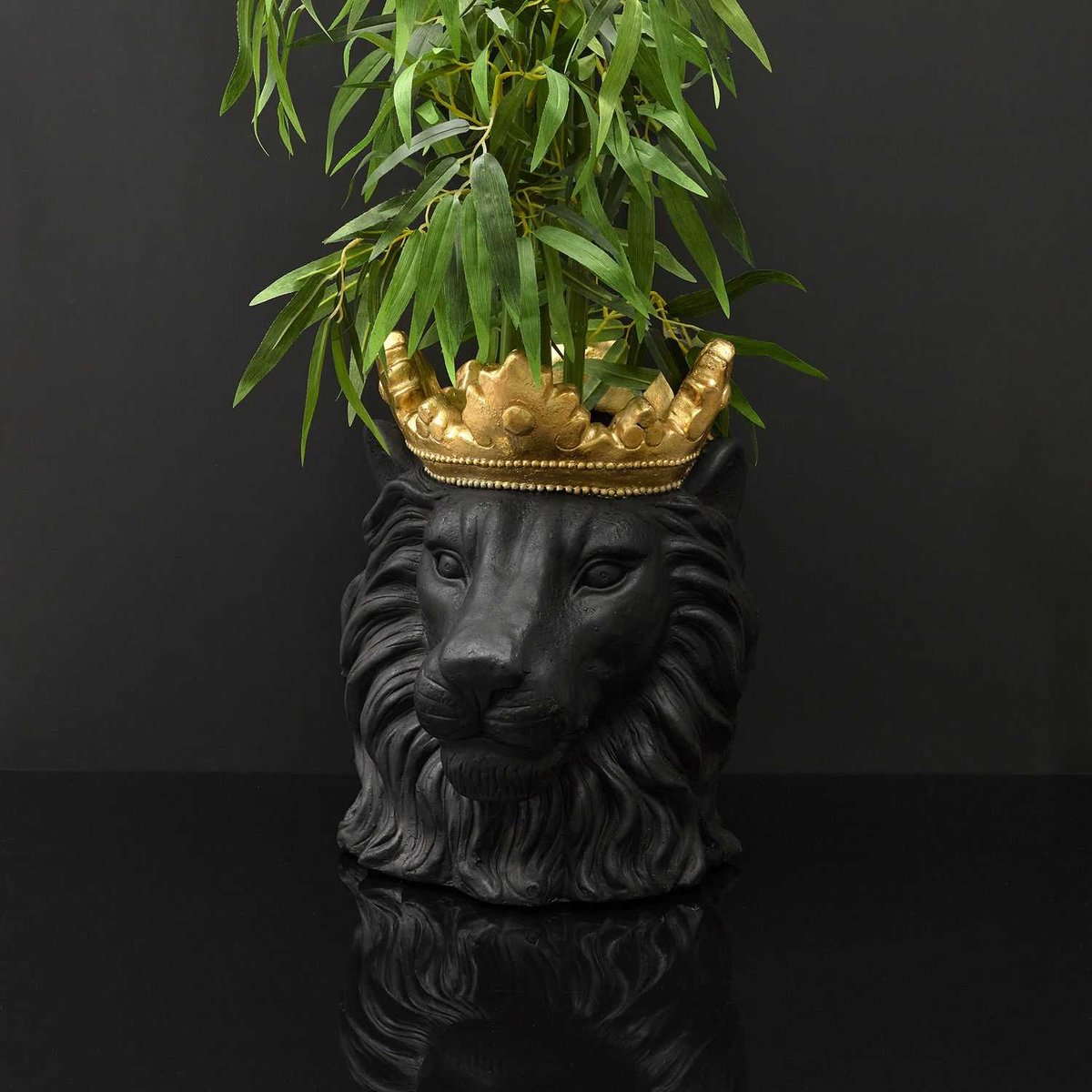 Impozants un izteiksmīgs lauvas galvas dekors ar zelta kroni, kas kalpo kā unikāls puķupods vai vāze. Matēti melnā lauva apvienojumā ar greznu zelta kroni piešķir interjeram majestātisku, luksusa noskaņu un kļūst par telpas centrālo akcentu.