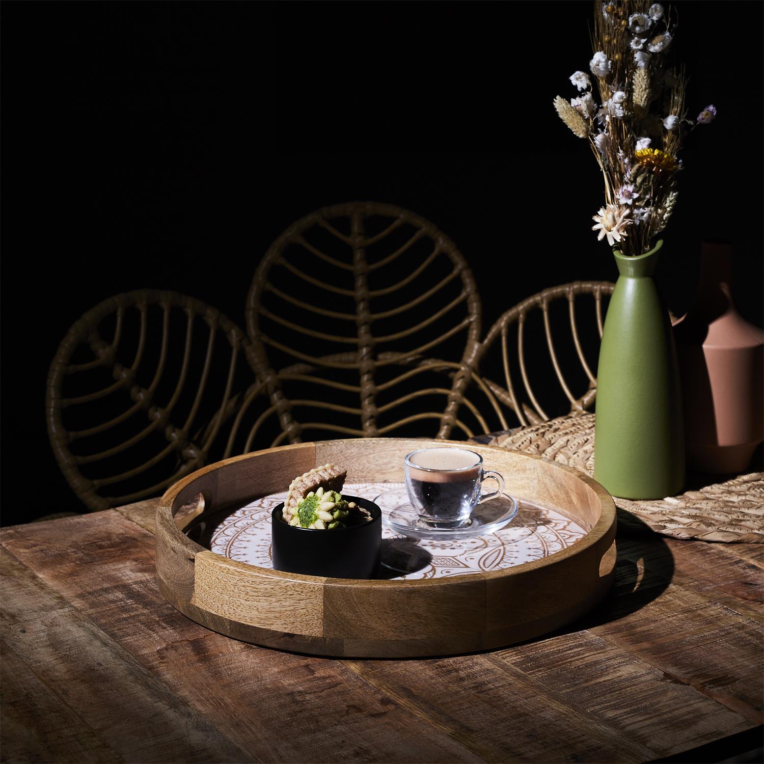 Šī elegantā apaļā servēšanas paplāte no mango koka ir gan praktisks, gan vizuāli izteiksmīgs interjera akcents. Dabīgā koka siltums apvienots ar glancētu iekšējo pārklājumu, kas piešķir paplātei īpašu šarmu un atvieglo kopšanu. Ideāli piemērota uzkodām, desertiem, kafijai vai kā dekoratīvs elements uz galda, virtuves salas vai viesistabā.