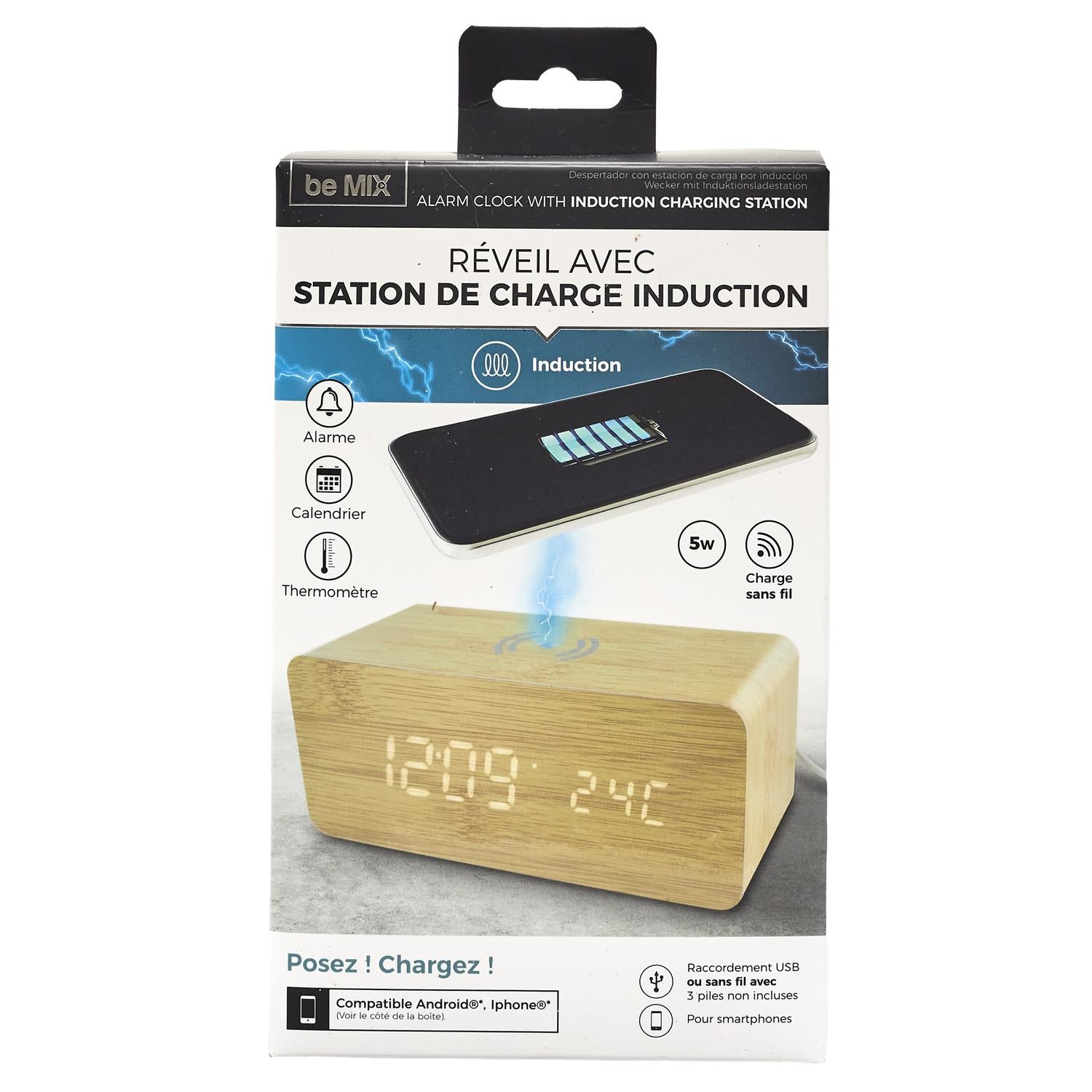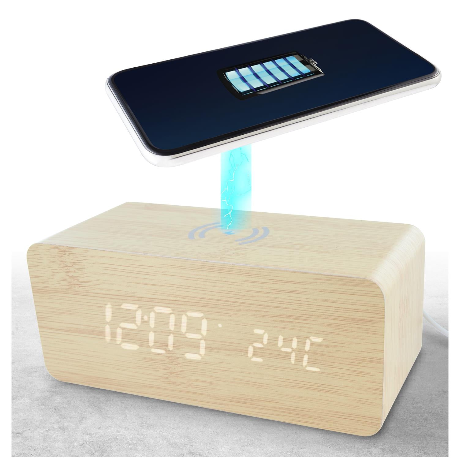 Moderns un praktisks 2-in-1 modinātājs, kas apvieno elegantu dabīga koka (bambusa) dizainu ar mūsdienīgu tehnoloģiju. Ierīce kalpo gan kā digitālais pulkstenis, gan kā bezvadu uzlādes stacija viedtālrunim – vienkārši novieto telefonu uz augšējās virsmas, un tas uzlādējas bez vadiem.