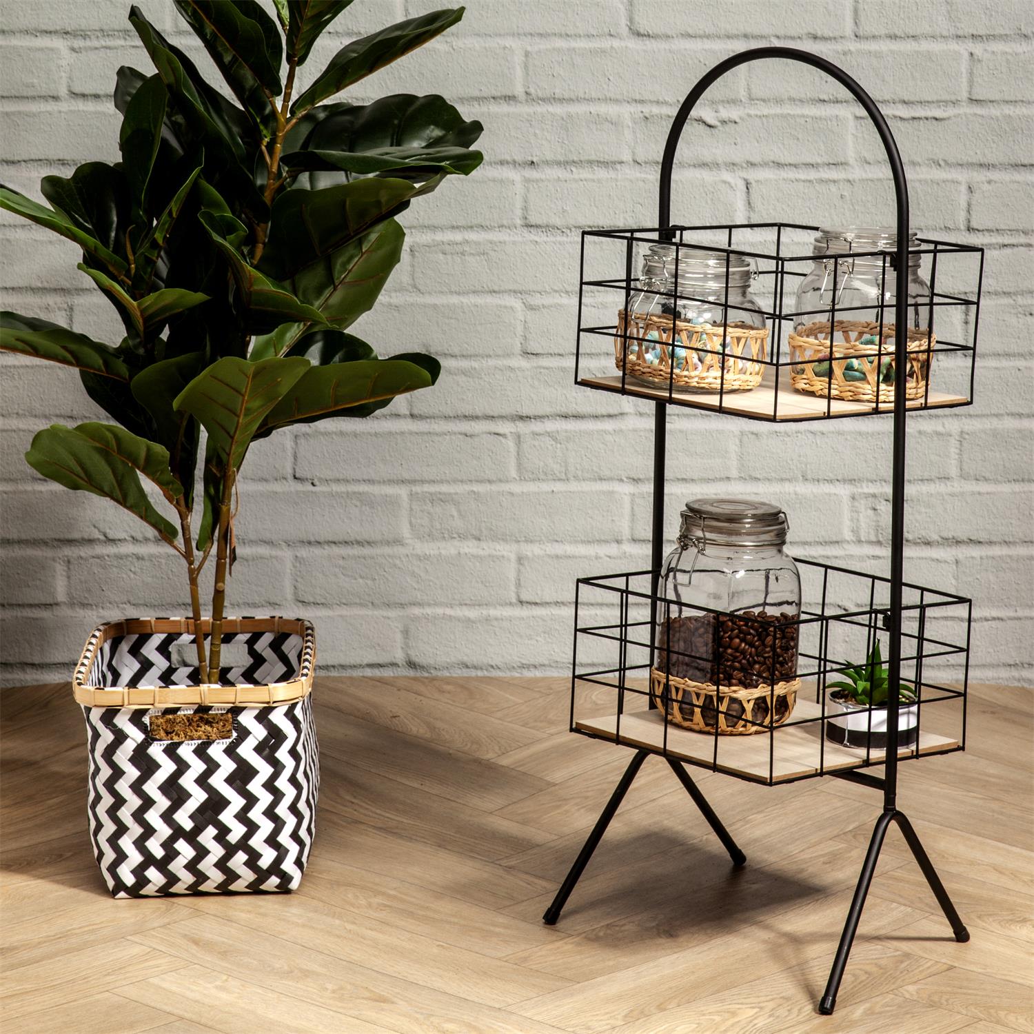 Melna metāla konstrukcija nodrošina stabilitāti un izturību, savukārt dabīgā koka pamatnes piešķir siltu un mājīgu akcentu. Atvērtā grozu tipa konstrukcija ļauj ērti uzglabāt un pārskatīt dažādus priekšmetus – burkas, augus, traukus, dekora elementus vai sadzīves piederumus.