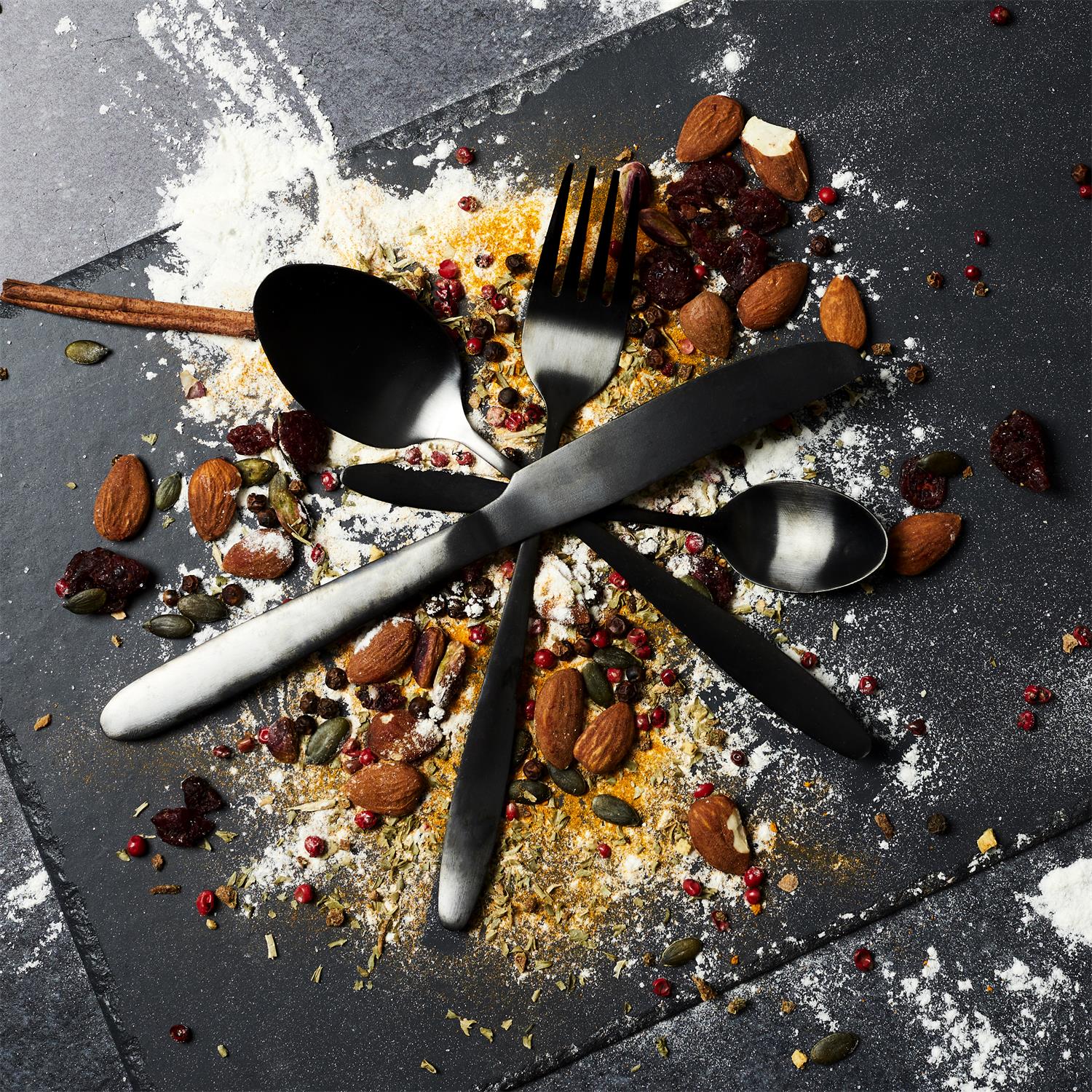 Moderns un izteiksmīgs galda piederumu komplekts melnā krāsā, kas piešķir galdam elegantu un aktuālu dizaina akcentu. Matētais pārklājums izskatās īpaši stilīgi gan uz balta porcelāna, gan uz tumšiem galda klājumiem.