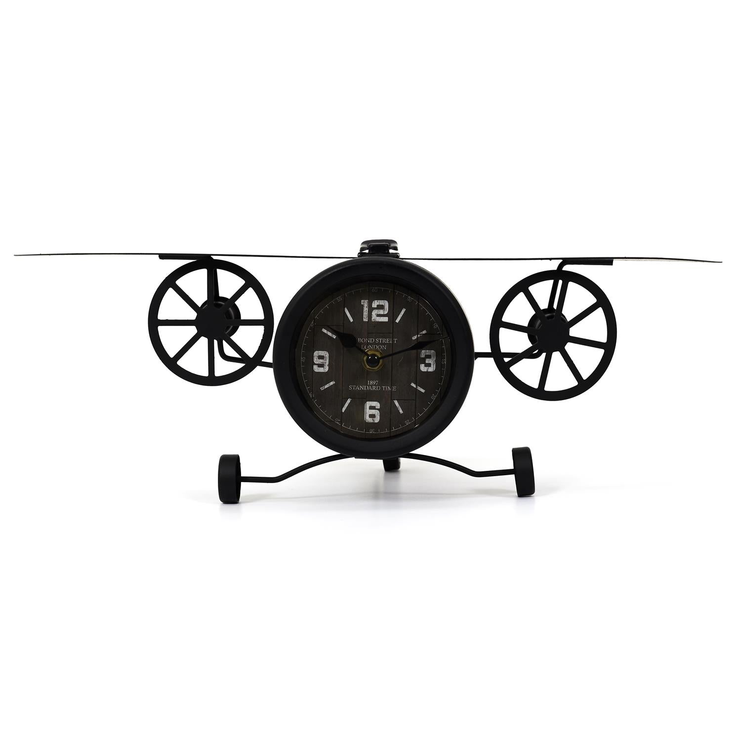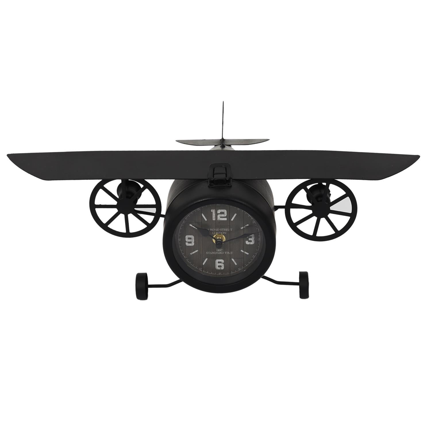 Stilīgs un oriģināls galda pulkstenis lidmašīnas formā, kas piešķir interjeram retro, industriālu un radošu noskaņu. Matēti melnais metāla korpuss un dekoratīvās detaļas padara šo pulksteni par īstu dizaina akcentu birojā, viesistabā vai bērnu istabā.