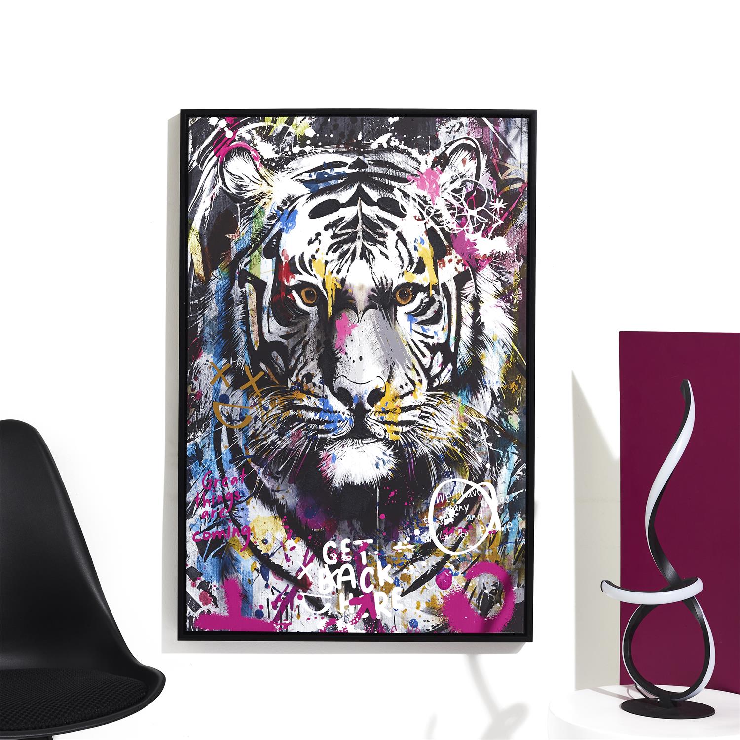 Izteiksmīga sienas glezna ar akvareļas reljefu, kuras centrā ir spēcīgs tīģera tēls modernā, mākslinieciski abstraktā stilā. Dinamiskie krāsu šļaksti, grafiskie akcenti un reljefā apdare piešķir darbam dziļumu un enerģiju, padarot to par spēcīgu interjera fokusa elementu.
