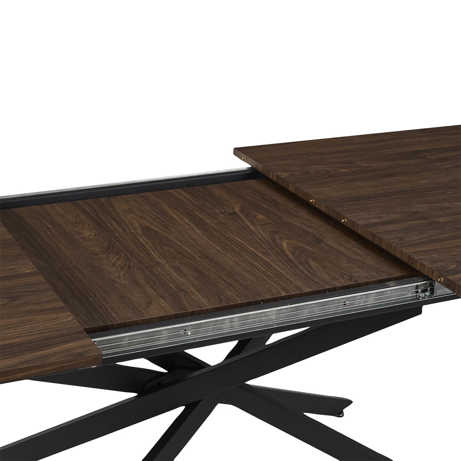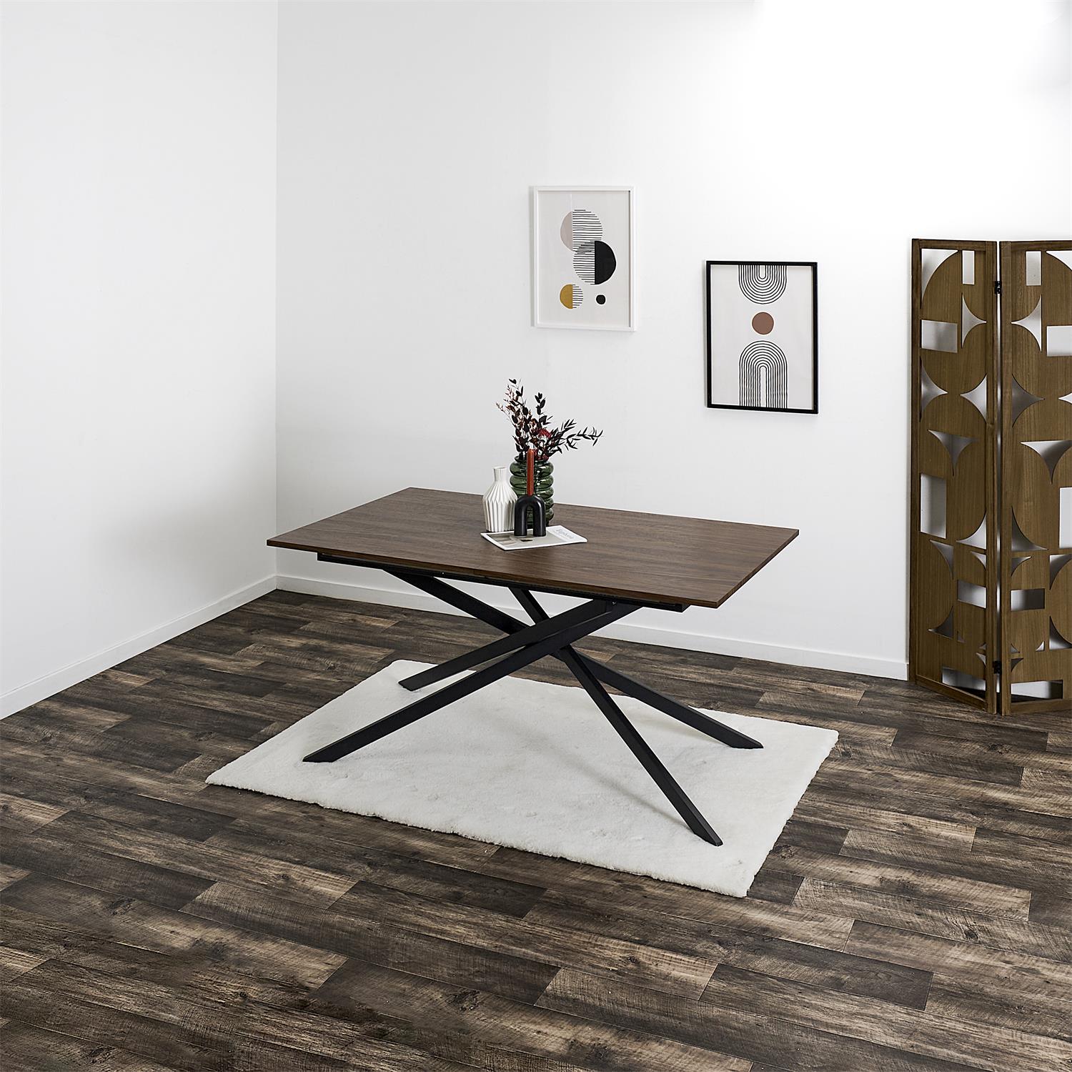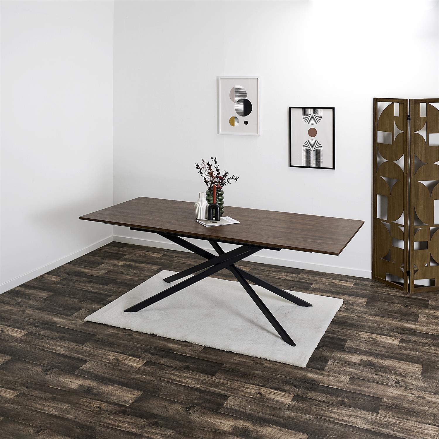 Elegants un funkcionāls izvelkams ēdamgalds ar tumša koka toņa virsmu un stabilām melna metāla kājām X formā. Modernā konstrukcija apvieno dizainu ar praktiskumu, ļaujot ērti pielāgot galda izmēru gan ikdienai, gan viesu uzņemšanai.