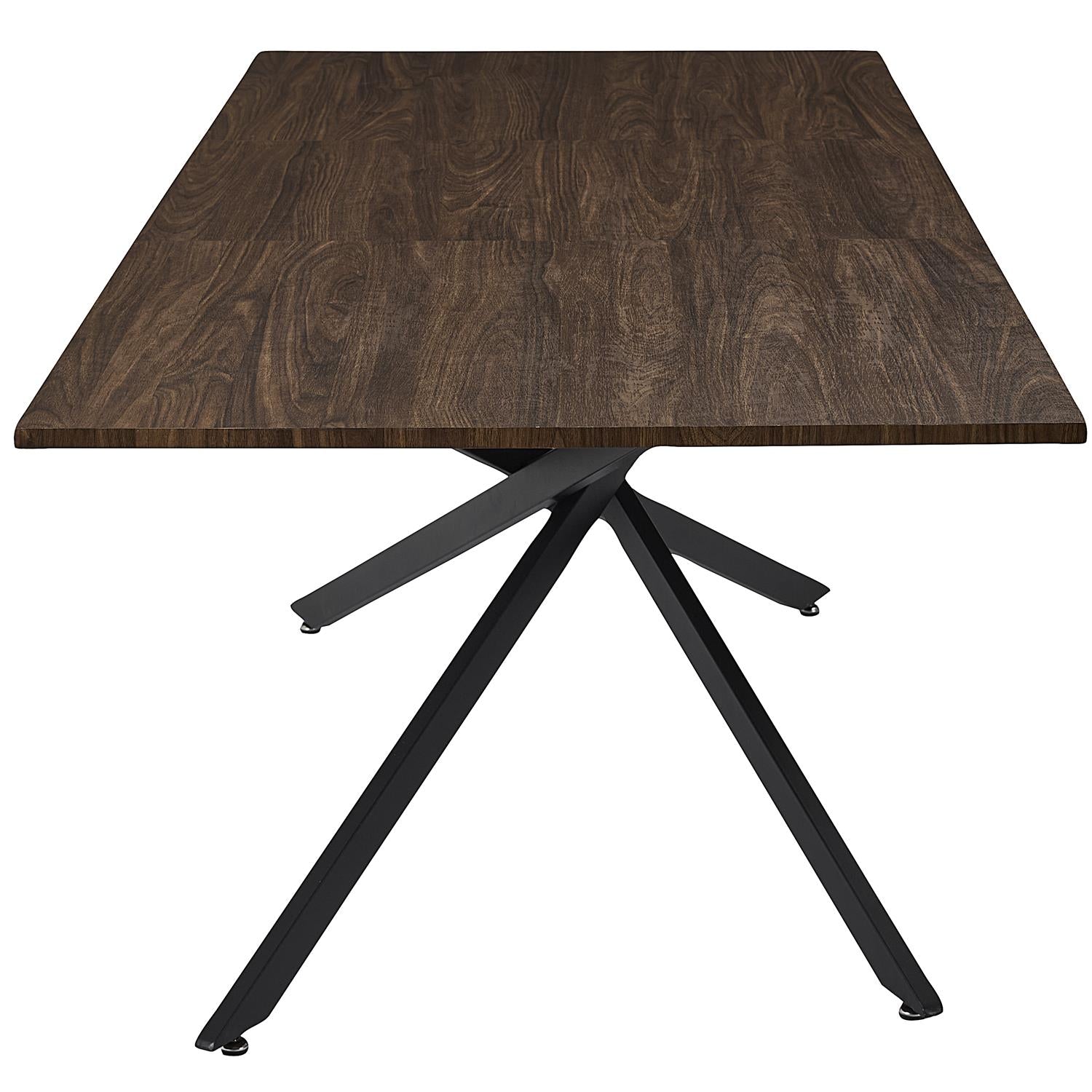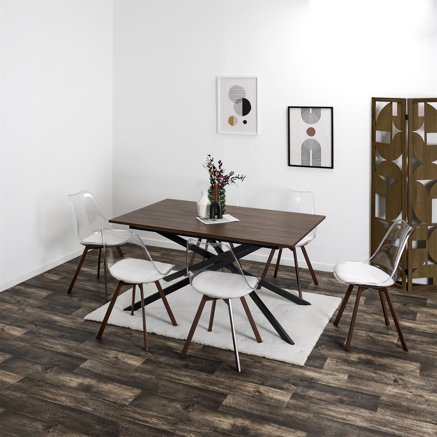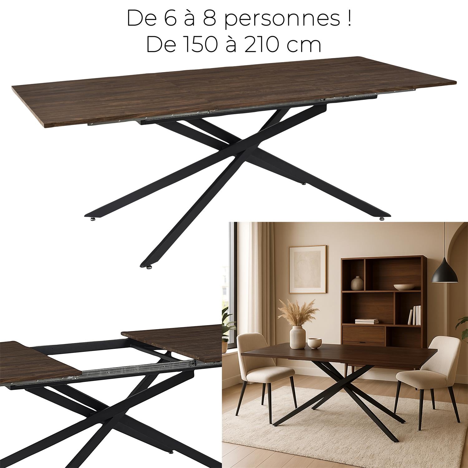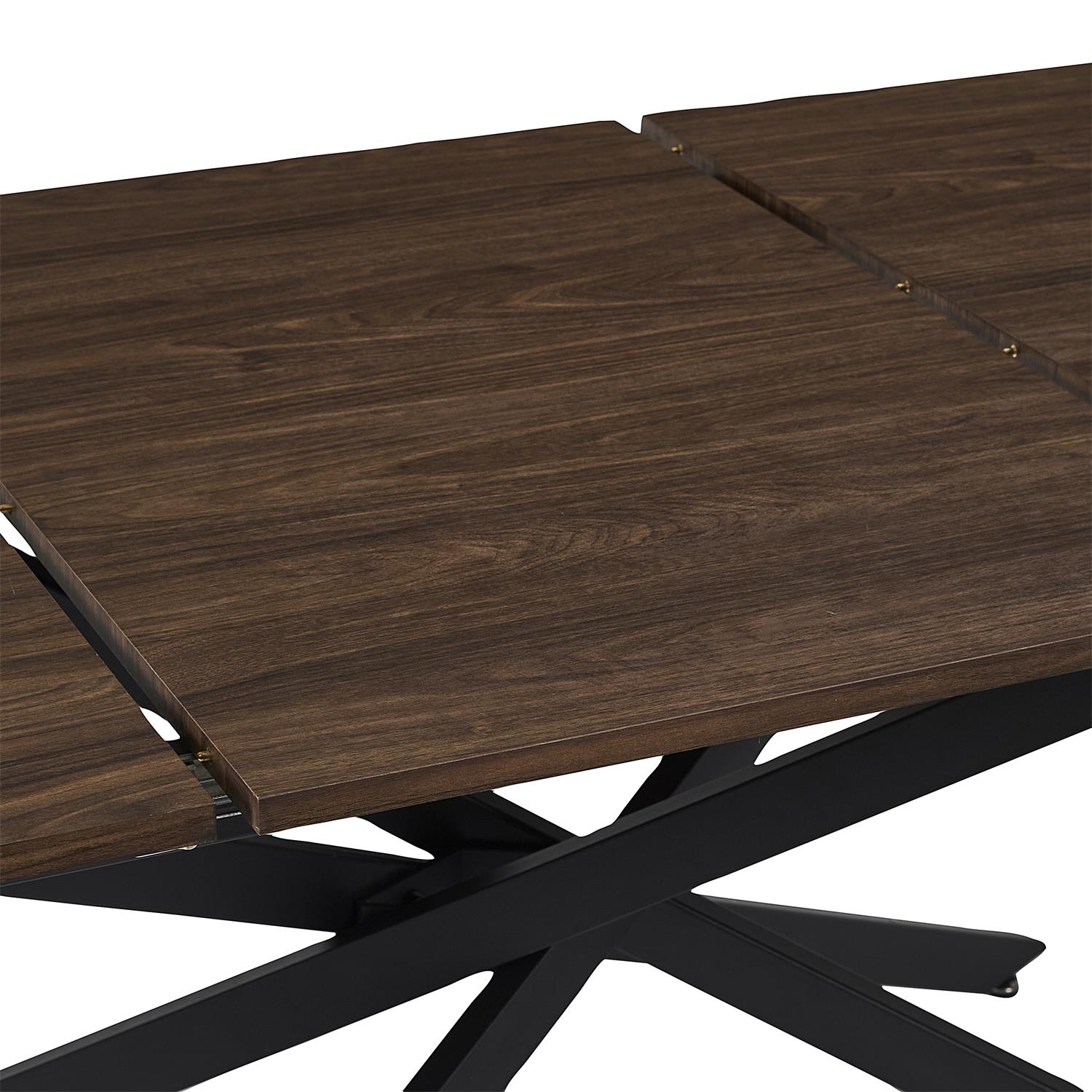 Elegants un funkcionāls izvelkams ēdamgalds ar tumša koka toņa virsmu un stabilām melna metāla kājām X formā. Modernā konstrukcija apvieno dizainu ar praktiskumu, ļaujot ērti pielāgot galda izmēru gan ikdienai, gan viesu uzņemšanai.