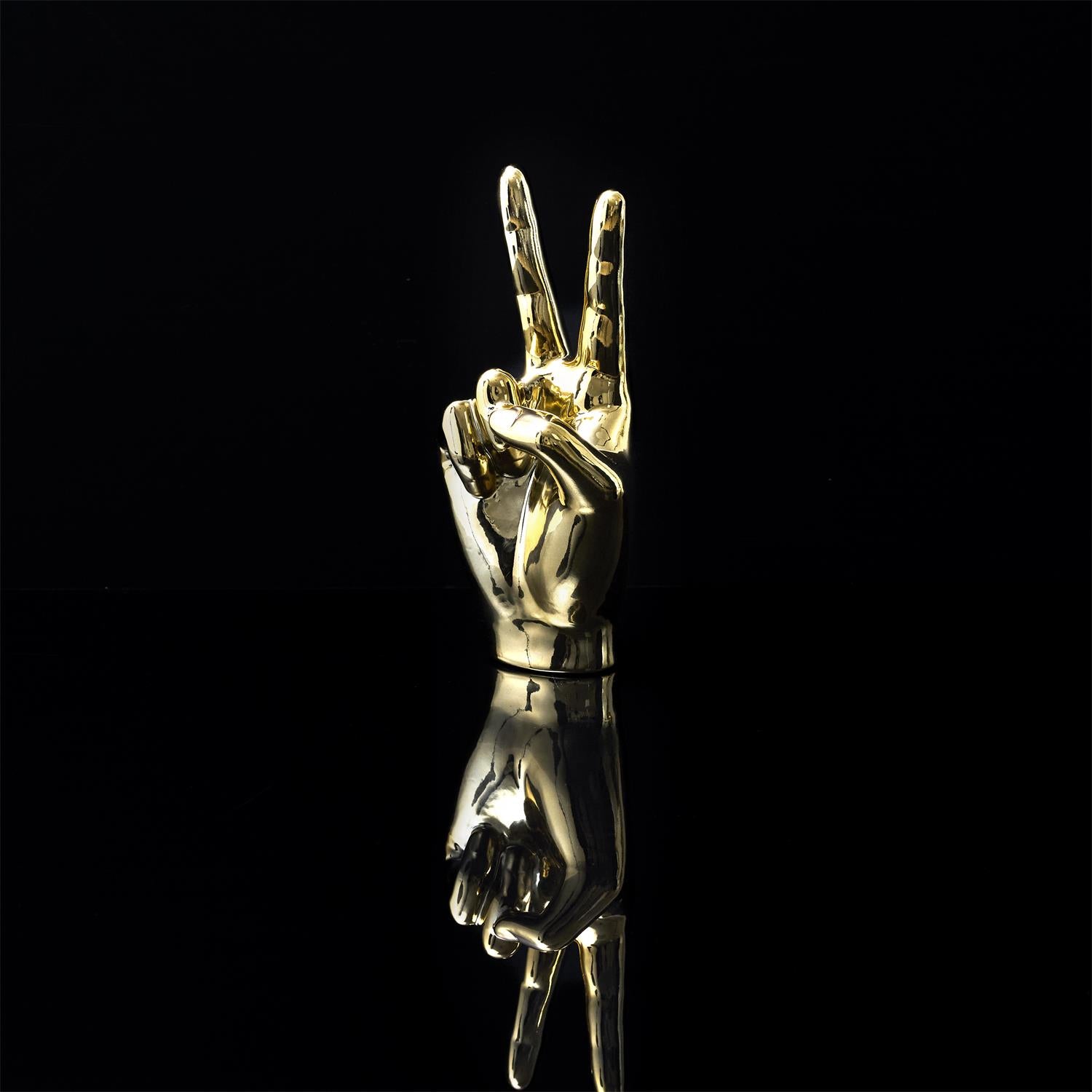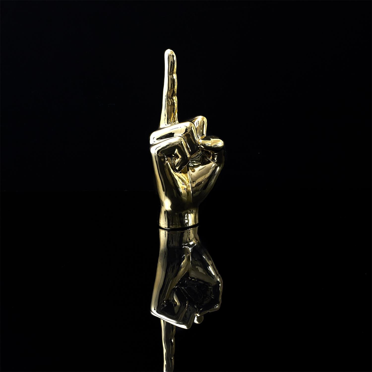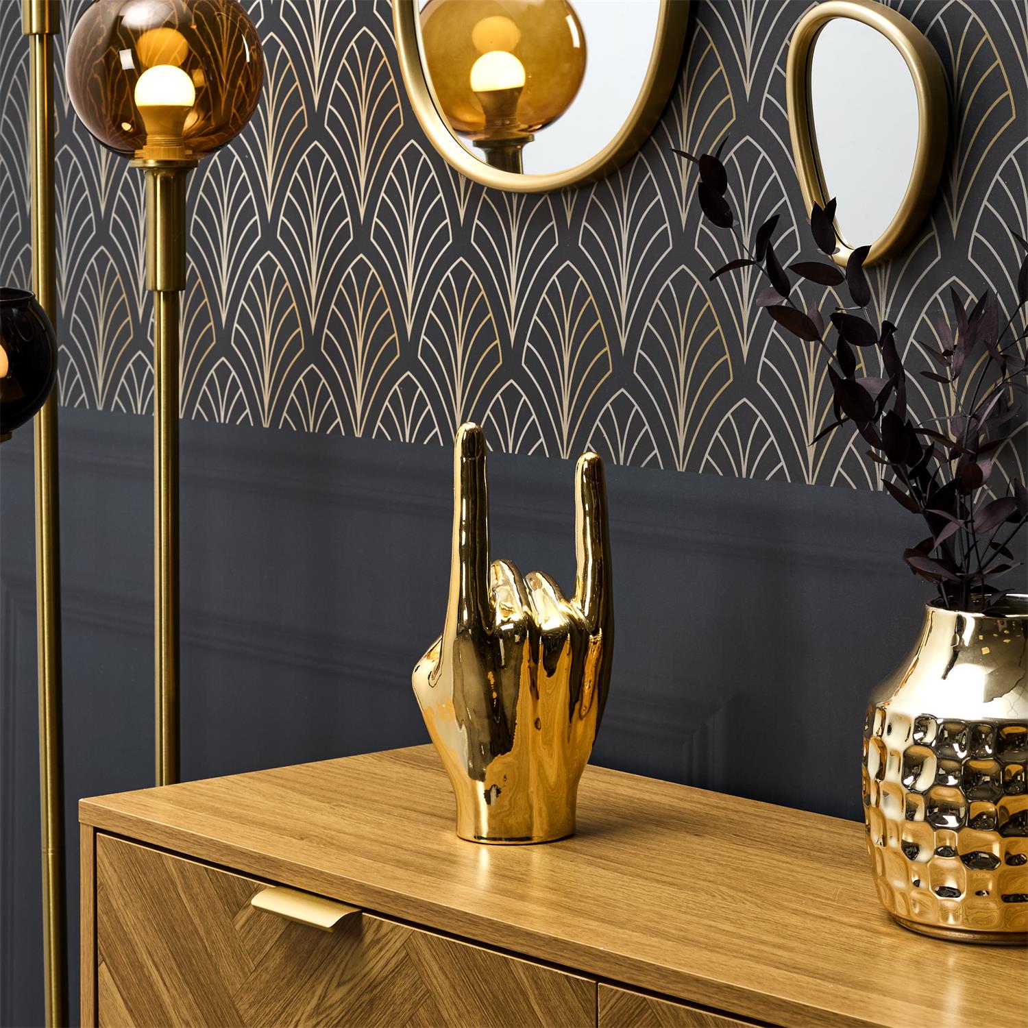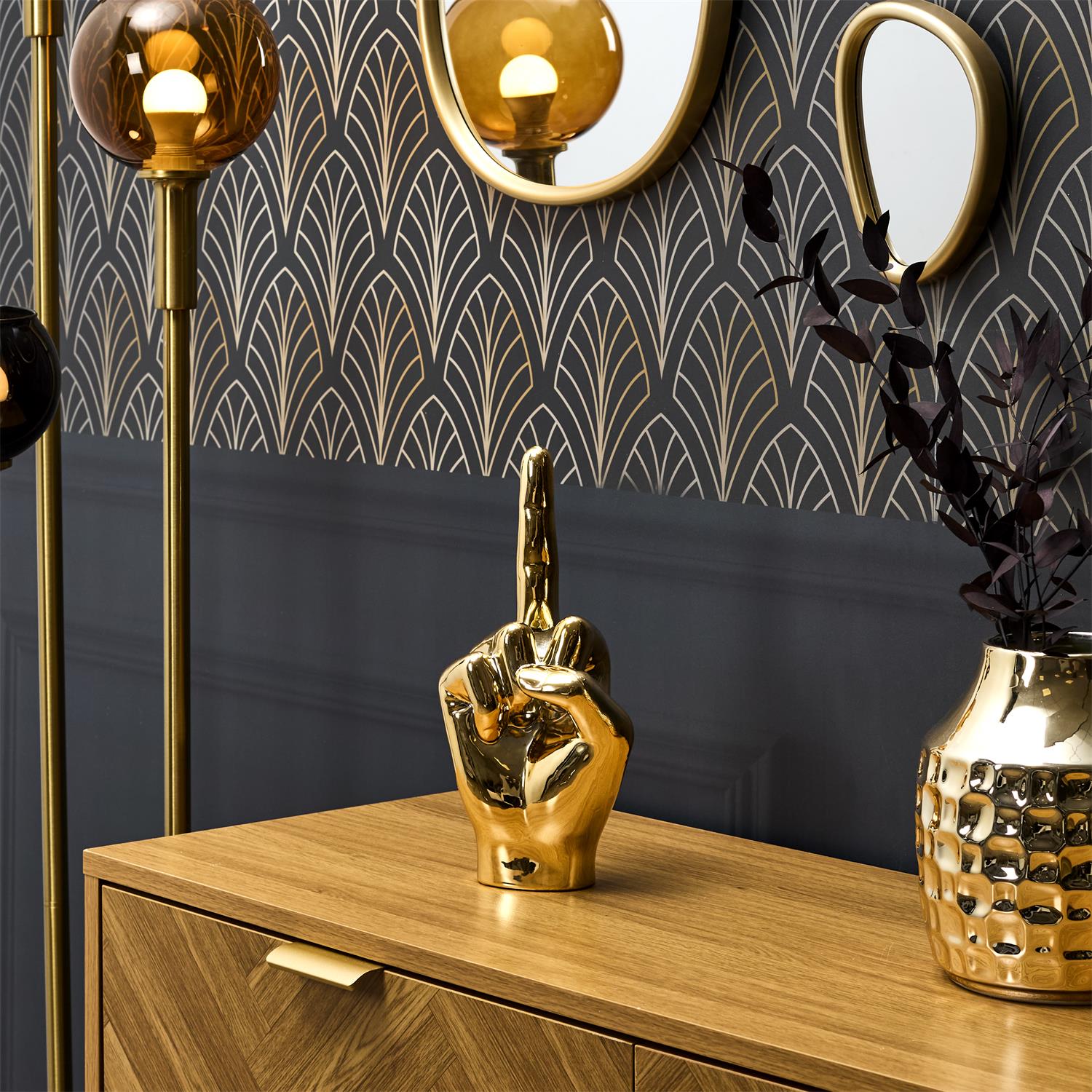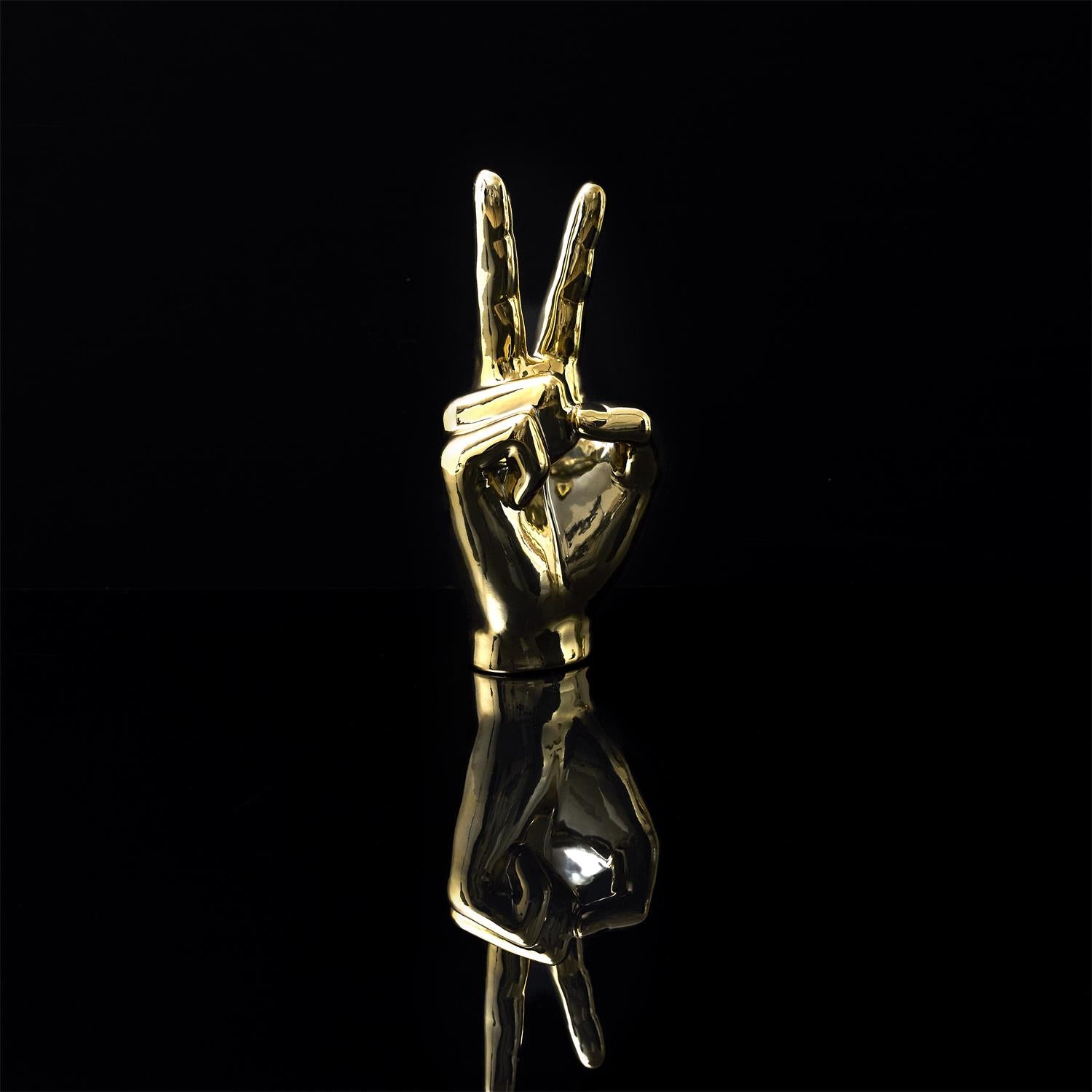 Modernā un izteiksmīgā keramikas figūra zelta tonī ar rokas žestu piešķir interjeram drosmīgu, stilīgu akcentu. Spīdīgā pārklājuma skulpturālā forma padara šo dekoru par pamanāmu dizaina elementu, kas lieliski iederas mūsdienīgā, industriālā vai luksusa interjerā.