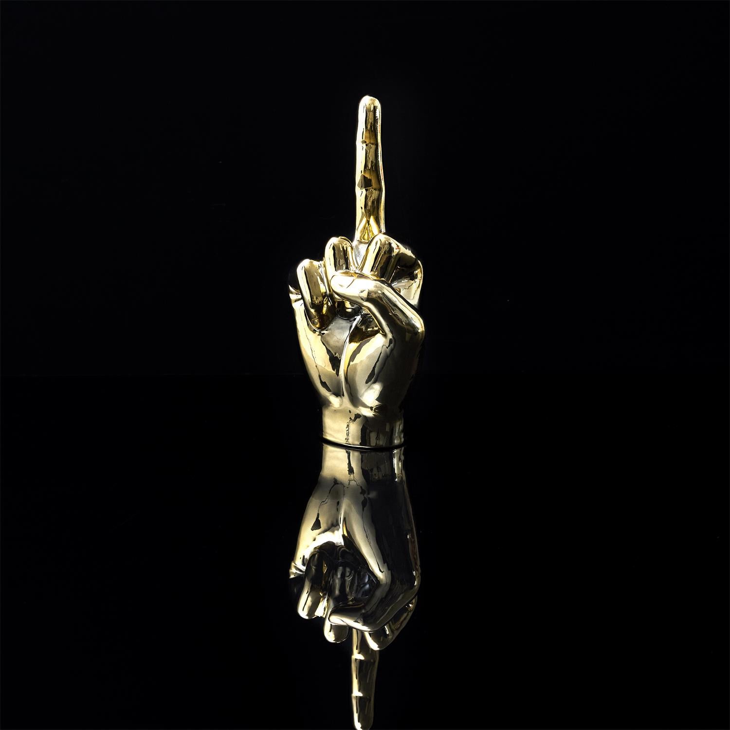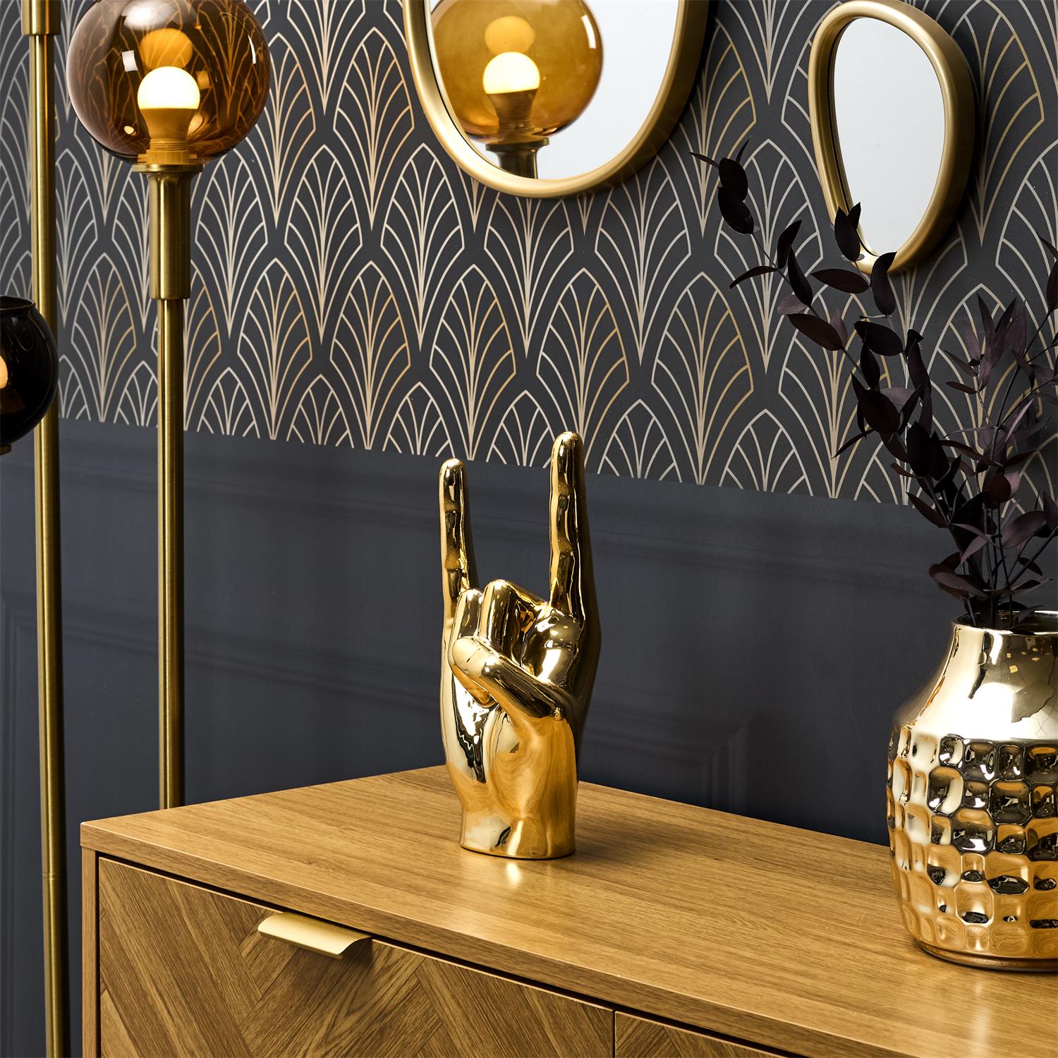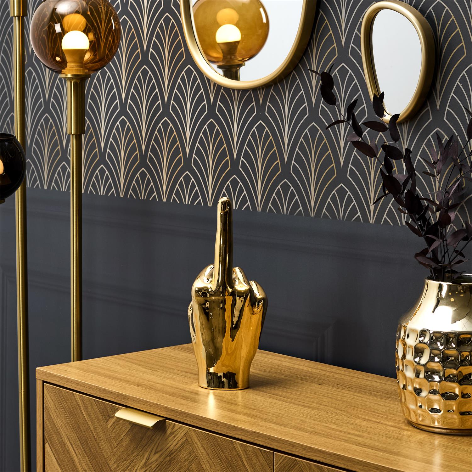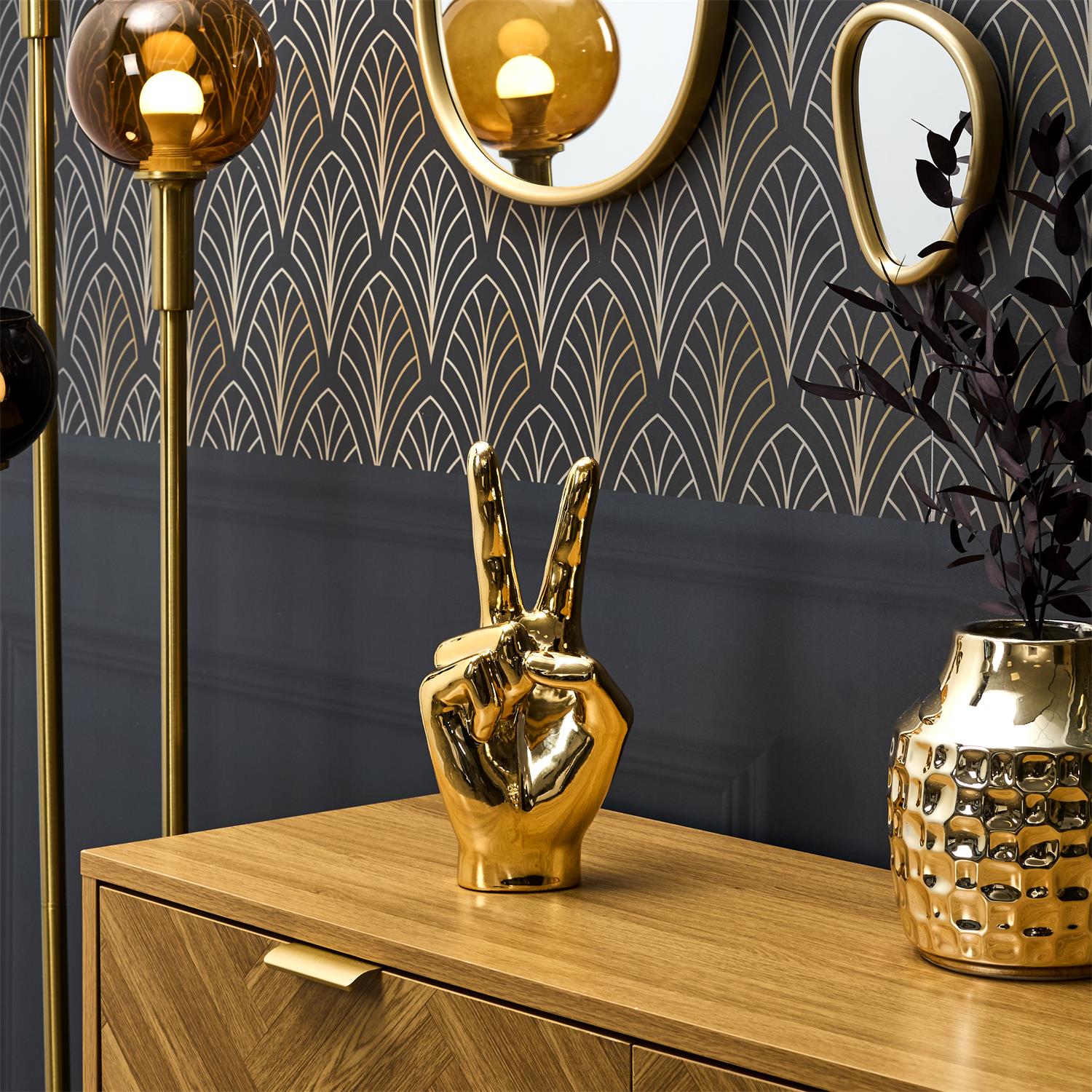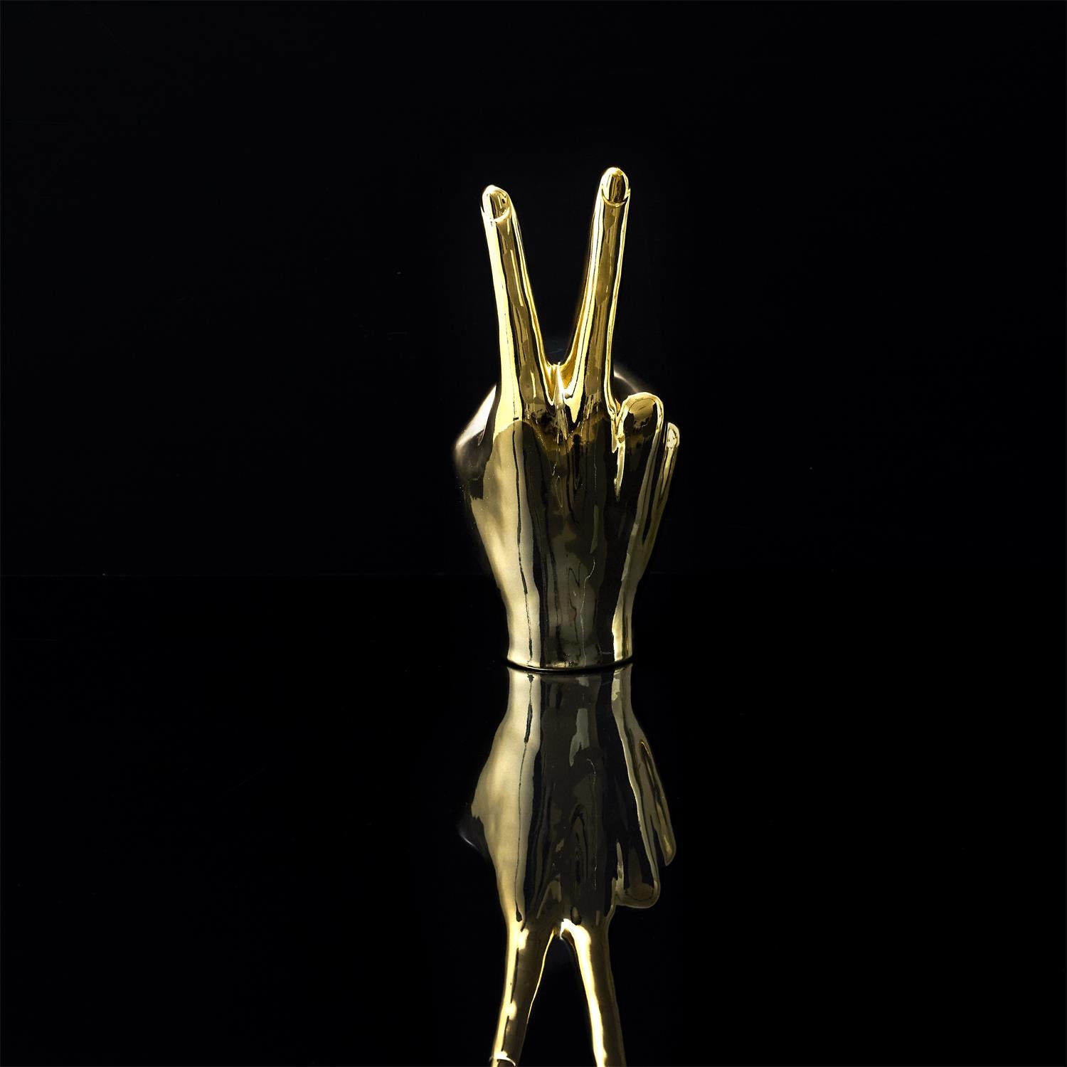 Modernā un izteiksmīgā keramikas figūra zelta tonī ar rokas žestu piešķir interjeram drosmīgu, stilīgu akcentu. Spīdīgā pārklājuma skulpturālā forma padara šo dekoru par pamanāmu dizaina elementu, kas lieliski iederas mūsdienīgā, industriālā vai luksusa interjerā.