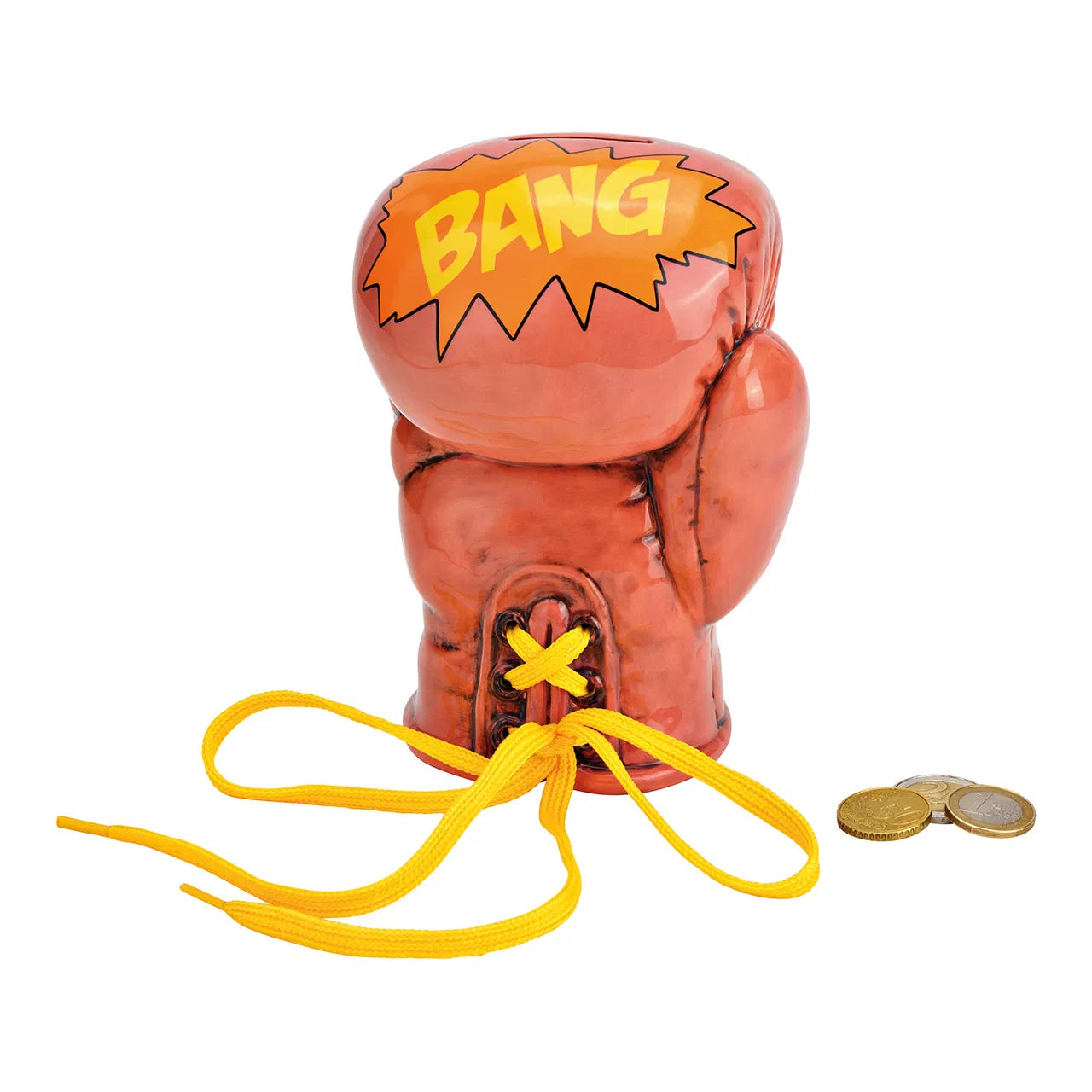Oriģināla un stilīga keramikas krājkase boksa cimda formā, kas lieliski papildinās gan interjeru, gan kļūs par motivējošu akcentu ikdienas uzkrājumiem. Brūnīgi rozā krāsa un grafiskais uzraksts “BANG” piešķir izteiksmīgu, nedaudz rotaļīgu raksturu, savukārt detaļas – dekoratīvā šņorēšana – rada autentisku boksa cimda efektu.