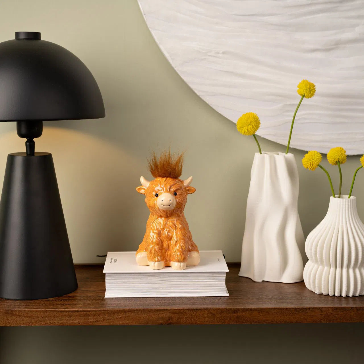 Mīļa un dekoratīva keramikas krājkase gotiņas formā, kas izceļas ar siltu brūnu toni, detalizētu faktūru un rotaļīgu akcentu – pūkainu matu kušķīti. Šis dizains piešķir krājkasei īpašu raksturu un padara to par pamanāmu interjera elementu gan bērnu istabā, gan viesistabā vai uz plaukta kā dizaina akcentu.