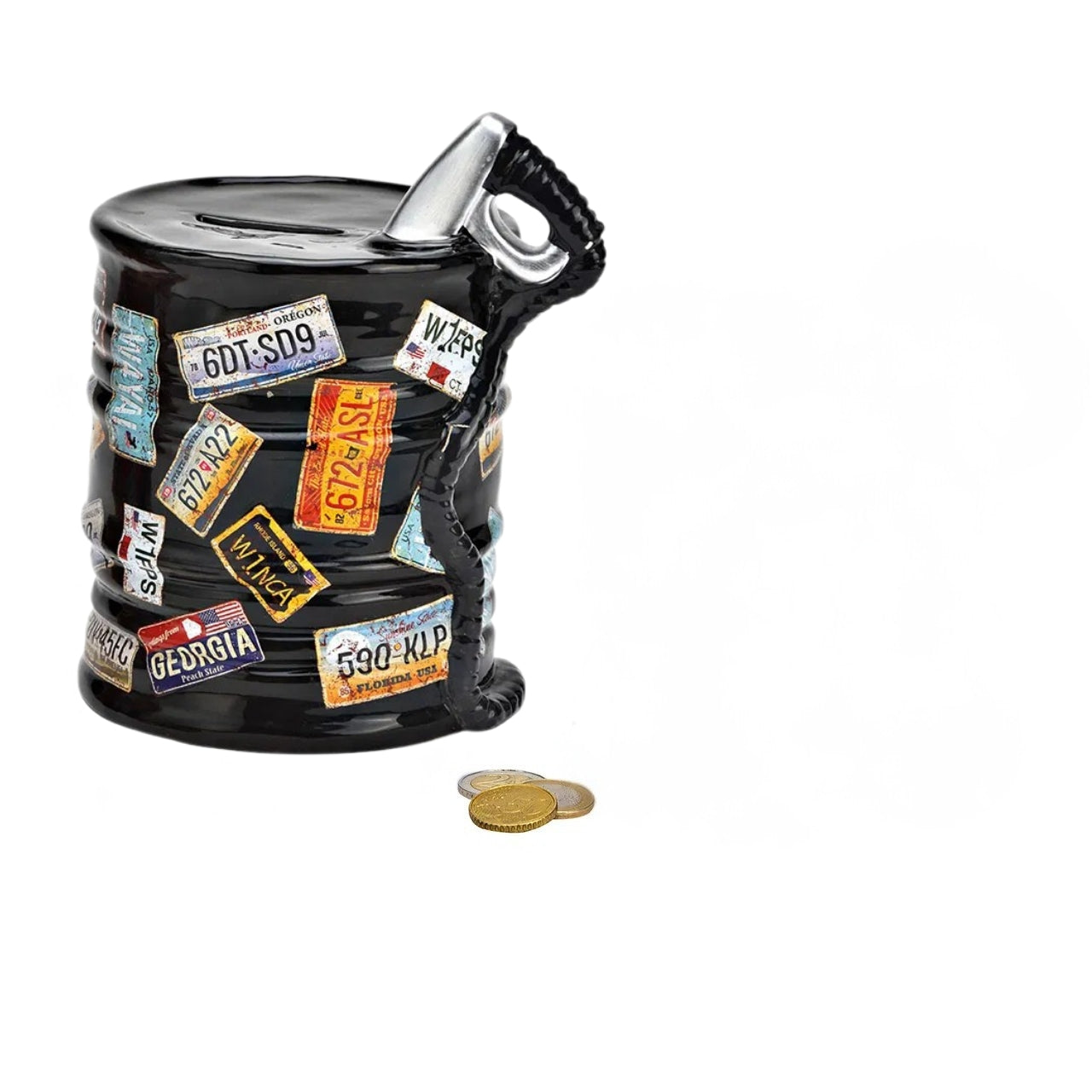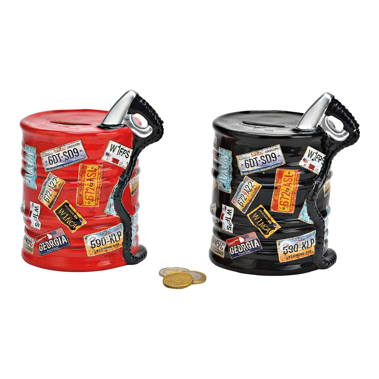 Industriāla stila keramikas krājkase naftas mucas formā, kas izceļas ar detalizētu dizainu un dekoratīvām numura zīmju uzlīmēm. Šī krājkase ir pieejama divās krāsās – melnā un sarkanā, padarot to par izteiksmīgu interjera akcentu modernā, lofta vai industriālā stilā iekārtotās telpās.