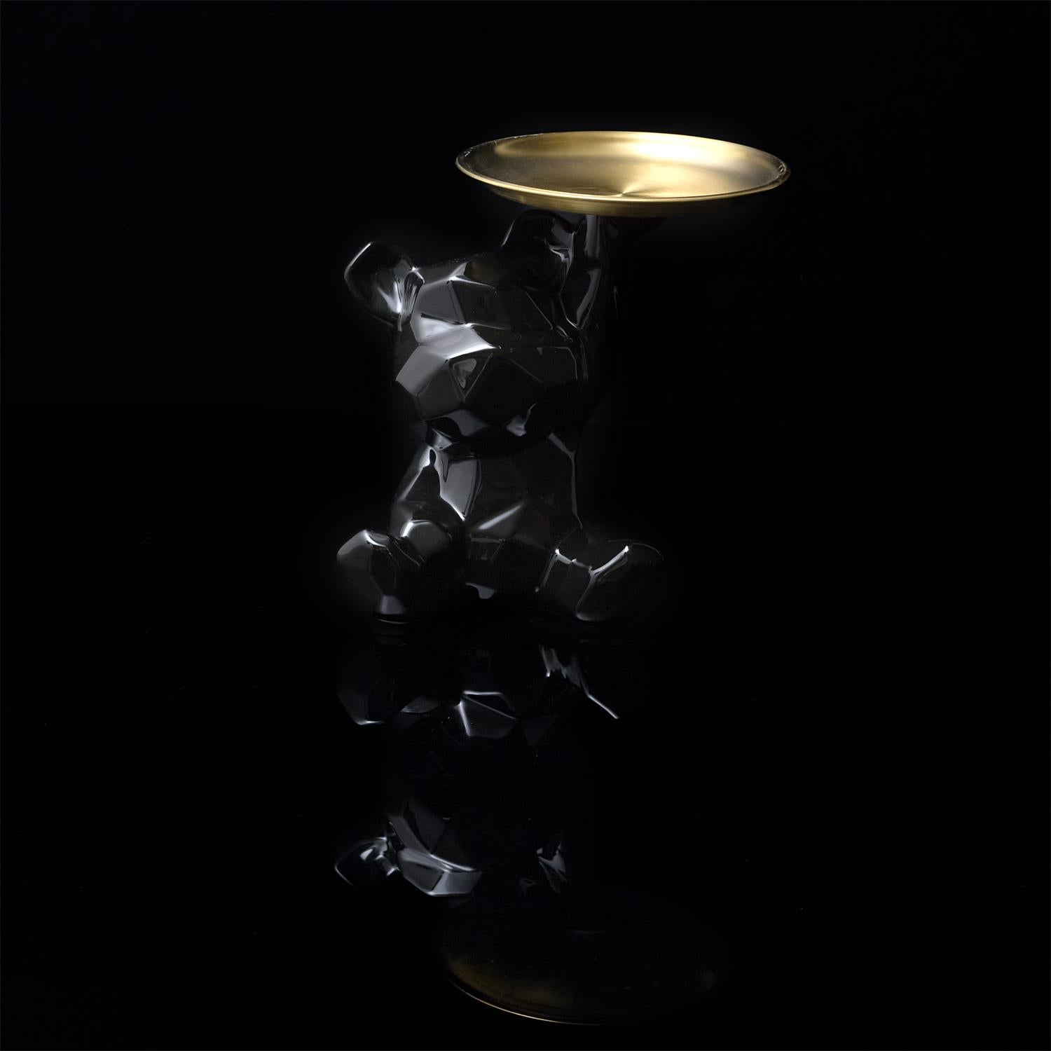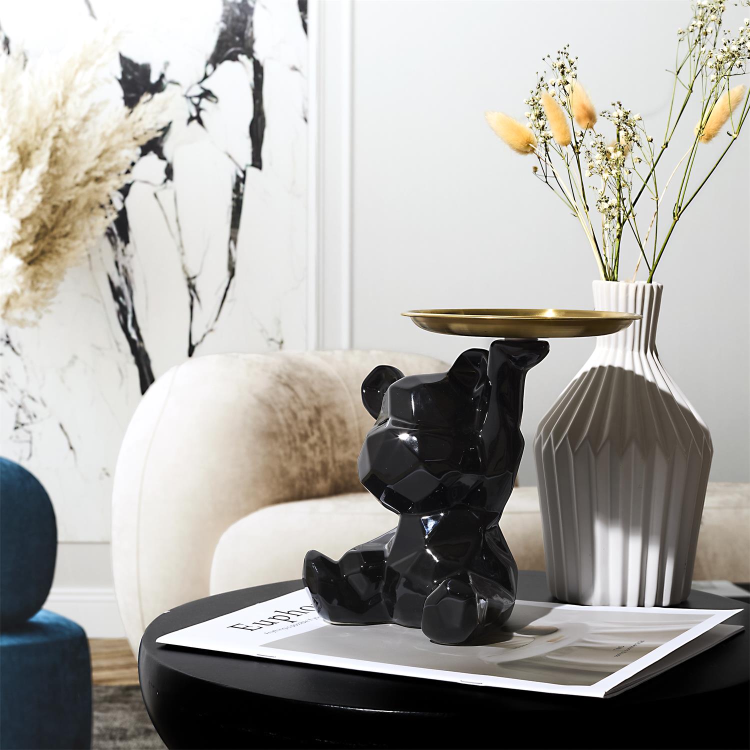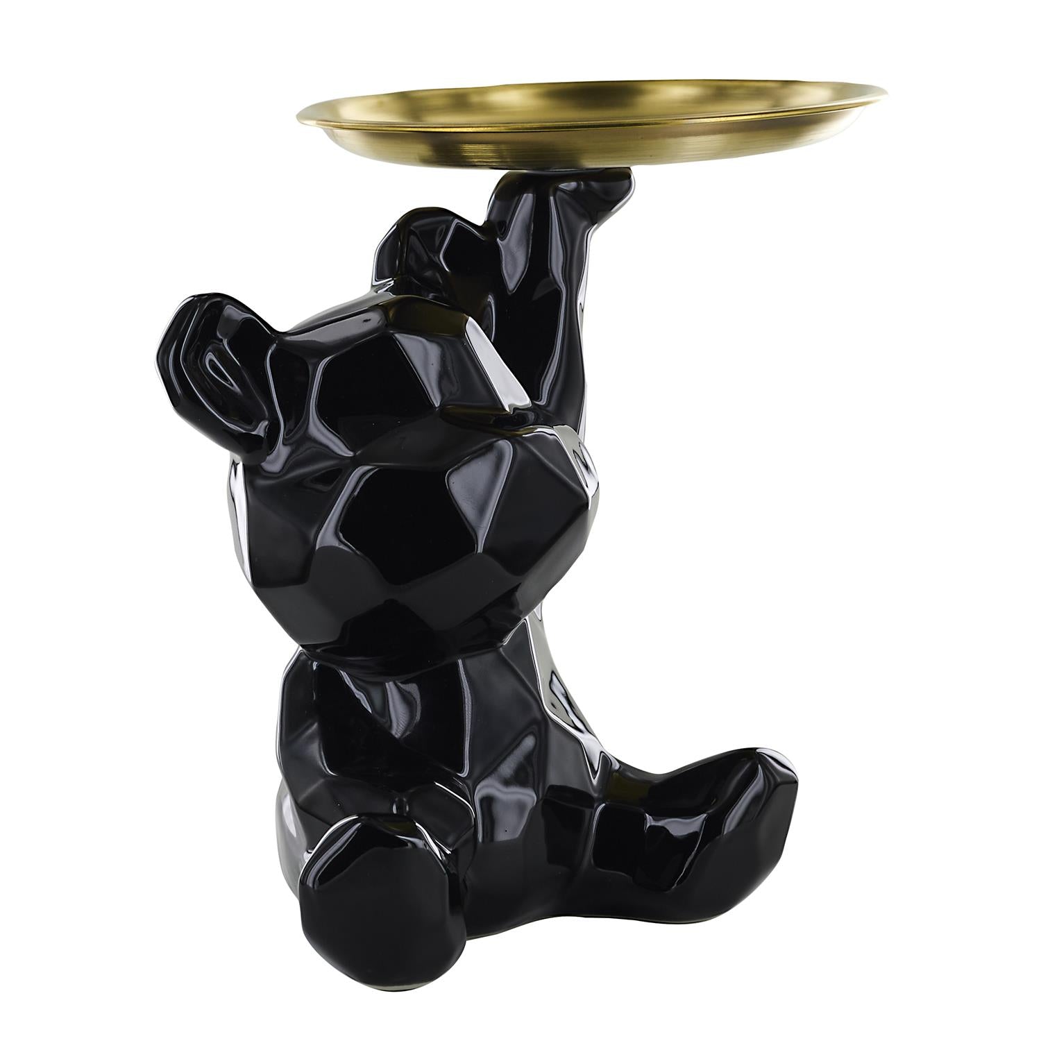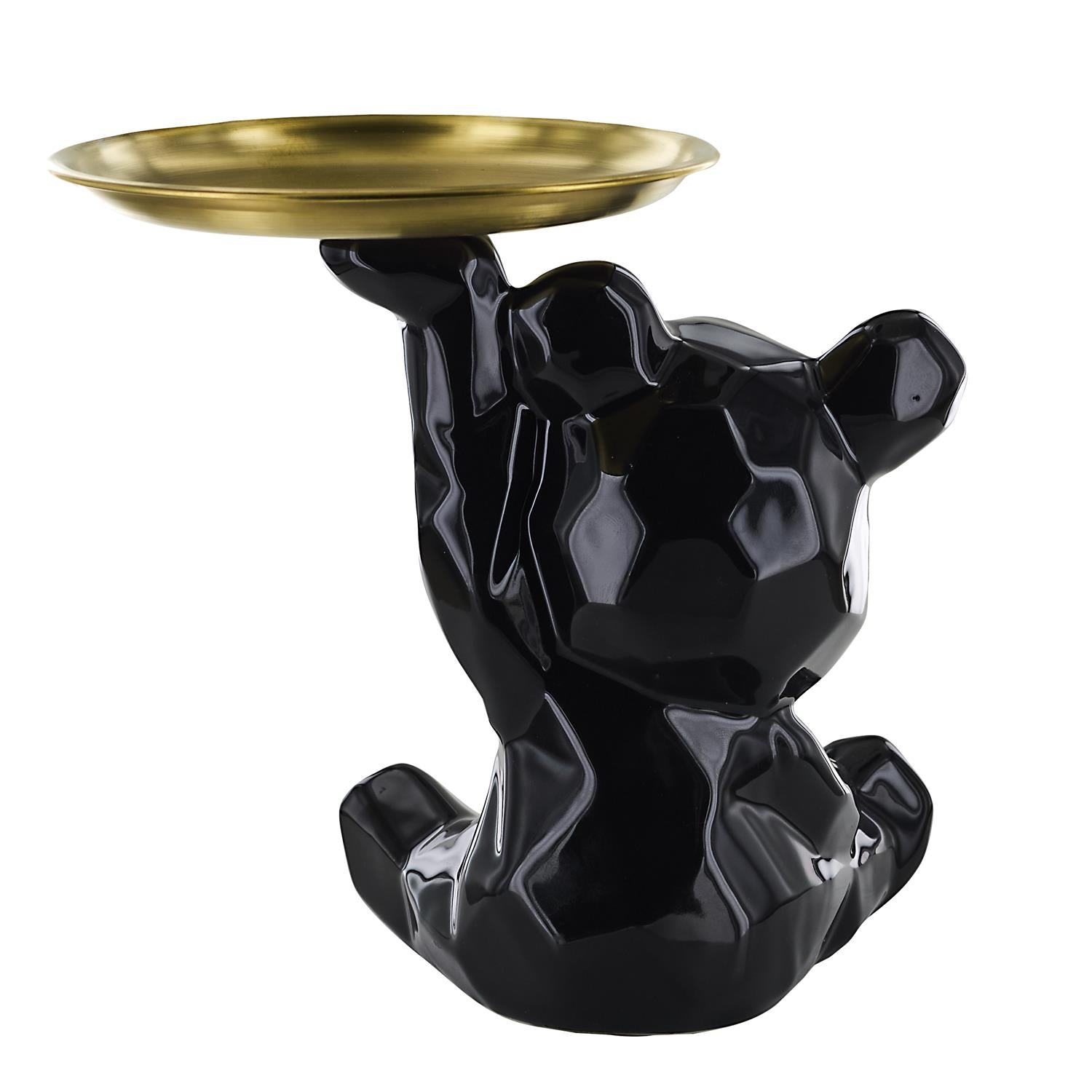 Stilīga un rotaļīga keramikas figūra melnā krāsā ar zelta toņa paplāti, kas kalpo gan kā dekoratīvs akcents, gan praktisks interjera elements. Lācītis ar paceltu paplāti piesaista skatienu un piešķir telpai modernu, nedaudz ironisku dizaina noskaņu.