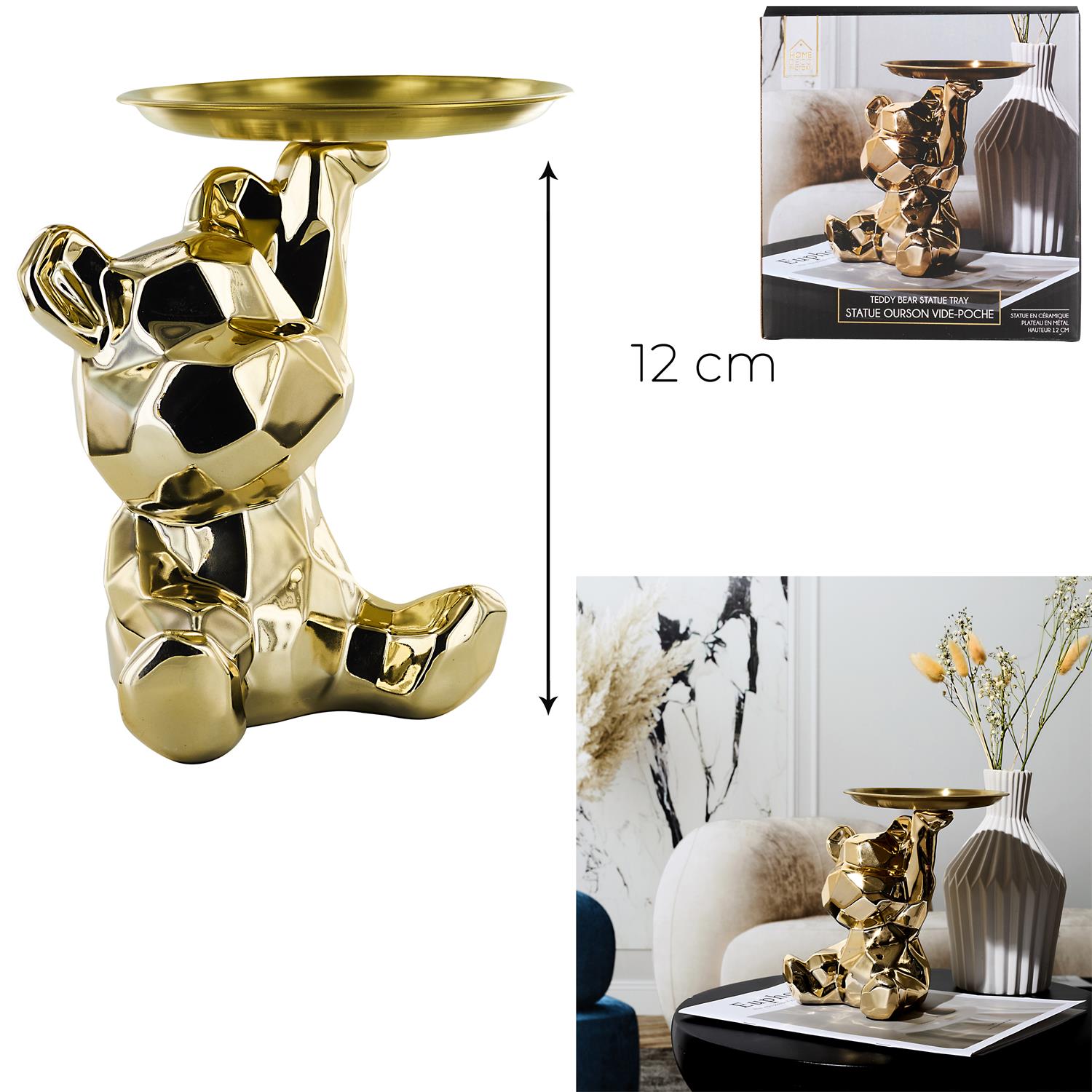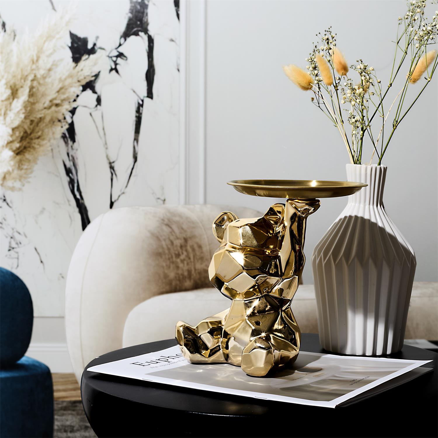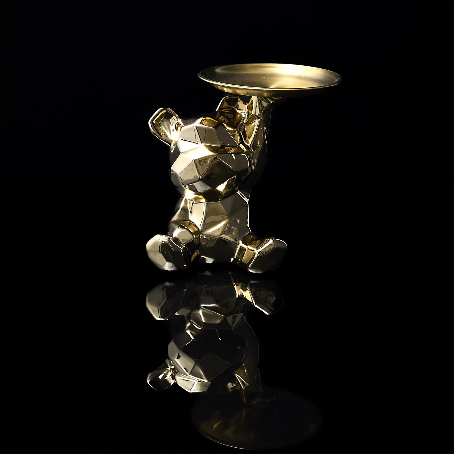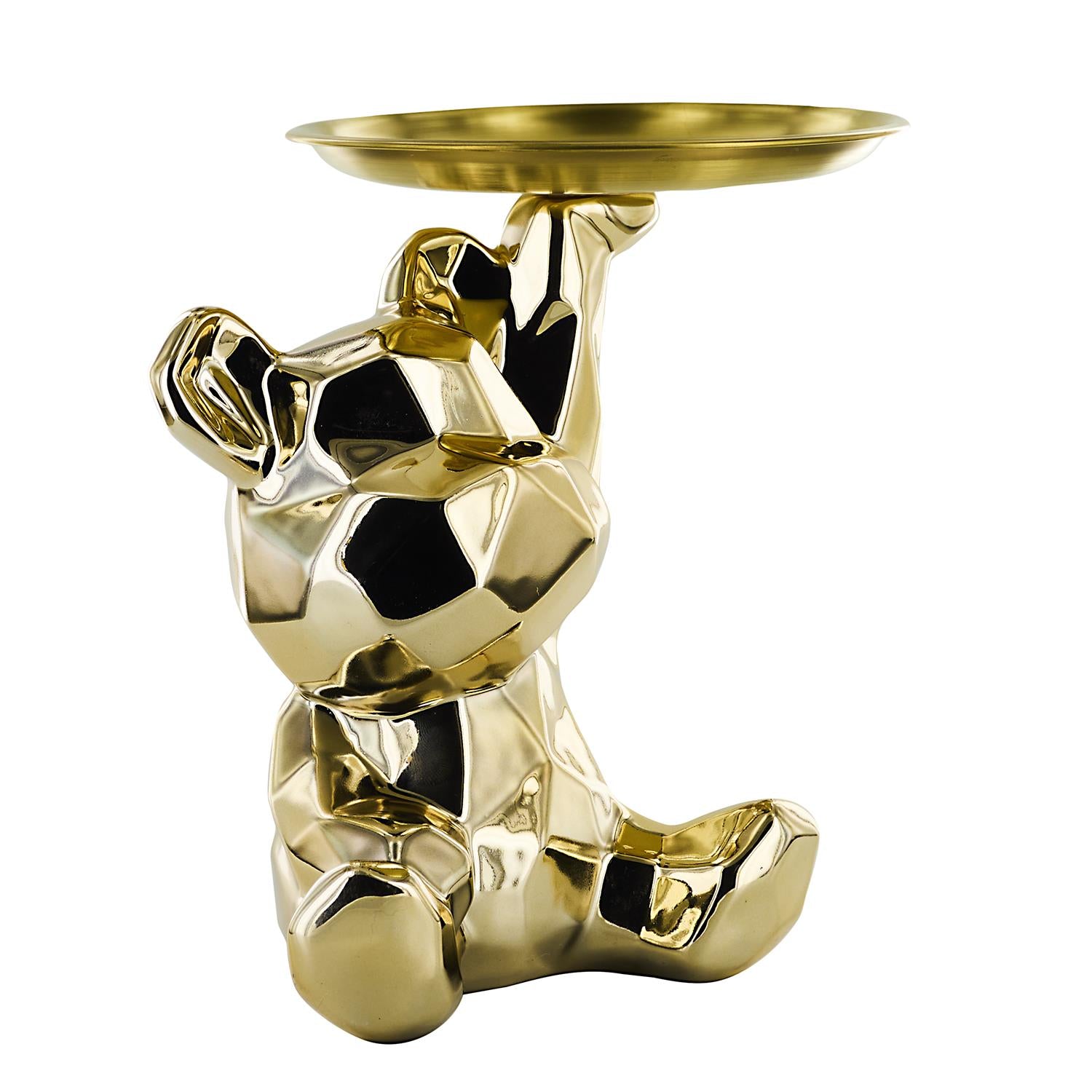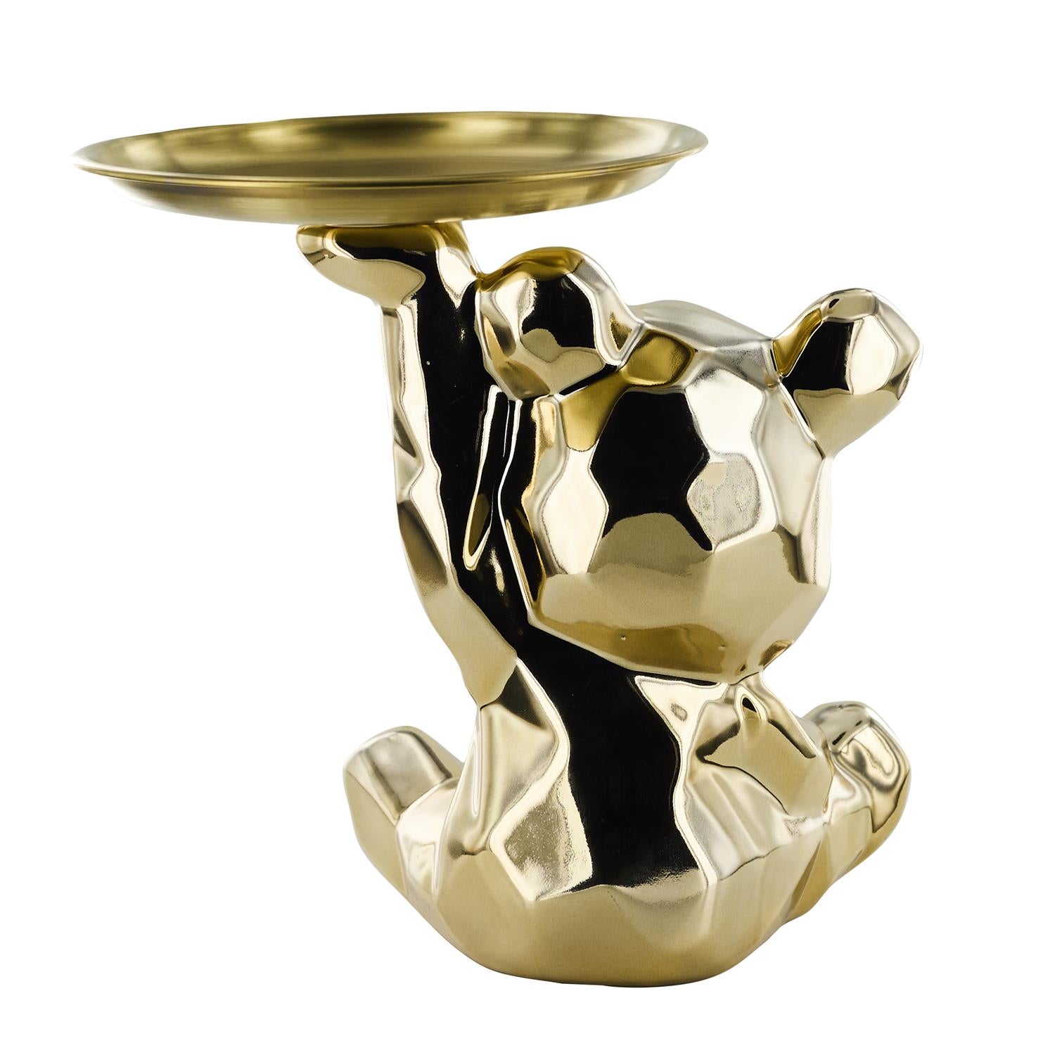 Stilīga un rotaļīga keramikas figūra zelta krāsā ar zelta toņa paplāti, kas kalpo gan kā dekoratīvs akcents, gan praktisks interjera elements. Lācītis ar paceltu paplāti piesaista skatienu un piešķir telpai modernu, nedaudz ironisku dizaina noskaņu.