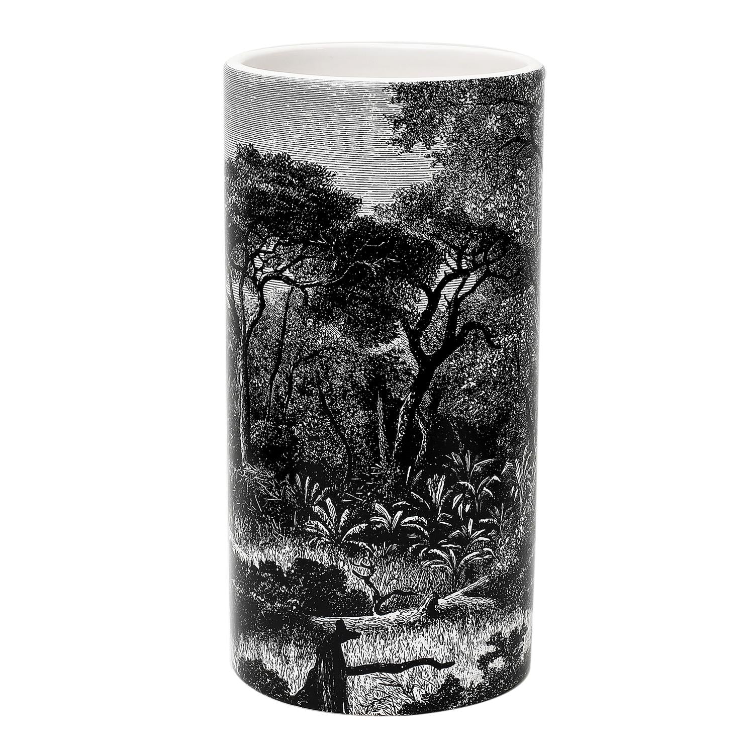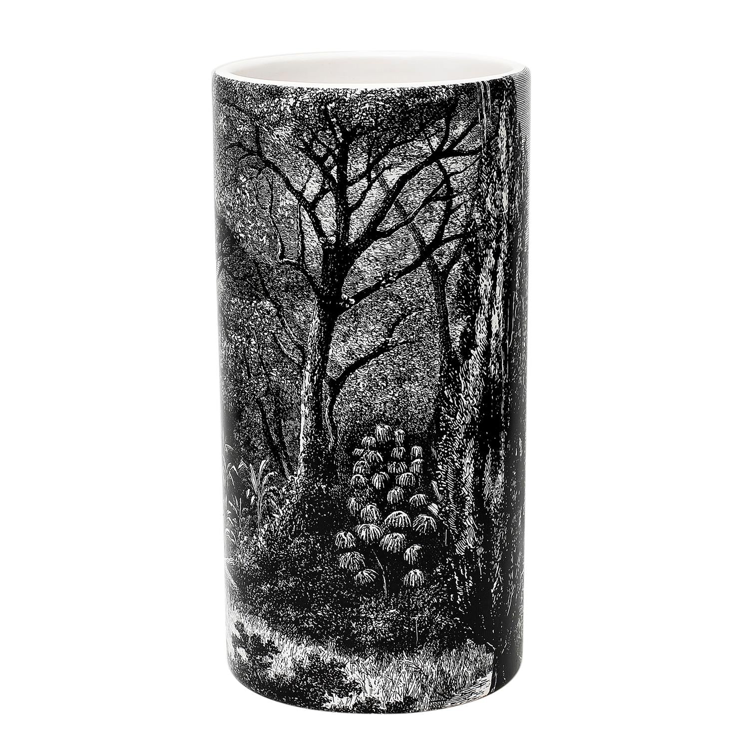 Šī izsmalcinātā keramikas vāze piešķirs interjeram īpašu noskaņu, pateicoties tās melnbaltajam meža ilustrācijas dizainam. Detalizētā grafika piešķir māksliniecisku dziļumu, padarot vāzi par īstu akcenta priekšmetu jūsu mājoklī.