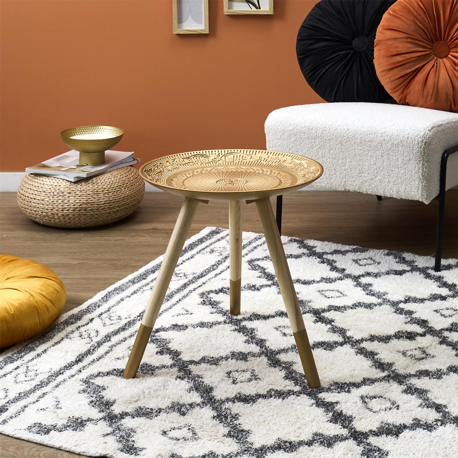 Pievieno interjeram izteiksmīgu akcentu ar šo eleganto dekoratīvo galdiņu. Stabilā dabīgā koka konstrukcija apvienota ar detalizēti grebtu virsmu, kas piešķir telpai unikālu raksturu un vieglu boho–luksusa noskaņu. Ideāli piemērots kā sānu galdiņš, telpaugu pamatne vai stilīgs interjera akcents.