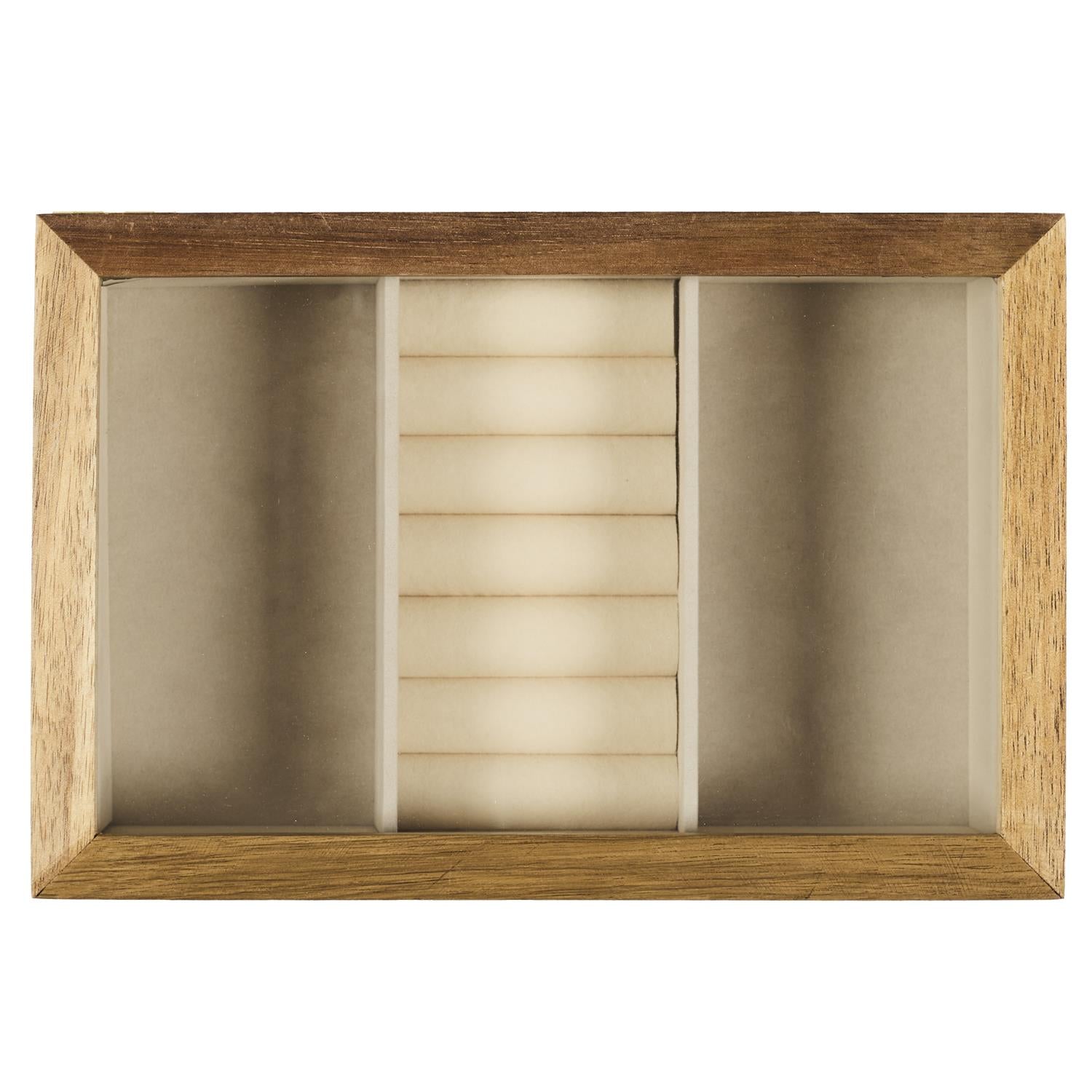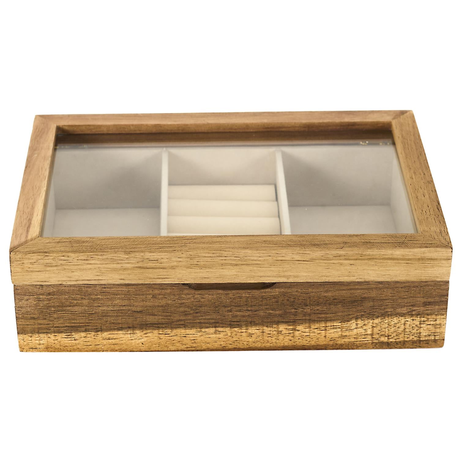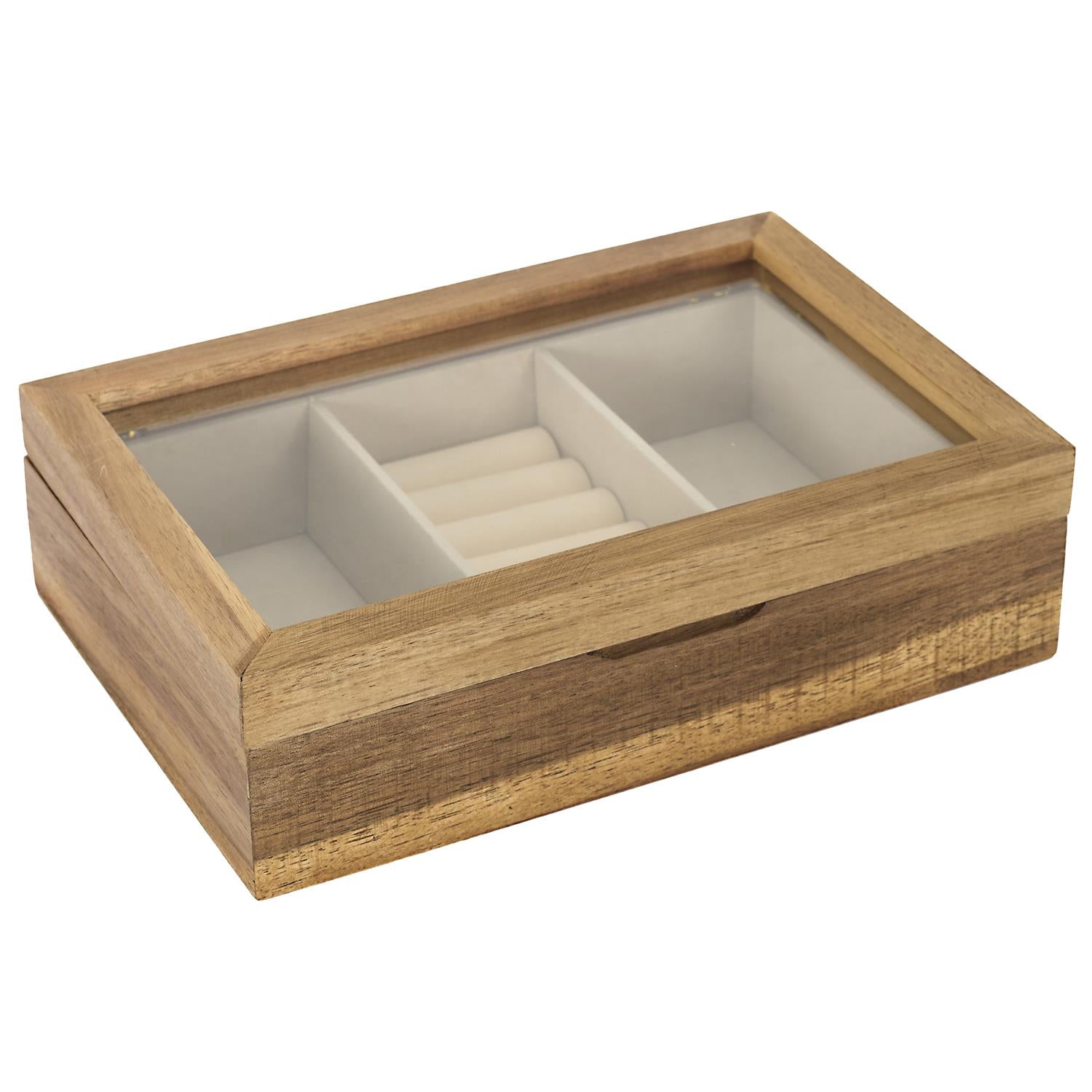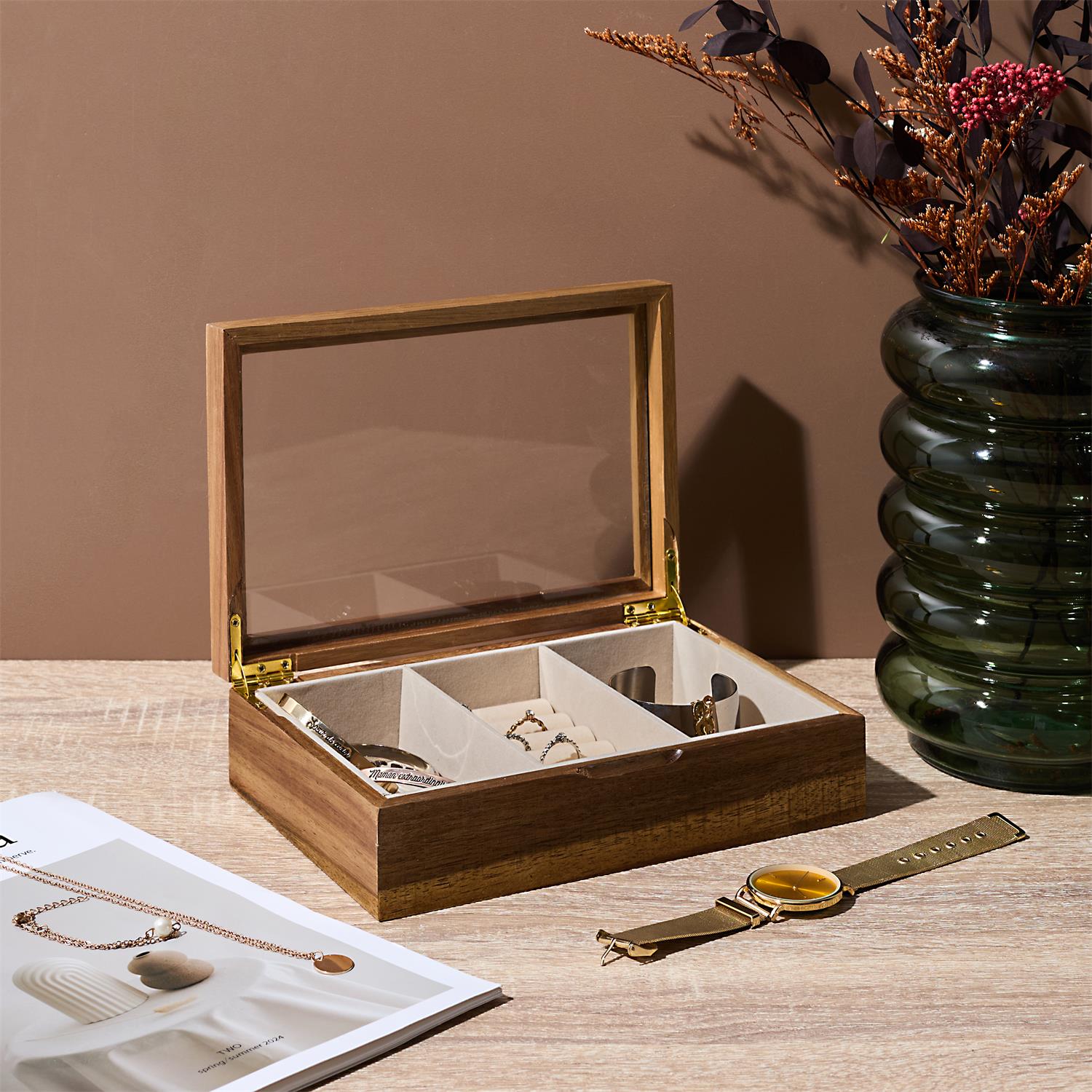 Eleganta un praktiska rotu lādīte no dabīga koka, kas lieliski apvieno funkcionalitāti ar estētisku dizainu. Caurspīdīgais stikla vāks ļauj ērti pārskatīt rotas, vienlaikus pasargājot tās no putekļiem, bet iekšējais samta oderējums nodrošina maigu un drošu glabāšanu.