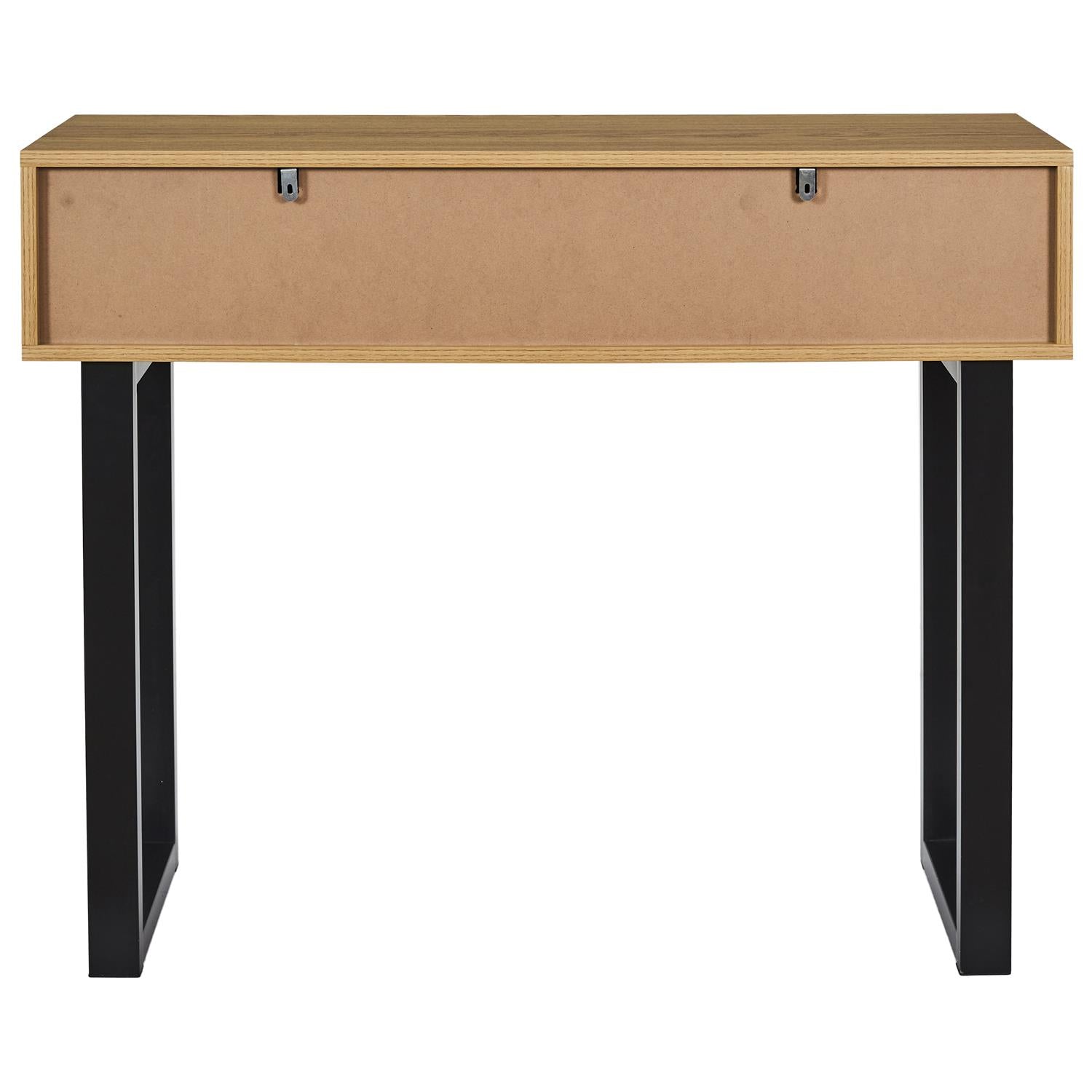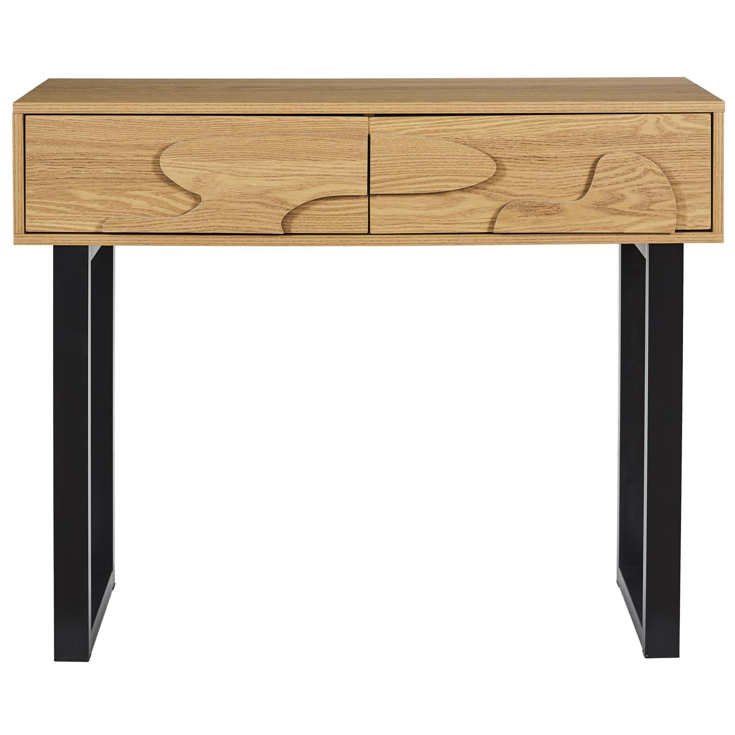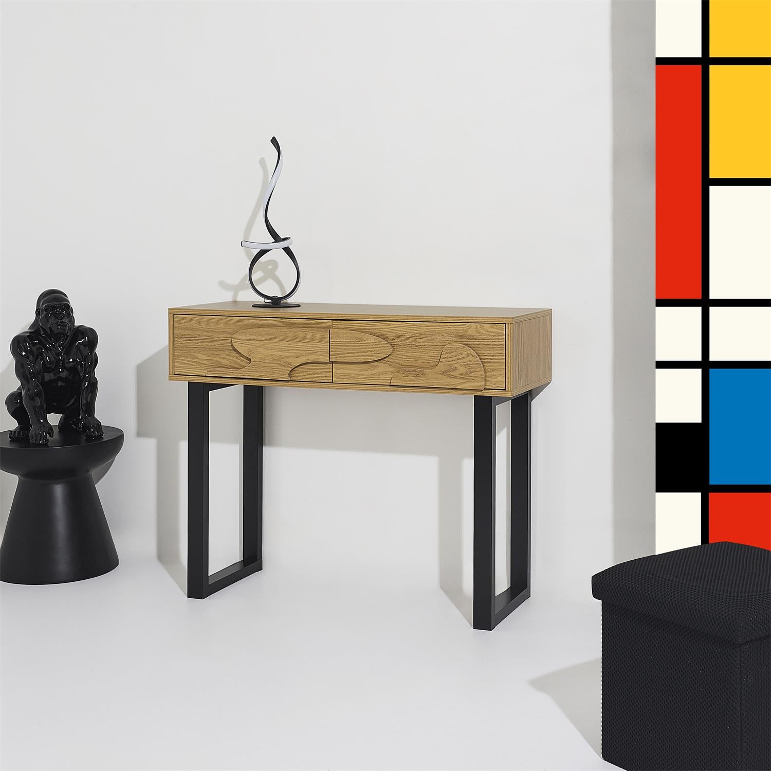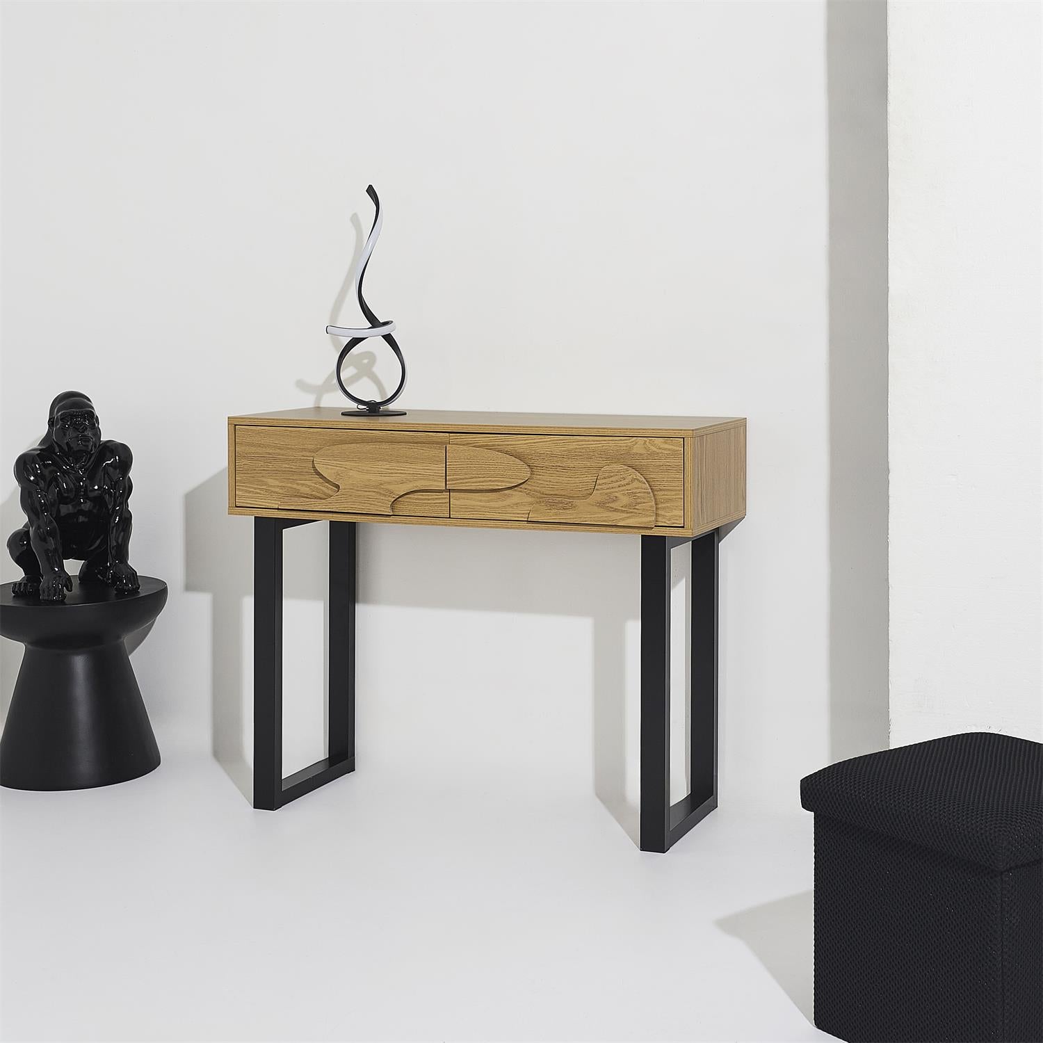 Dabīgais ozolkoka tonis lieliski kontrastē ar melna metāla kājām, radot mūsdienīgu un stabilu konstrukciju. Šī konsole ir ideāli piemērota priekšnamam, viesistabai, gaitenim vai guļamistabai — gan dekoru izvietošanai, gan ikdienas sīkumu glabāšanai.