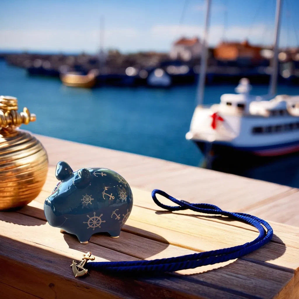 Eleganta un tematiskā keramikas krājkase jūras stilā, kas izceļas ar dziļi zilu krāsu un baltām jūras simbolu detaļām – stūriem un enkuriem. Šis mazais sivēns piešķir interjeram svaigu, mierpilnu un nedaudz romantisku noskaņu, iedvesmojoties no jūras un ceļojumu tematikas.