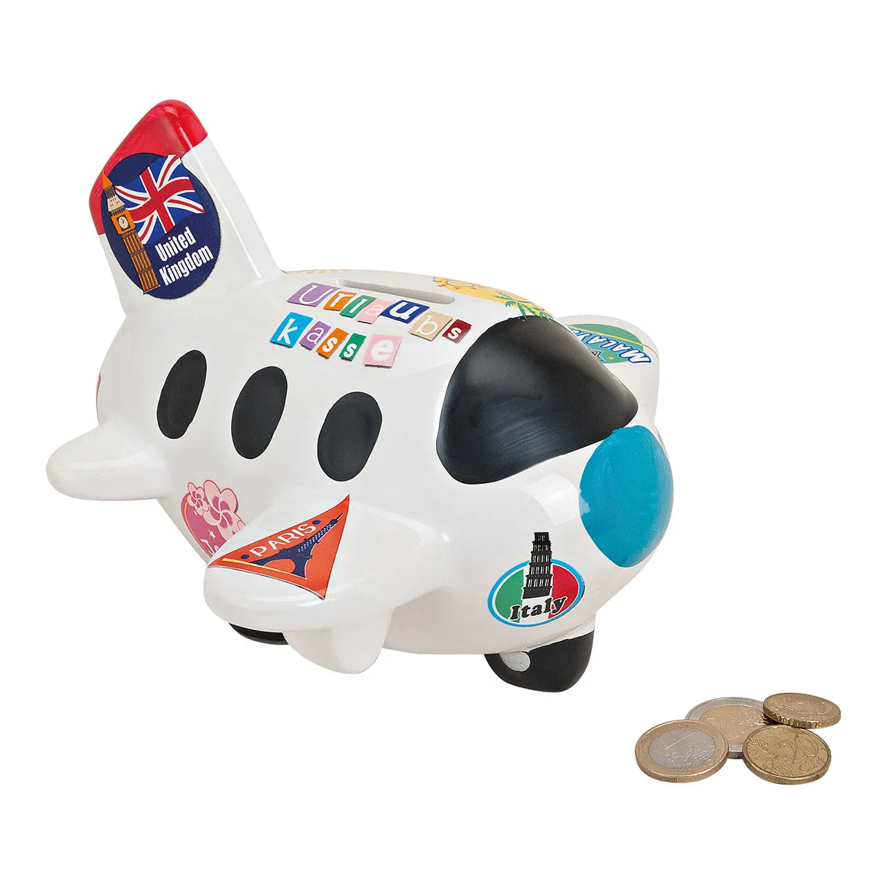 Keramikas krājkasīte lidmašīnas formā ar ceļojumu uzlīmēm ir lielisks veids, kā iedvesmot sapņus par ceļošanu un vienlaikus krāt naudu nākamajiem piedzīvojumiem. Krāsainais dizains ar pasaules pilsētu un valstu simboliem padara to par oriģinālu dekoru gan bērnu istabā, gan pieaugušo interjerā.