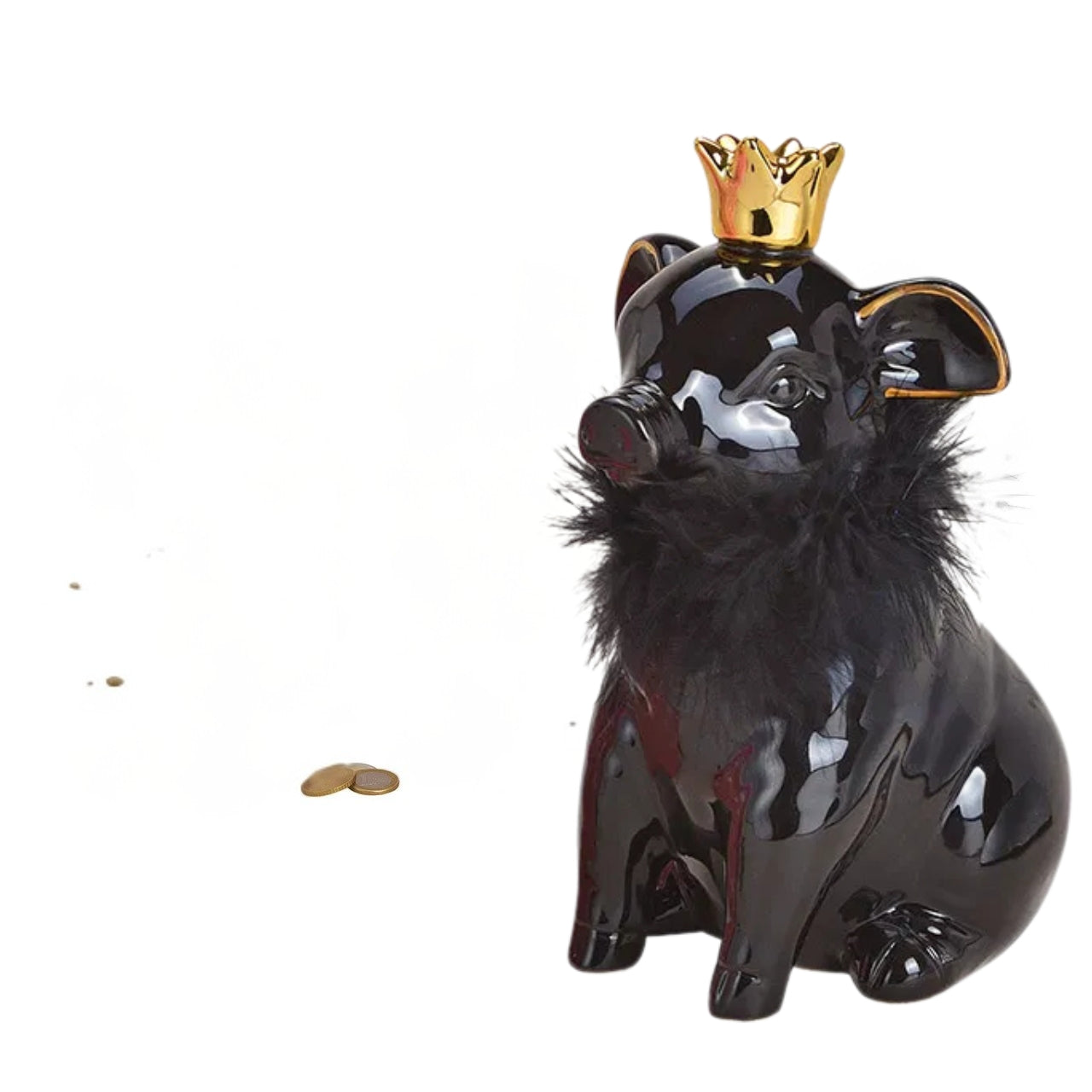 Krājkasīte Karaliskā cūciņa ar zelta kroni un dekoratīvu apkakli – balta / rozā / melna (3 varianti)