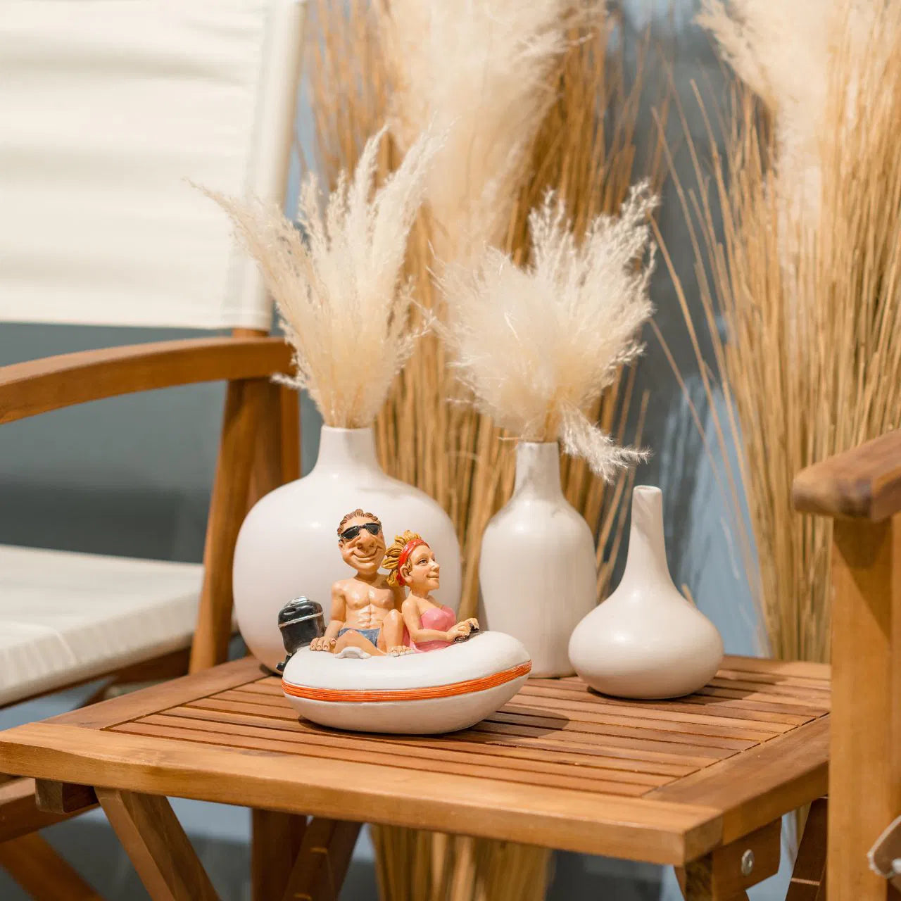 Šī oriģinālā krājkasīte motorlaivas formā ar jautru pāra figūru ir lielisks humora un vasarīga noskaņojuma akcents interjerā. Tā apvieno praktisku naudas krāšanas funkciju ar dekoratīvu, stāstu raisošu dizainu, kas uzreiz piesaista skatienu.