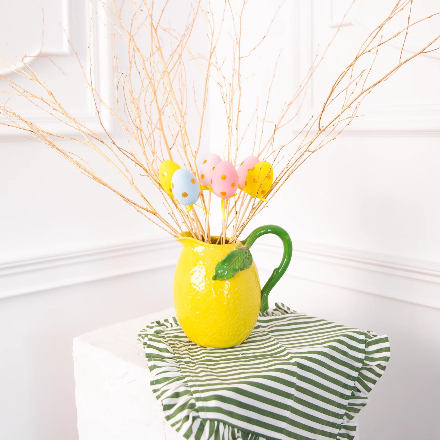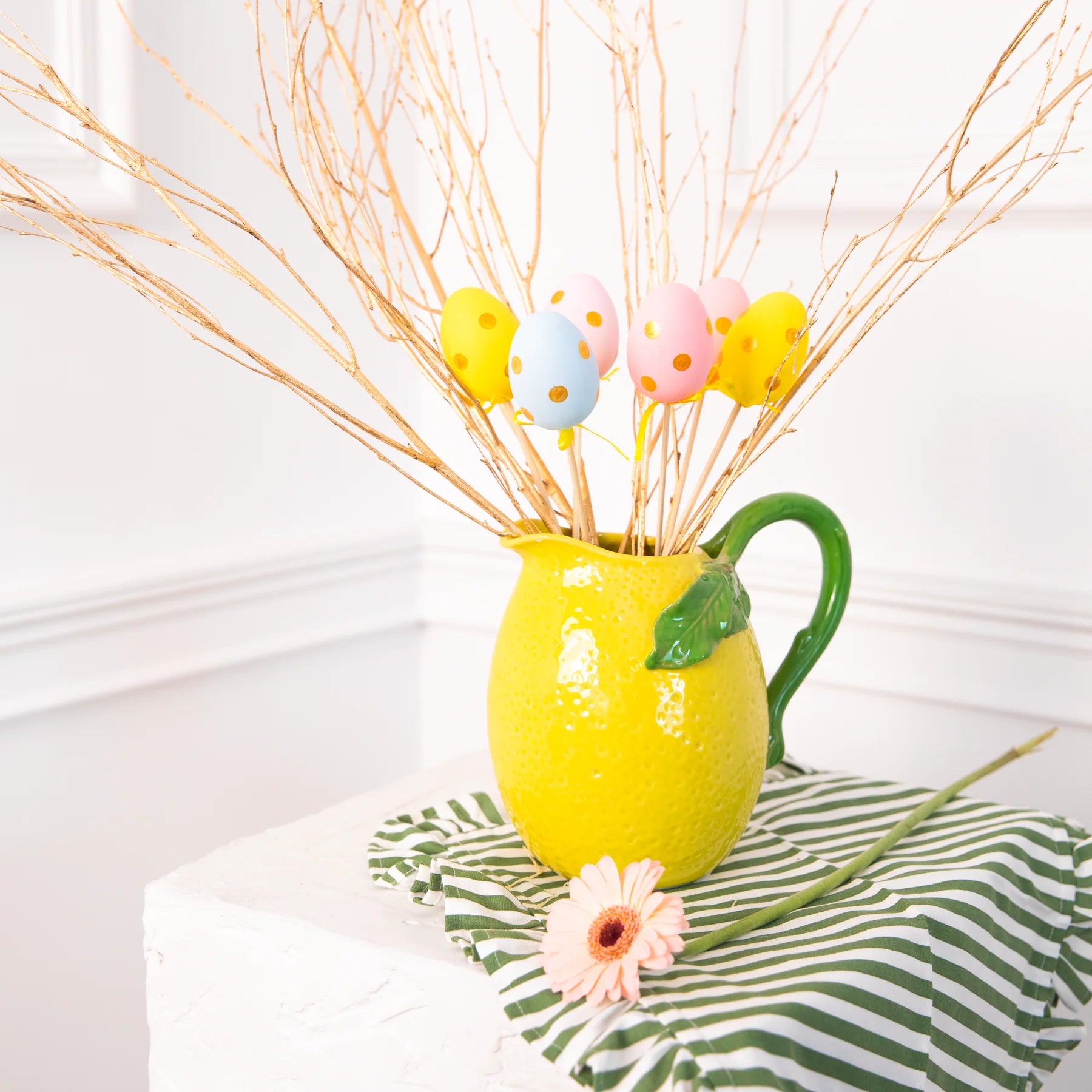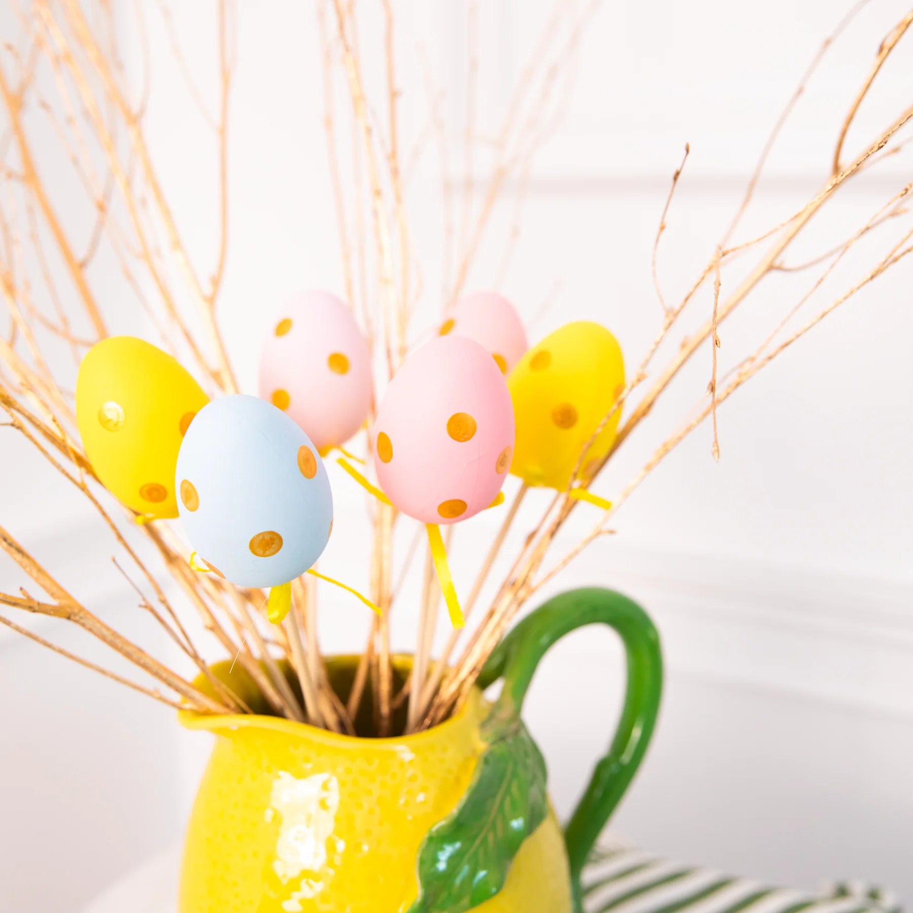 Piešķir savam mājoklim pavasarīgu un krāsainu noskaņu ar šīm burvīgajām Lieldienu dekoratīvajām olām uz kociņa. Maigos pasteļtoņos – dzeltenā, rozā, zilā un violetā – ar zelta punktu akcentiem un dekoratīvu lentīti, tās lieliski papildinās svētku kompozīcijas vāzēs, podos vai zaru dekoros.