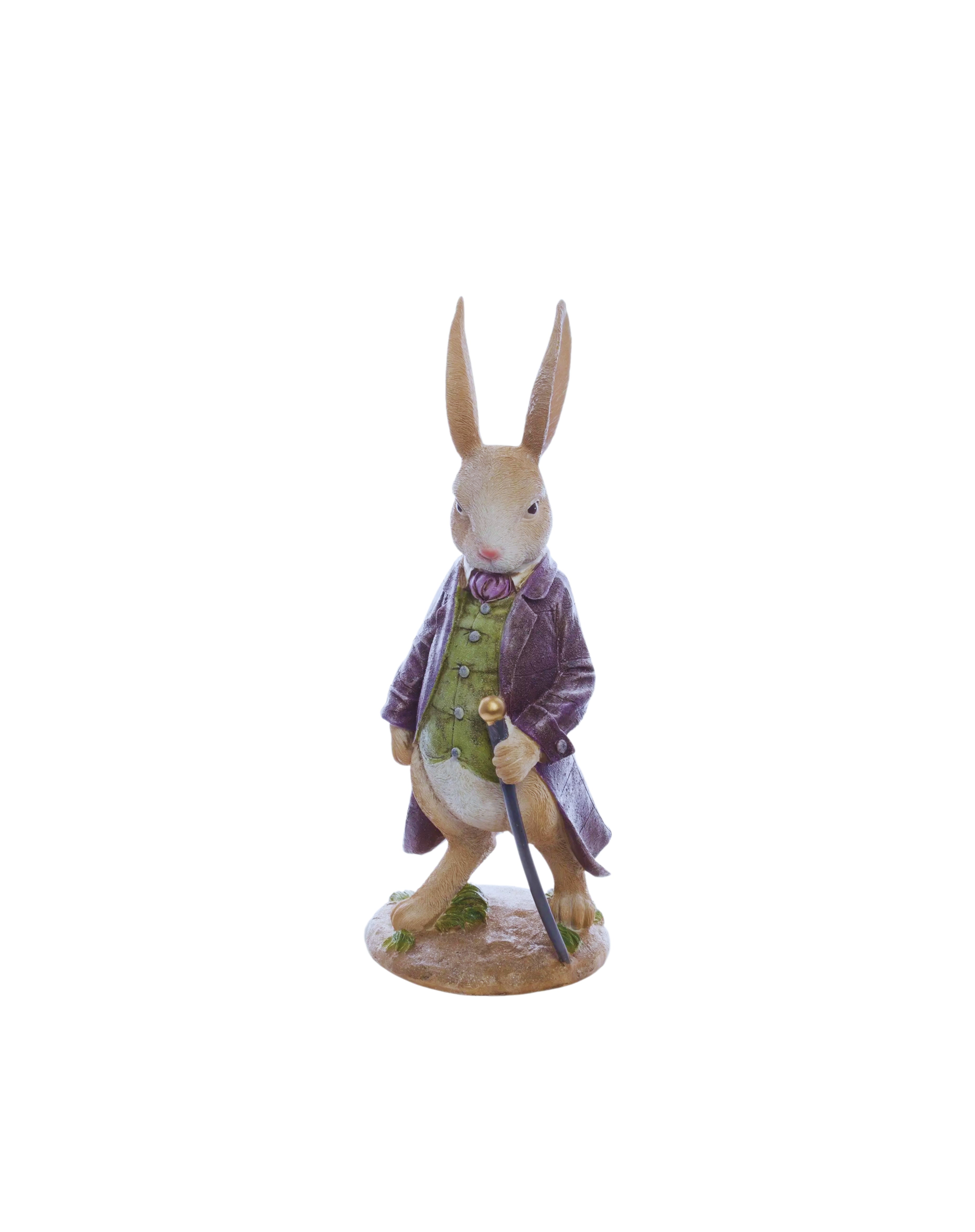 Izsmalcināta un detalizēta Lieldienu zaķa figūra, kas ienes mājās pavasarīgu noskaņu un svētku eleganci. Šis aristokrātiskais zaķis ar spieķi, žaketi un vestīti izskatās kā pasaku tēls no Lieldienu maģiskās pasaules.